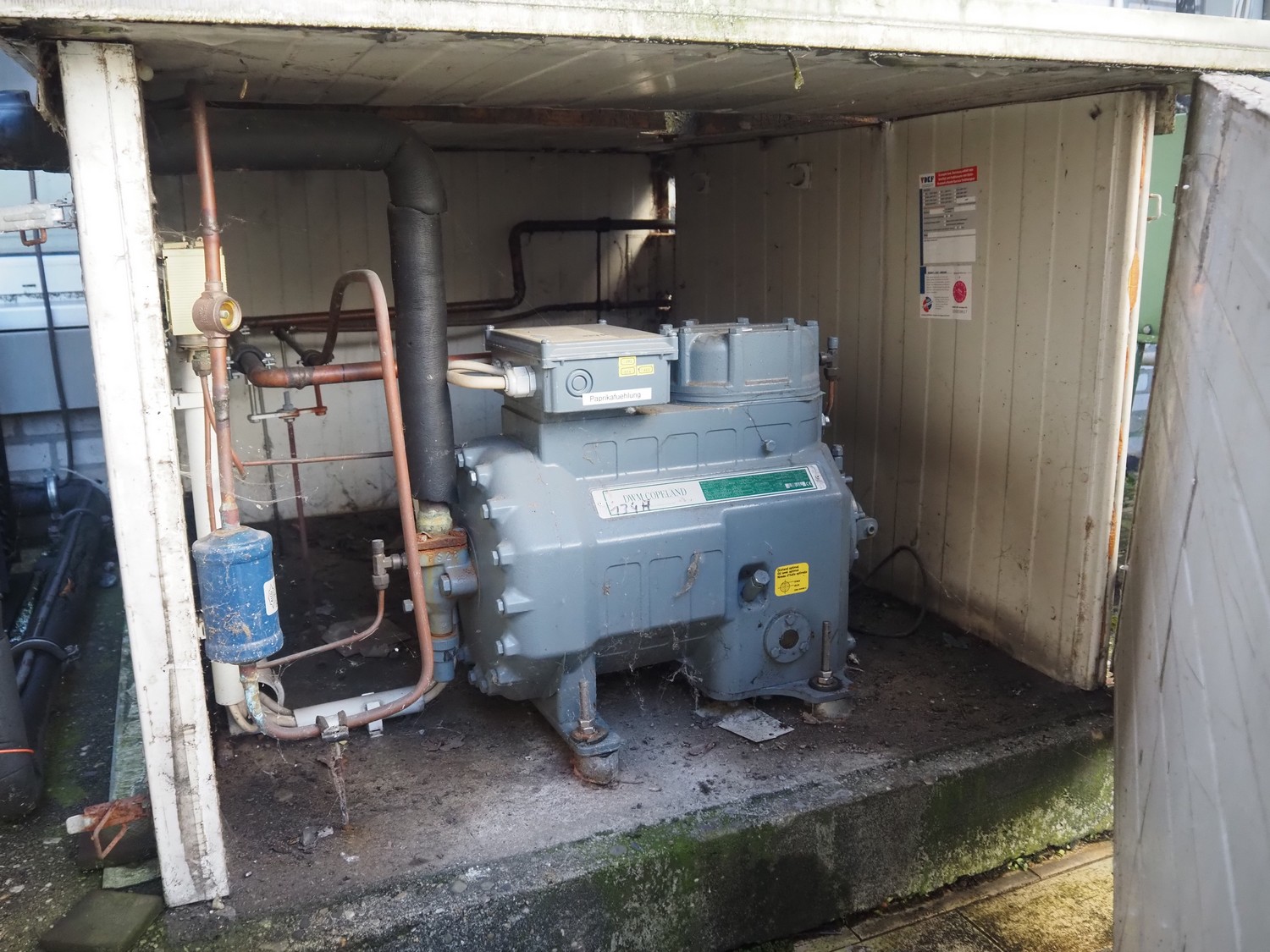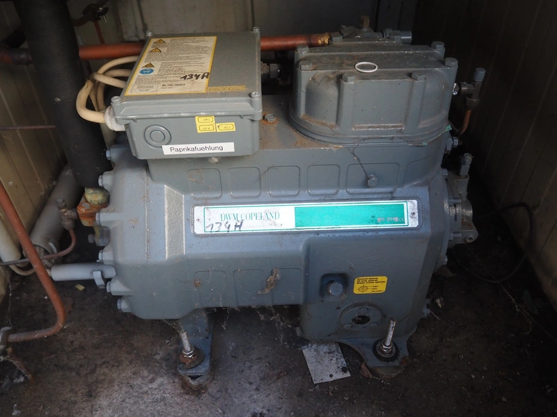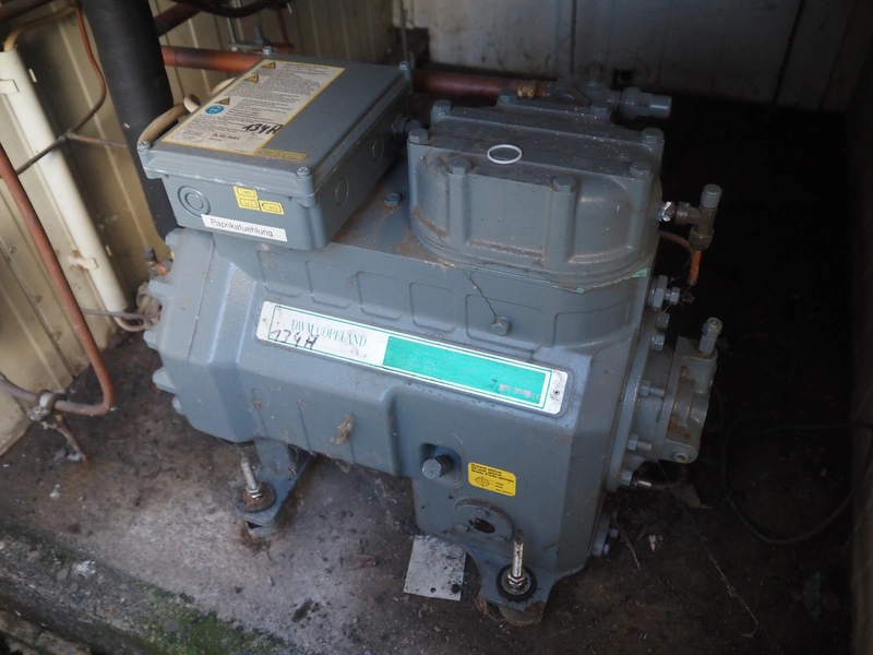 DWM Copeland cooling compressor, model: D2DL3-40X-AWM/C, serial number: 1973705, year of construction: 2002, 380/420 V, 3 Ph, 50 Hz, 50/55 A, maximum pressure: 28/22.5 bar, dimensions: 1500 mm x 1170 mm x 770 mm.