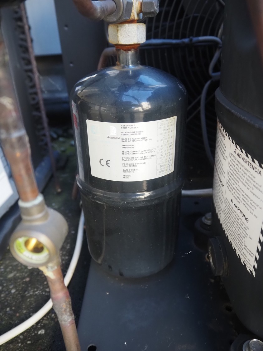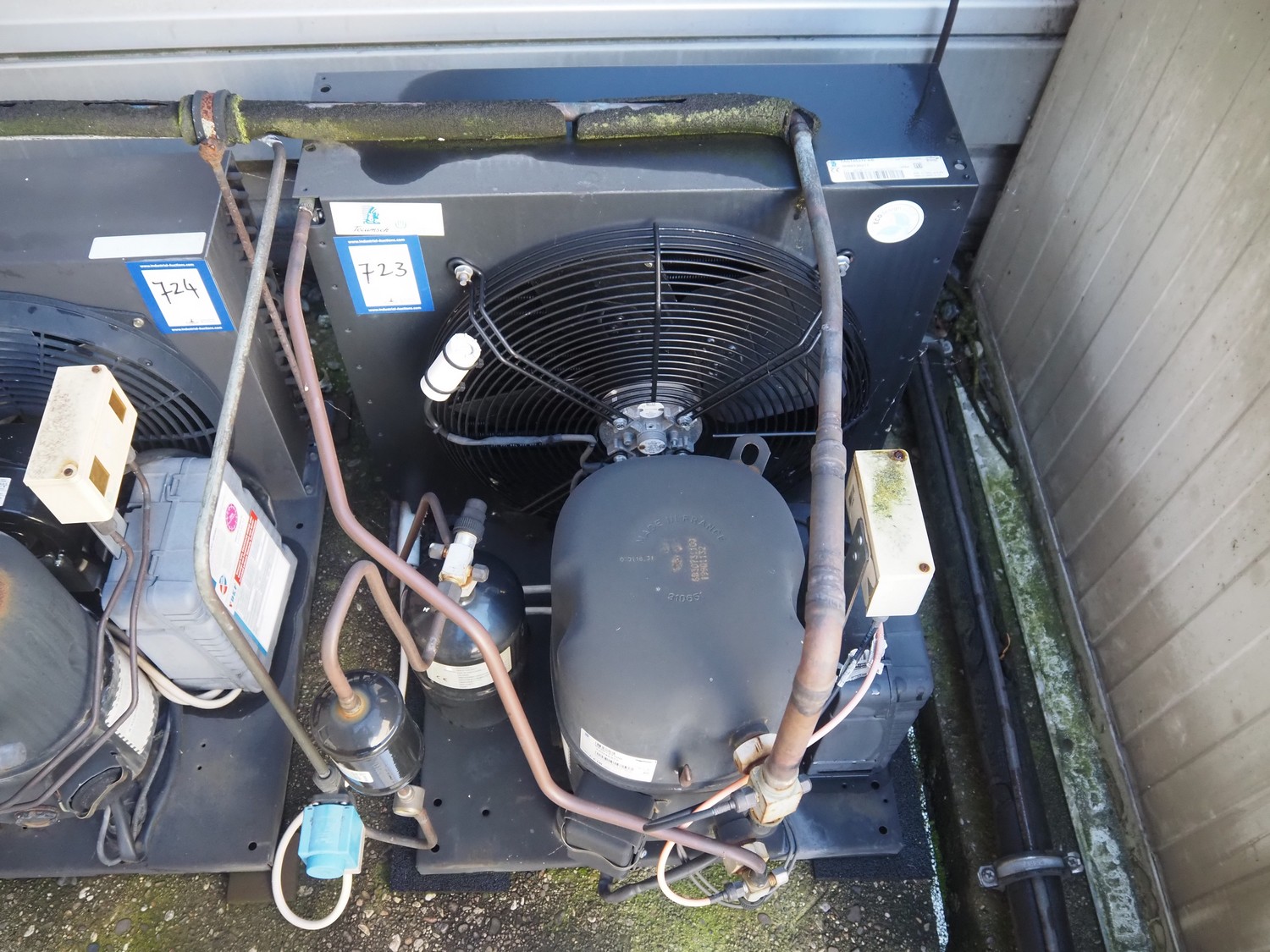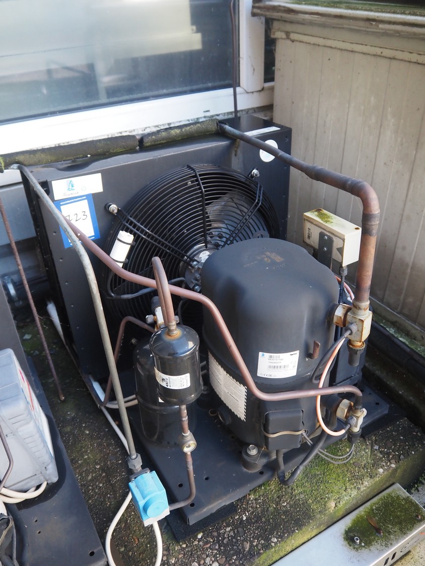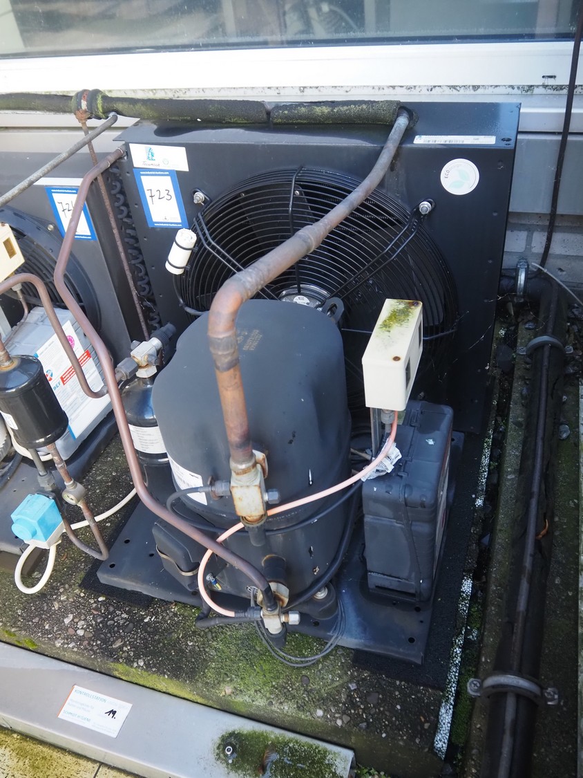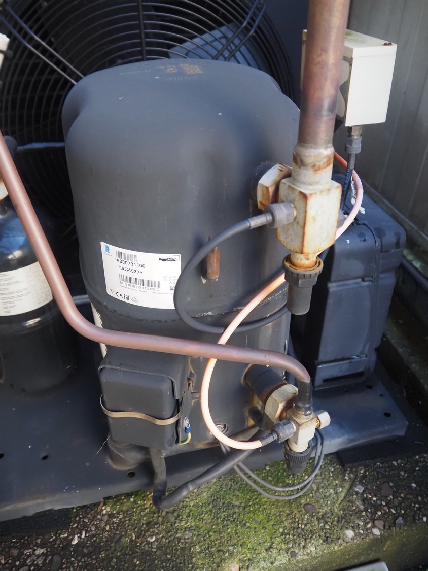 Tecumseh cooling compressor, model: TAGT4537Y HR, serial number: 18G24 141717 3H80730211, 400/440 V, 3 Ph, 50/60 Hz, 6.03/7 A, refrigerant: R-513A, dimensions: 600 mm x 600 mm x 540 mm.