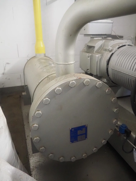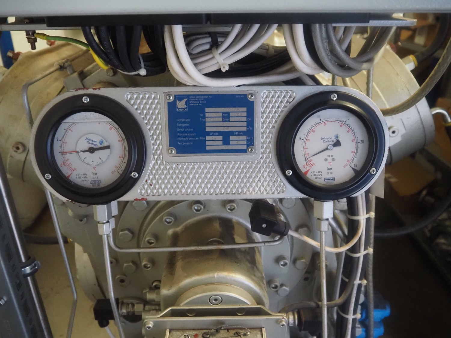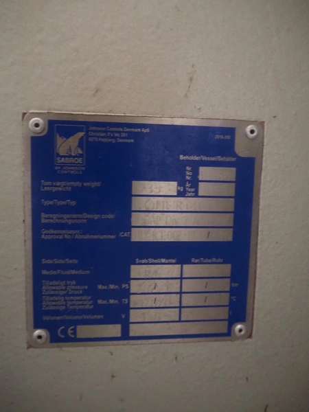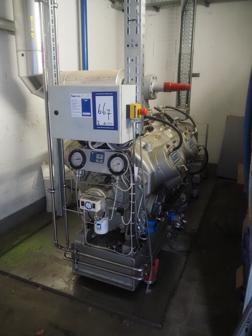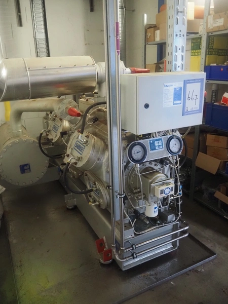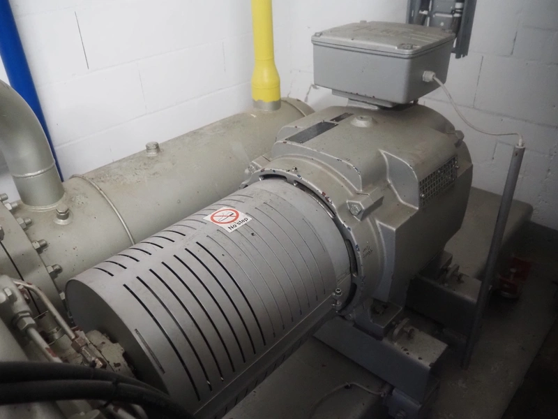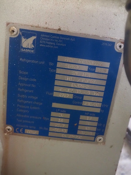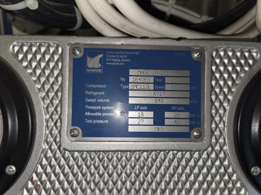 Sabroe reciprocating piston cooling compressor, type: SMC112L, number: 164069, year of construction: 2019, speed: 1500 m³ per hour, volume: 848 m³ per hour, refrigerant: R717, dimensions: 3350 mm x 1300 mm x 1520 mm. Switch cabinet, dimensions: 500 mm x 410 mm x 2180 mm.