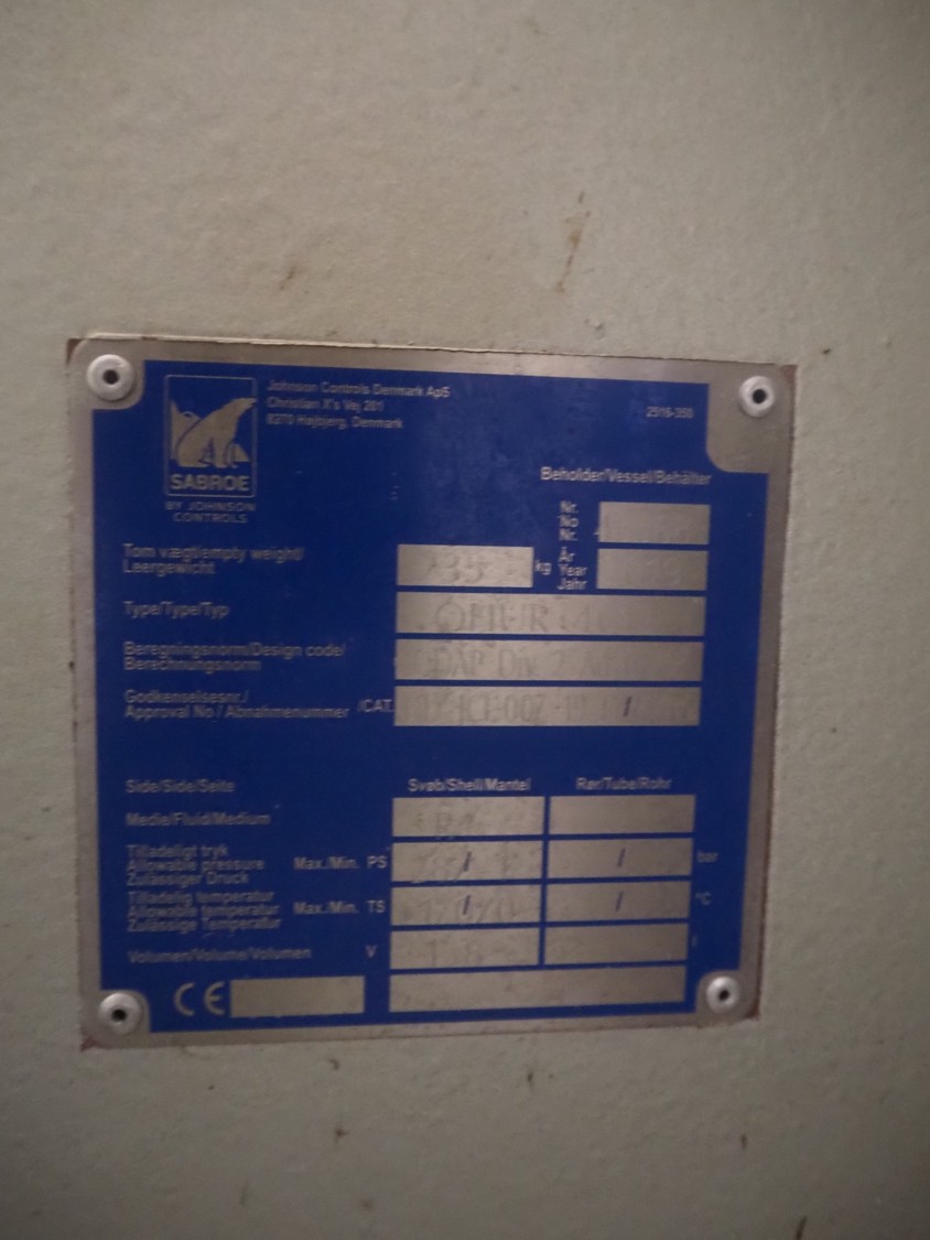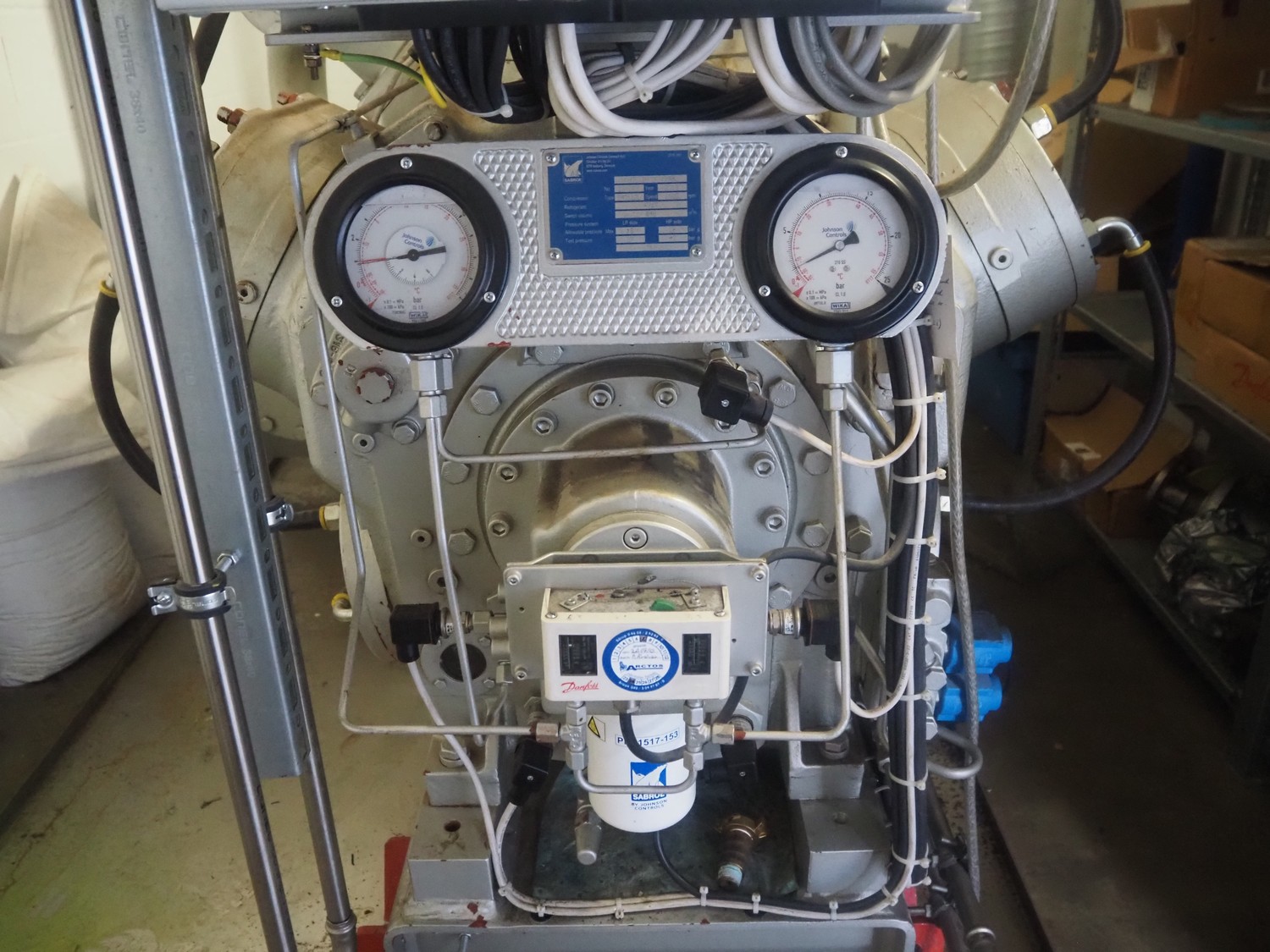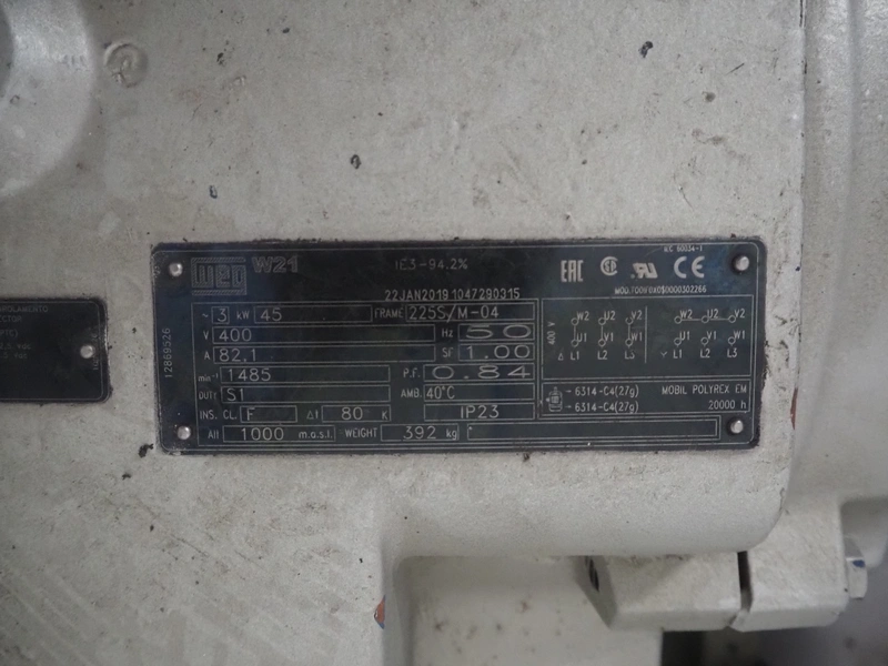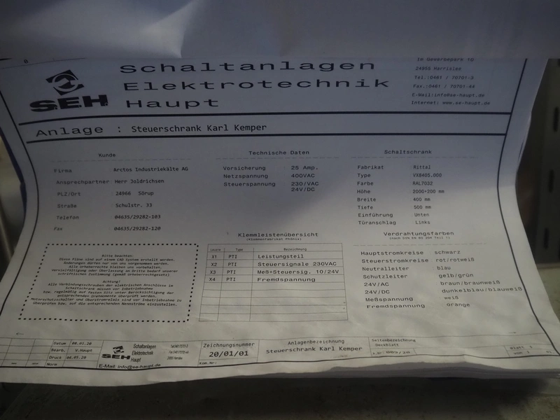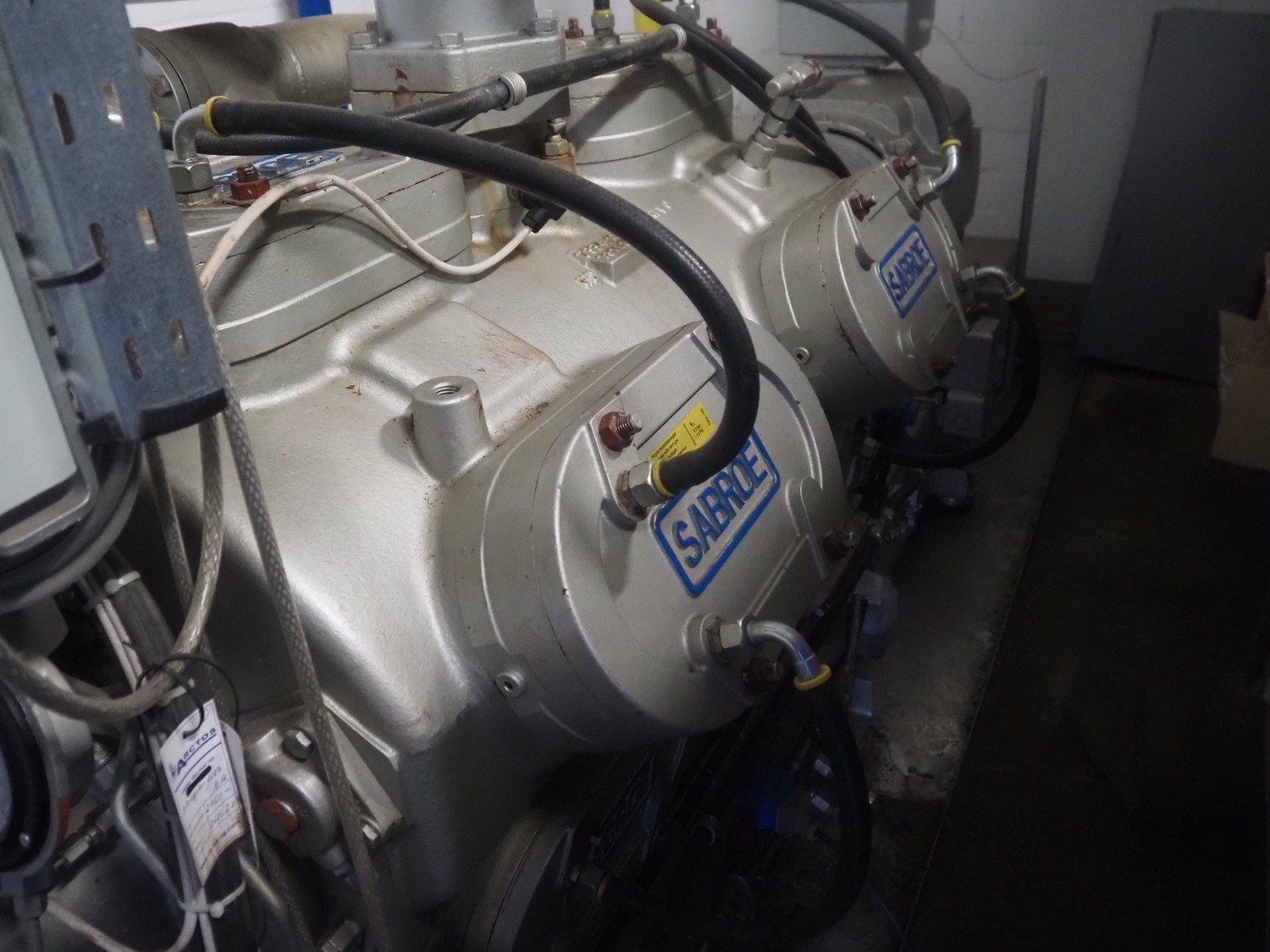 Sabroe reciprocating piston cooling compressor, type: SMC112L, number: 164069, year of construction: 2019, speed: 1500 m³ per hour, volume: 848 m³ per hour, refrigerant: R717, dimensions: 3350 mm x 1300 mm x 1520 mm. Switch cabinet, dimensions: 500 mm x 410 mm x 2180 mm.