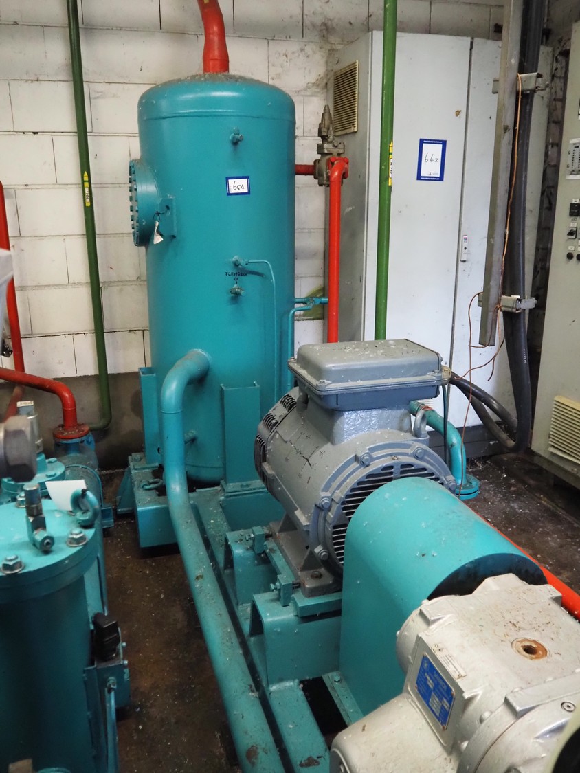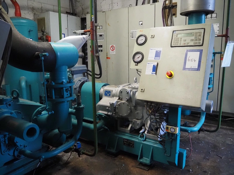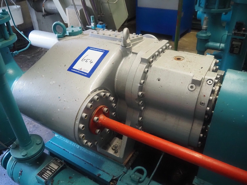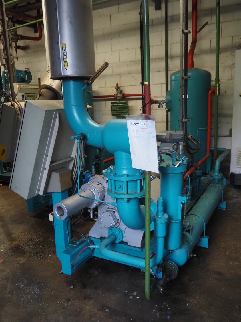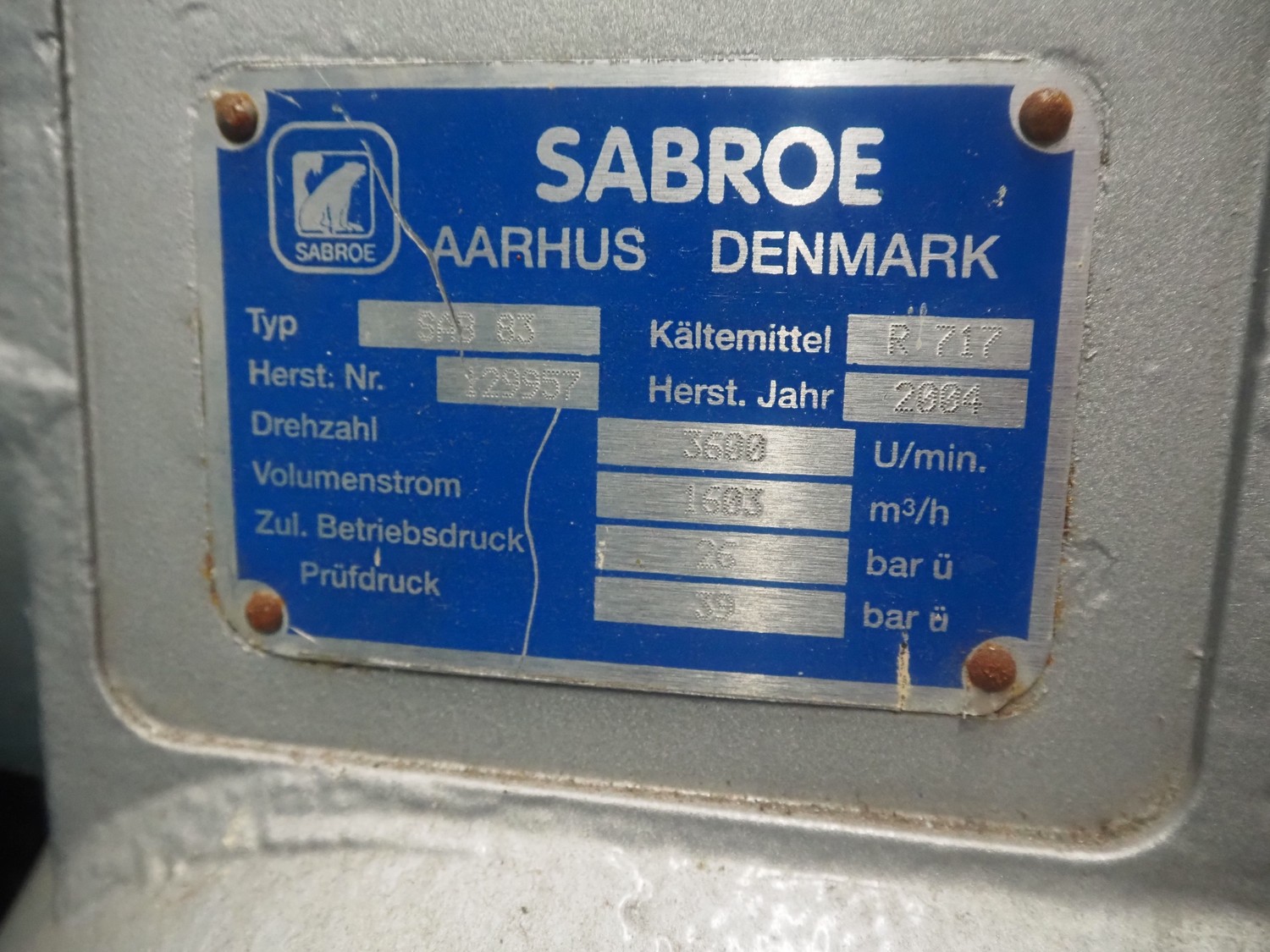 Sabroe screw cooling compressor, type: SAB 83, number: 129957, year of construction: 2004, volume: 1603 m³ per hour, refrigerant: R717 / NH3, nominal speed: 3600 U/min, dimensions: 3900 mm x 1250 mm x 2150 mm.