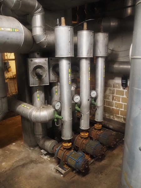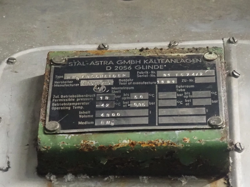 Stal-Astra GmbH insulated steel NH3 separation vessel, type: NH3 ABSCHEIDER, serial number: 91 1574/2, year of construction: 1991, volume: 4300 liter, medium: NH3, dimensions: 4100 mm x 1400 mm x 1400 mm. Including ammonia pumps.