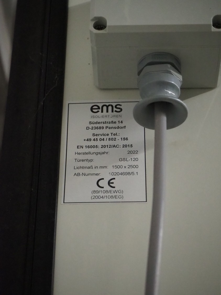 EMS refrigerated sliding door, type: GSL-120, number: 10204698/5.1, year of construction: 2022, thickness door: 120 mm, dimensions door: 1500 mm x 2500 mm, length rails: 3000 mm.