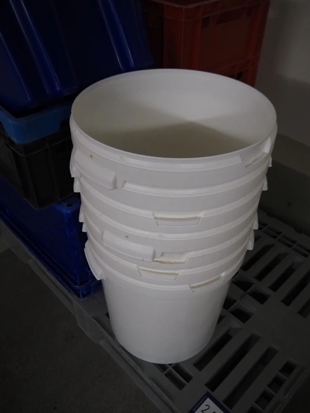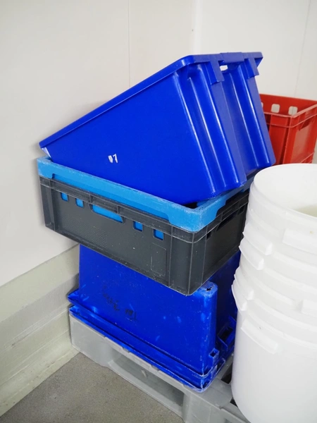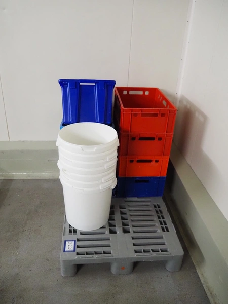 Plastic pallet with 9 plastic crates and 7 buckets, dimensions: 1200 mm x 800 mm x 1100 mm.