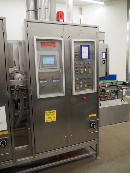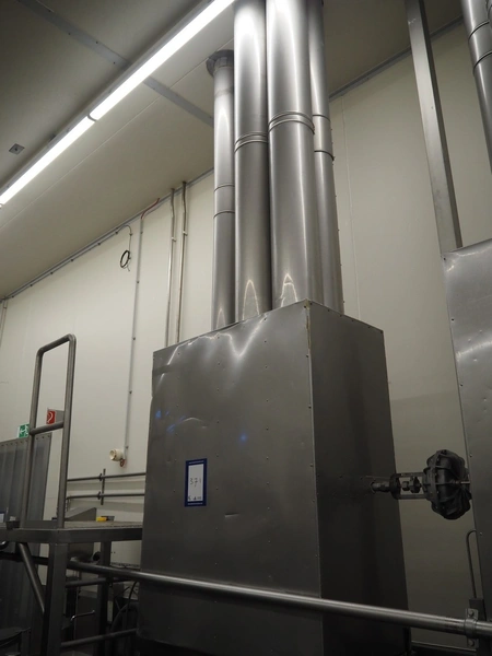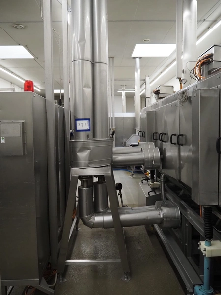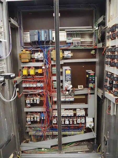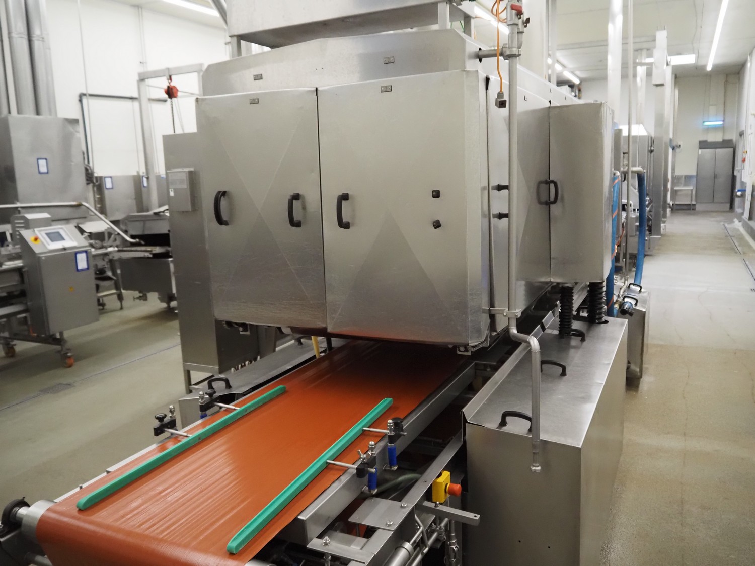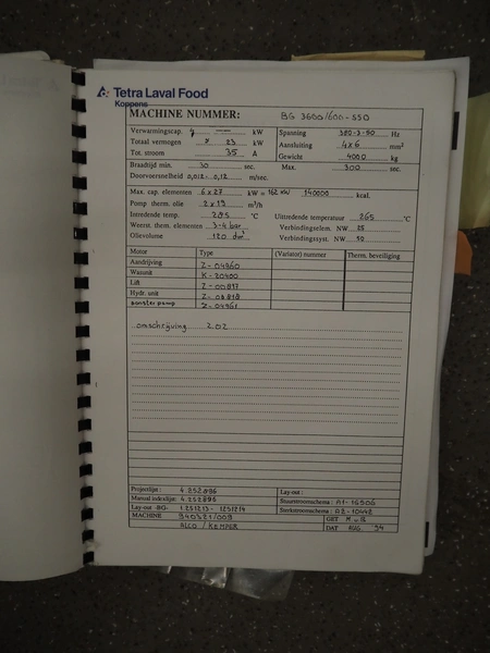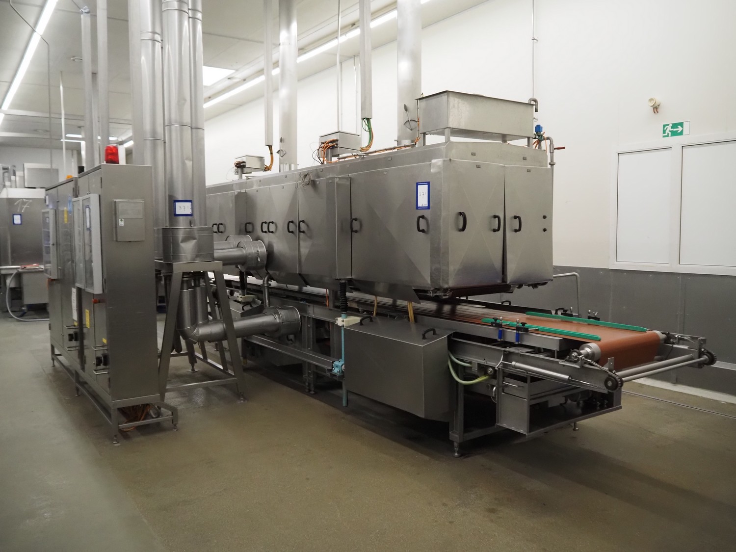 Koppens Machinefabriek B.V. teflon belt grill, type: BG 3600 / 600, machine number: 550, year of construction: 1994, 380 V, 3 Ph, 50 Hz, 48 A, 22 kW, weight: 4140 kg, maximum capacity elements: 6 x 27 kW, heating: thermic oil, oil volume: 120 dm³, teflon belt, belt width: 643 mm, total dimensions: 6600 mm x 1700 mm x 2650 mm, switch cabinet, dimensions: 1070 mm x 450 mm x 2100 mm, valve station, dimensions: 1600 mm x 900 mm x 3000 mm, thermic oil station with Allweiler thermic oil pump, type: NBT 32-200, dimensions: 1300 mm x 800 mm x 2700 mm.
