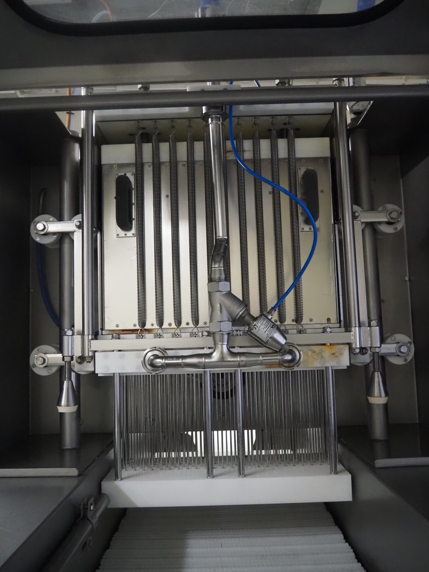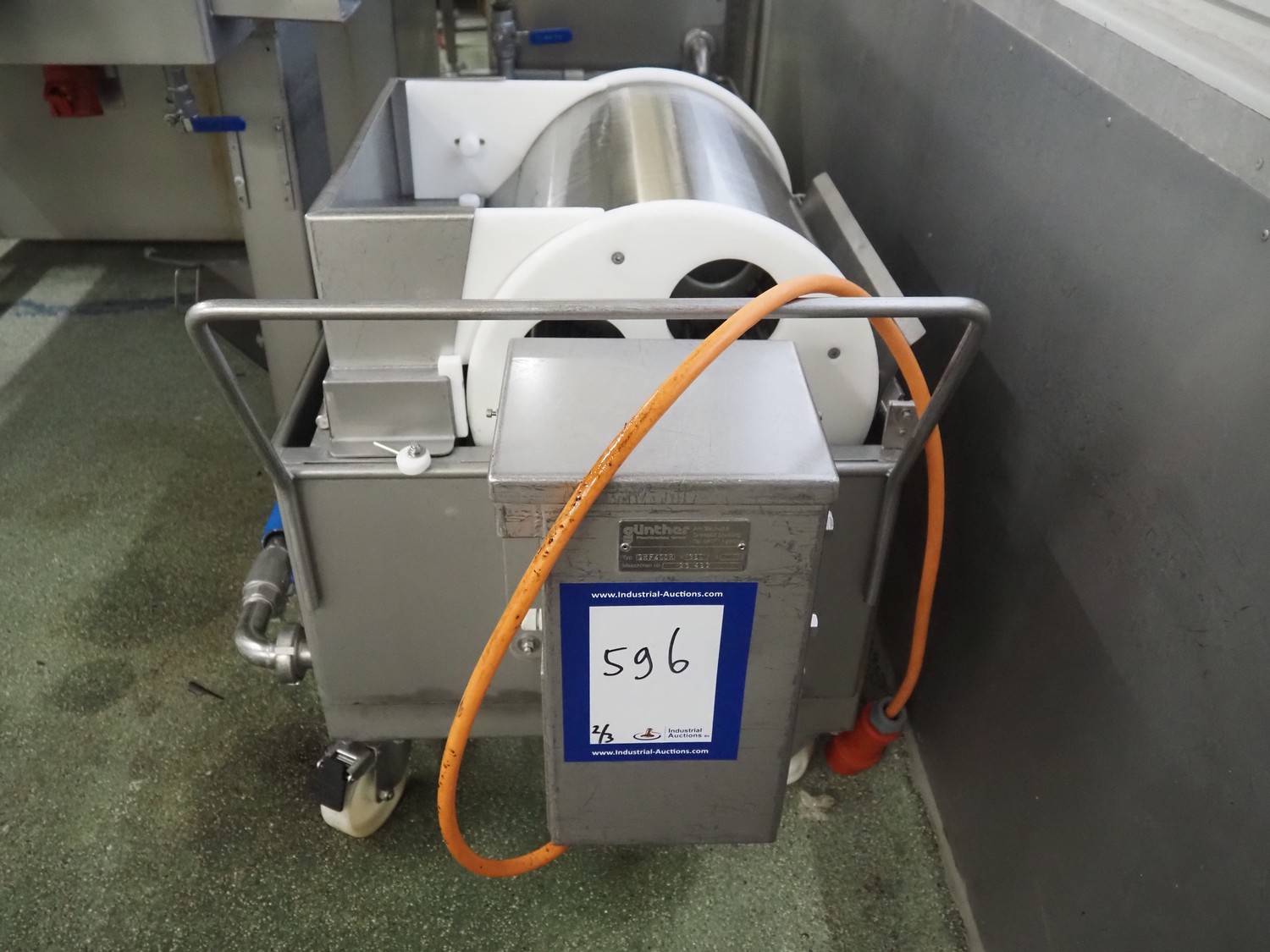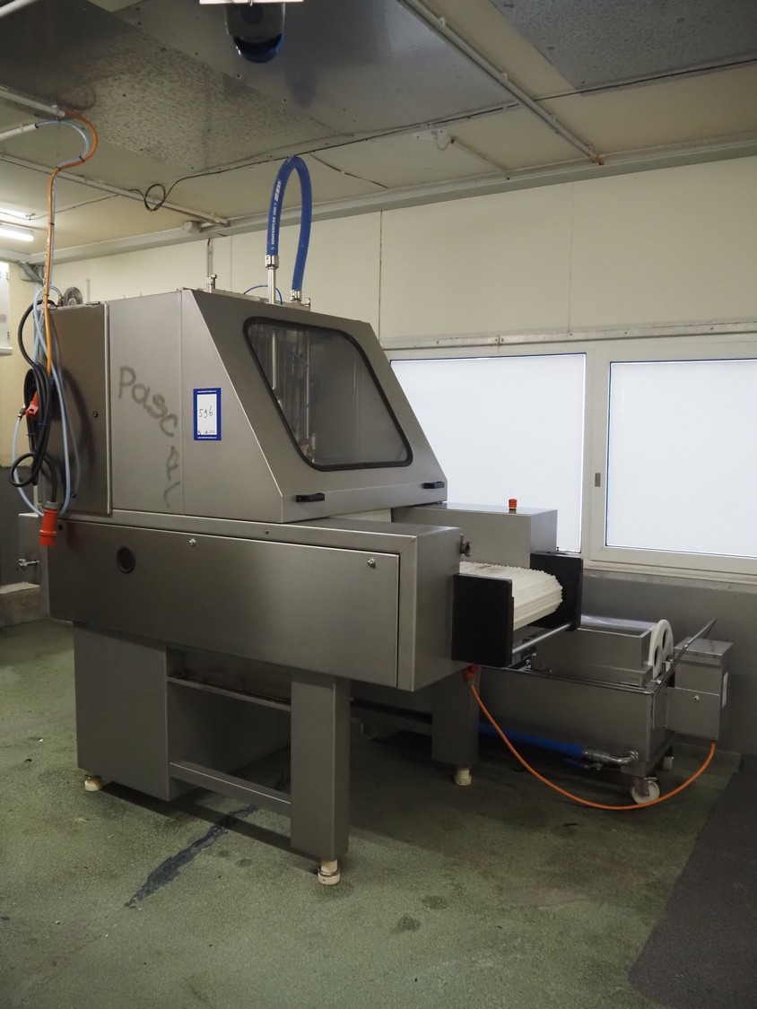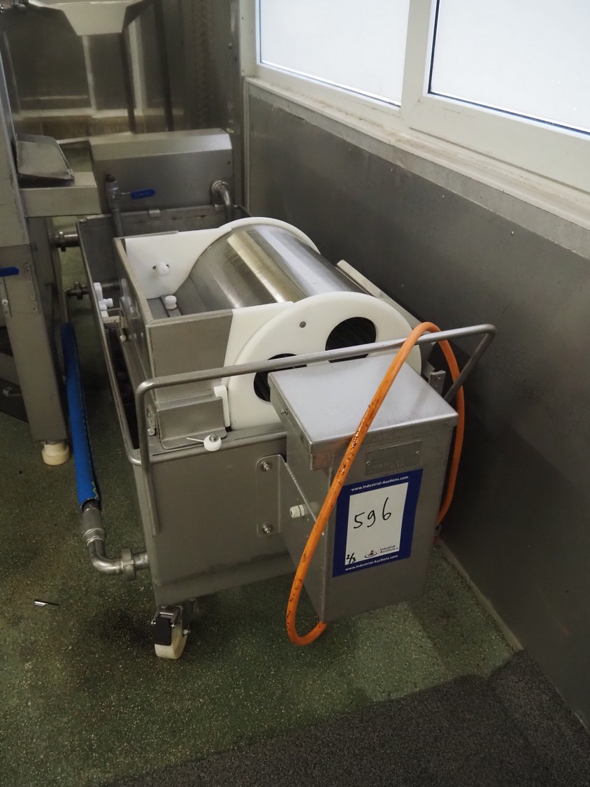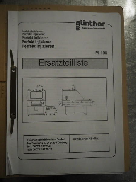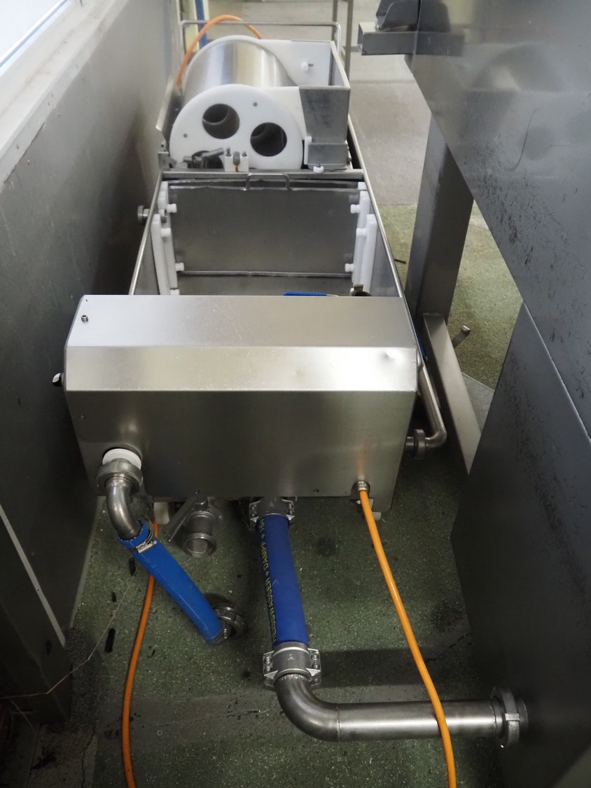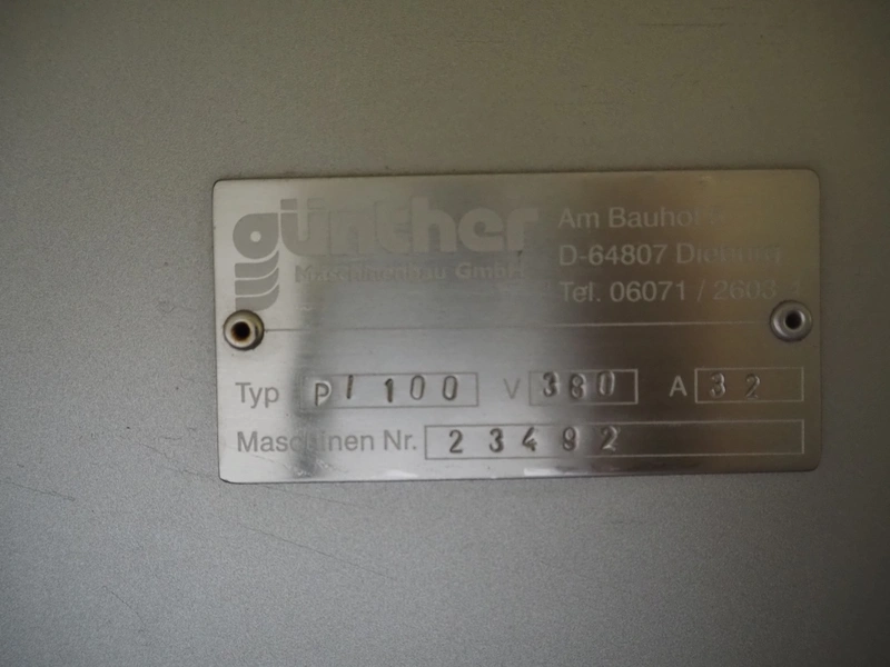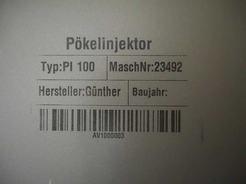 Günther Maschinenbau GmbH injector, type: PI 100, machine number: 23492, 380 V, 32 A, 100 needles, plastic mesh belt, belt width: 580 mm, clearance: 600 mm x 210 mm, total dimensions: 2450 mm x 1350 mm x 2200 mm. Including Günther Maschinenbau GmbH filter tub, type: GRF 400R, machine number: 23 492, 380 V, dimensions filter tub: 2100 mm x 700 mm x 770 mm and s/s trolley with parts, dimensions trolley: 1040 mm x 550 mm x 1930 mm.