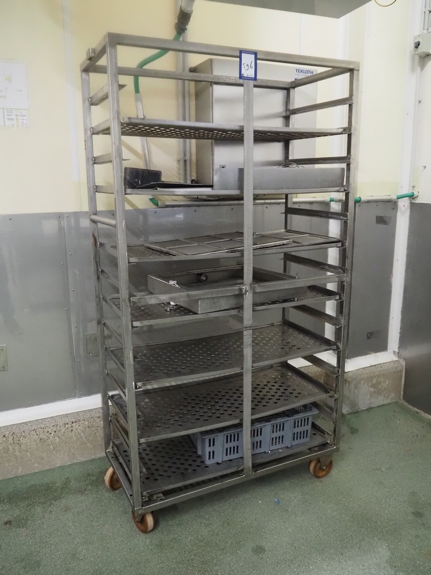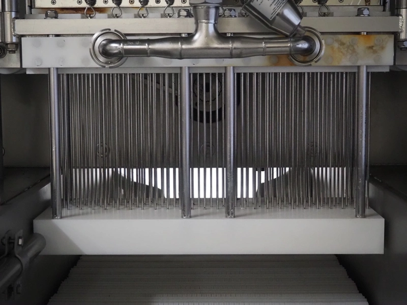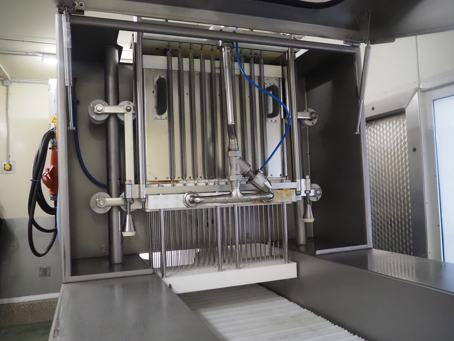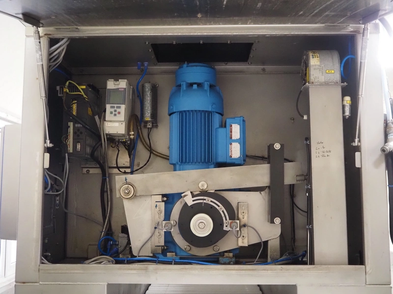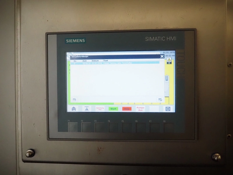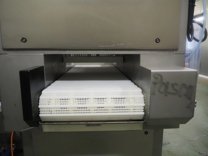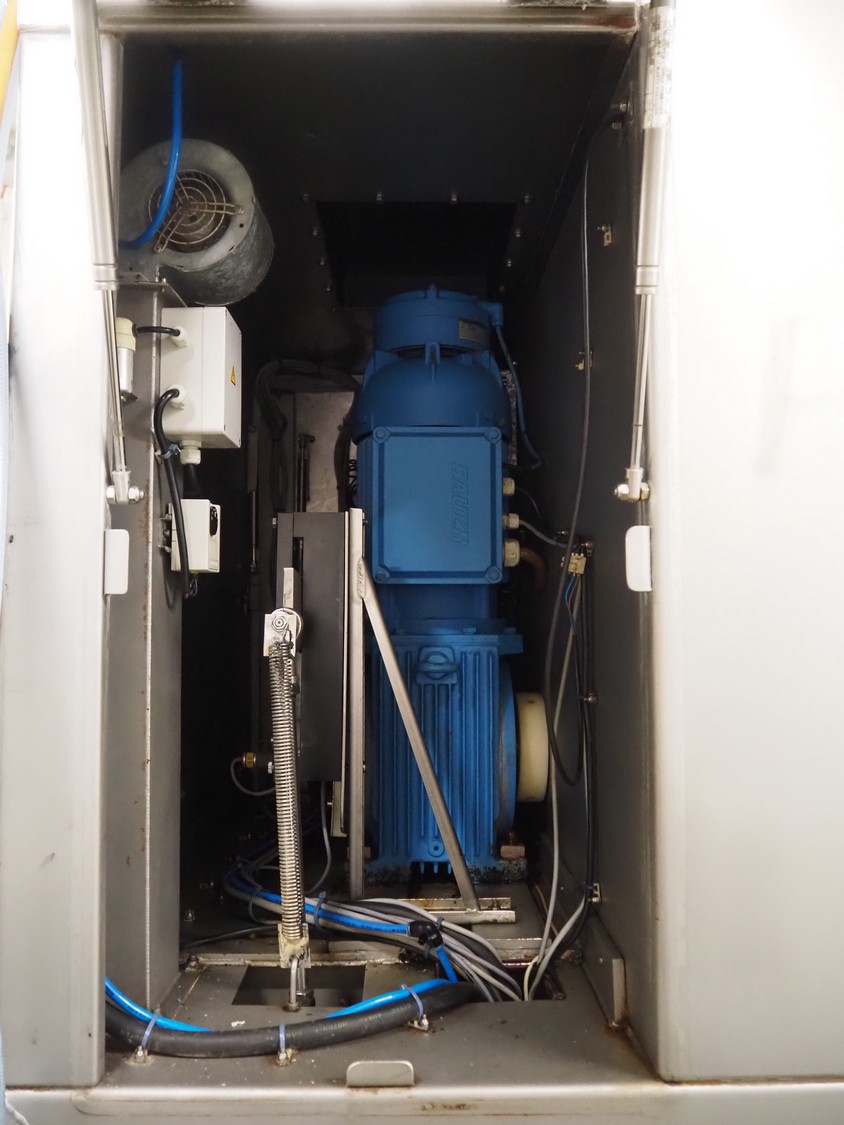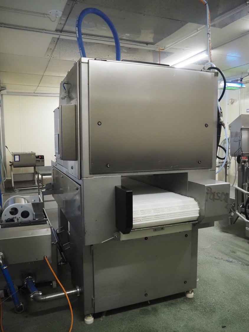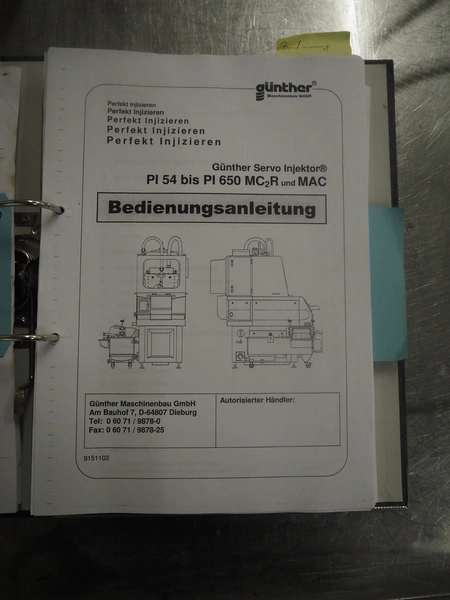 Günther Maschinenbau GmbH injector, type: PI 100, machine number: 23492, 380 V, 32 A, 100 needles, plastic mesh belt, belt width: 580 mm, clearance: 600 mm x 210 mm, total dimensions: 2450 mm x 1350 mm x 2200 mm. Including Günther Maschinenbau GmbH filter tub, type: GRF 400R, machine number: 23 492, 380 V, dimensions filter tub: 2100 mm x 700 mm x 770 mm and s/s trolley with parts, dimensions trolley: 1040 mm x 550 mm x 1930 mm.