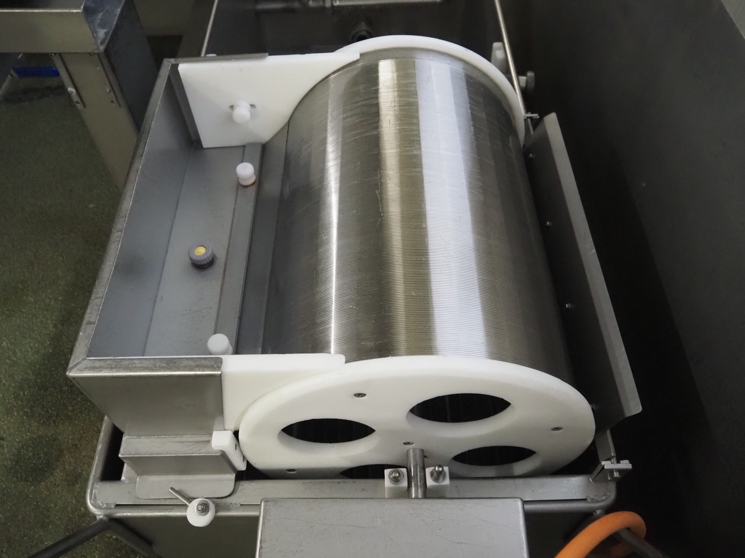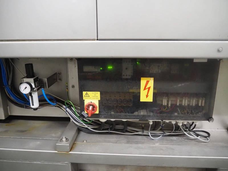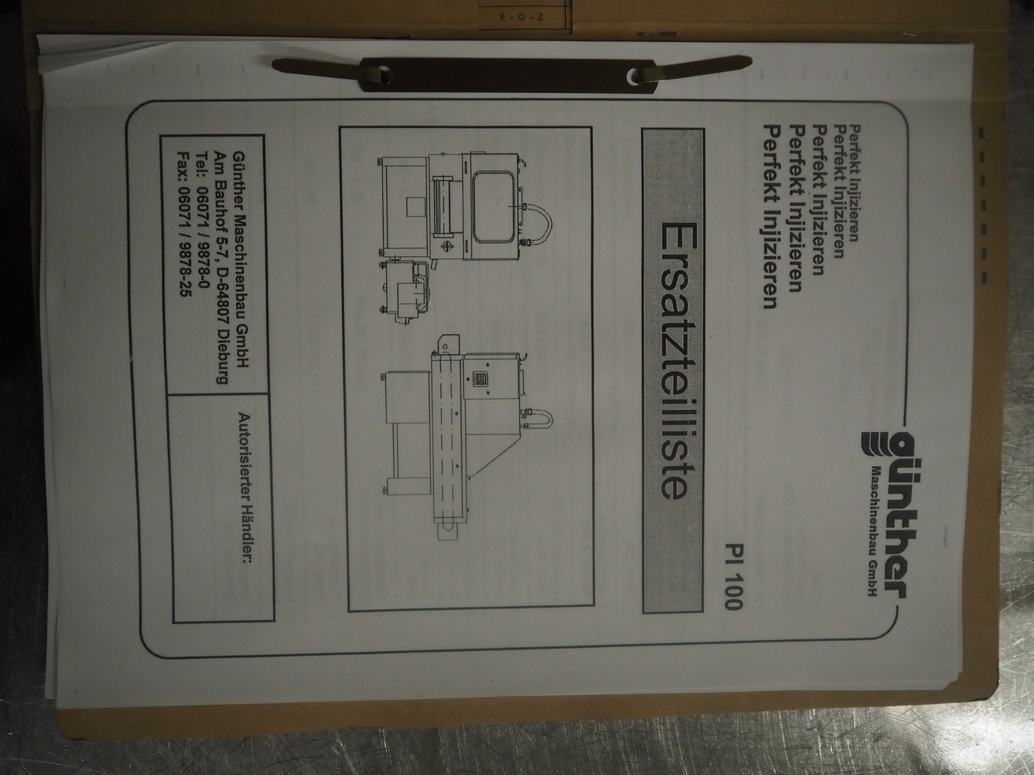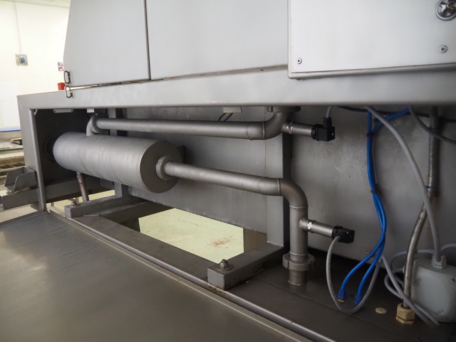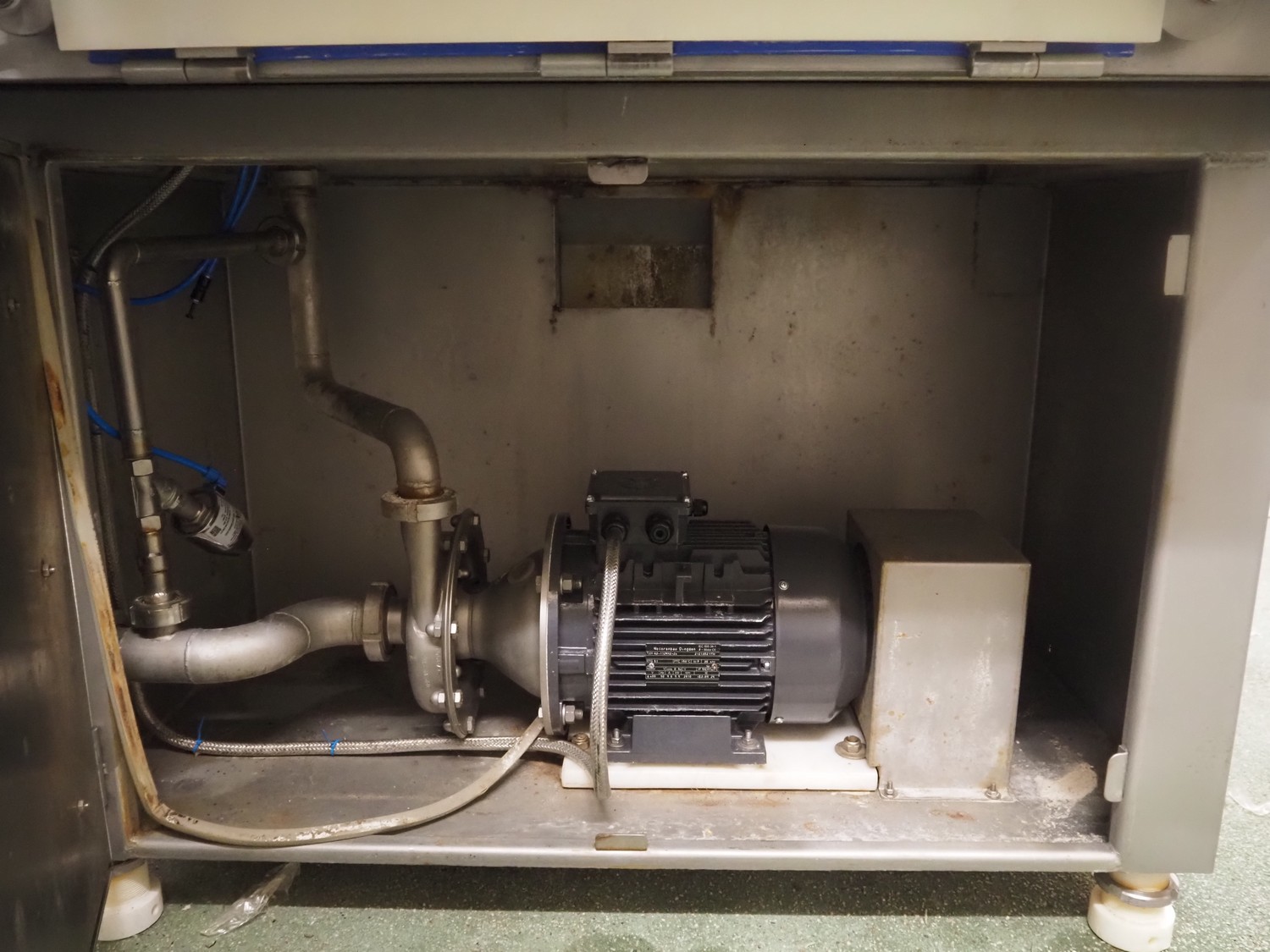 Günther Maschinenbau GmbH injector, type: PI 100, machine number: 23492, 380 V, 32 A, 100 needles, plastic mesh belt, belt width: 580 mm, clearance: 600 mm x 210 mm, total dimensions: 2450 mm x 1350 mm x 2200 mm. Including Günther Maschinenbau GmbH filter tub, type: GRF 400R, machine number: 23 492, 380 V, dimensions filter tub: 2100 mm x 700 mm x 770 mm and s/s trolley with parts, dimensions trolley: 1040 mm x 550 mm x 1930 mm.