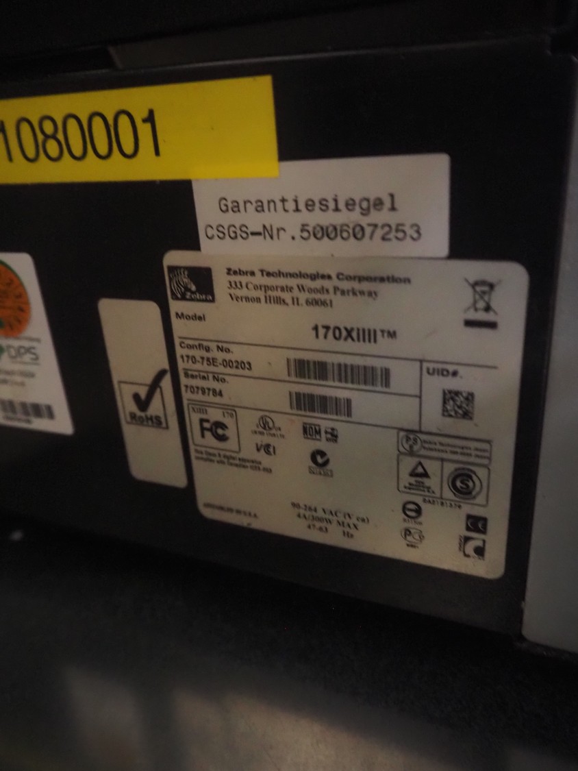 Zebra label printer, model: 170XIIIItm, serial number: 7079784, dimensions: 600 mm x 300 mm x 400 mm.