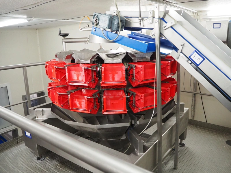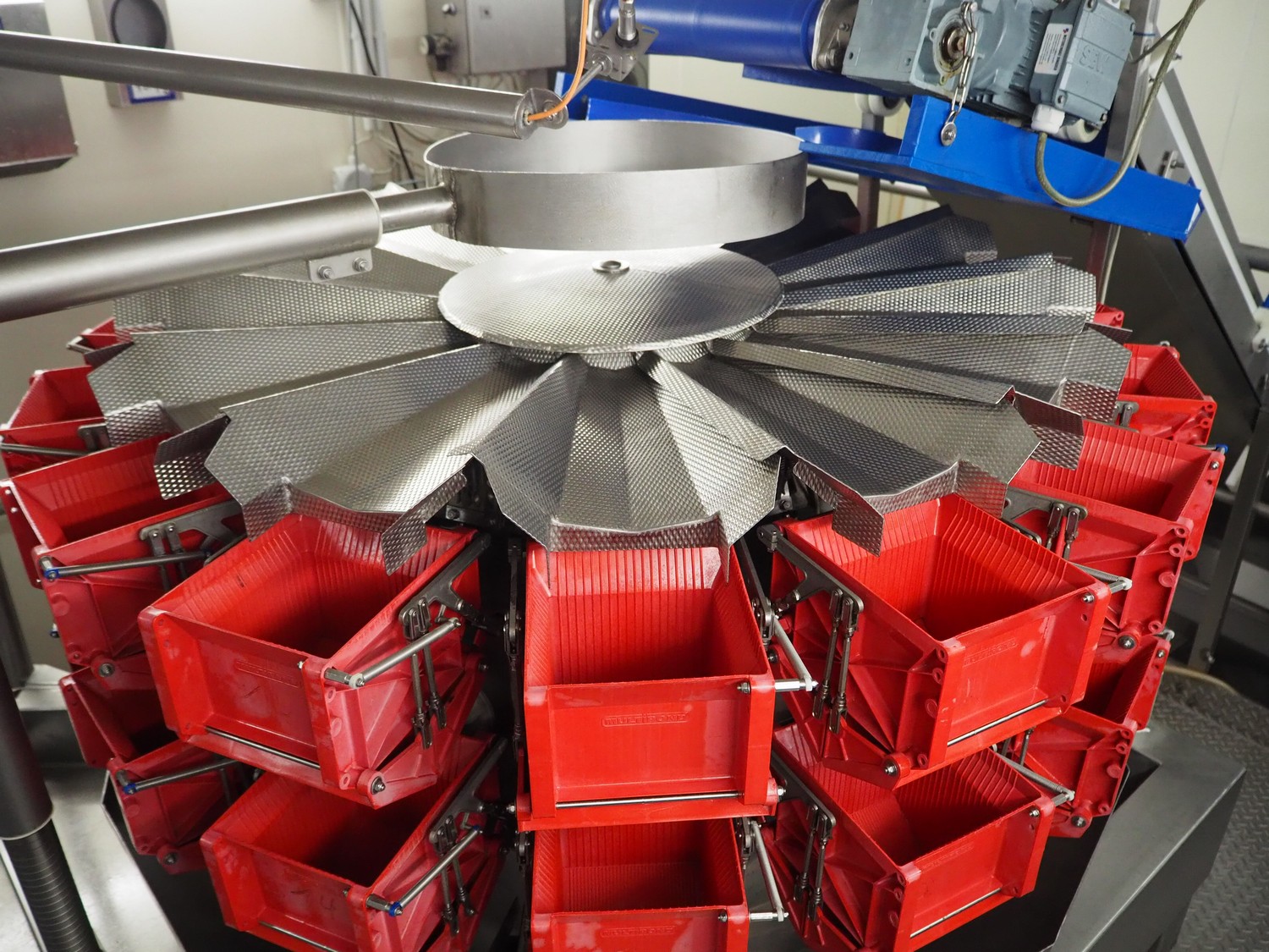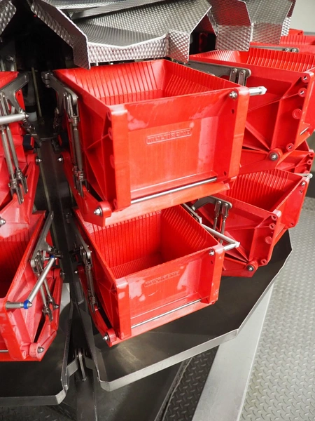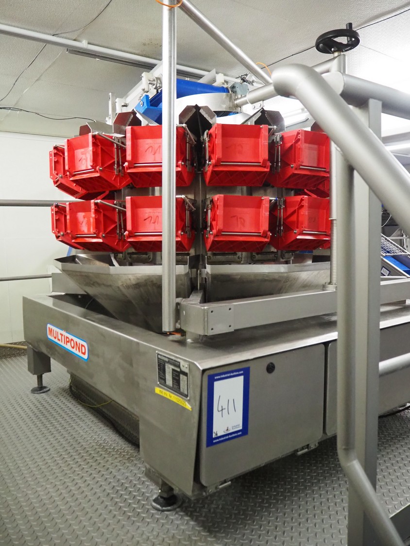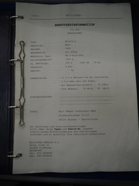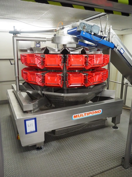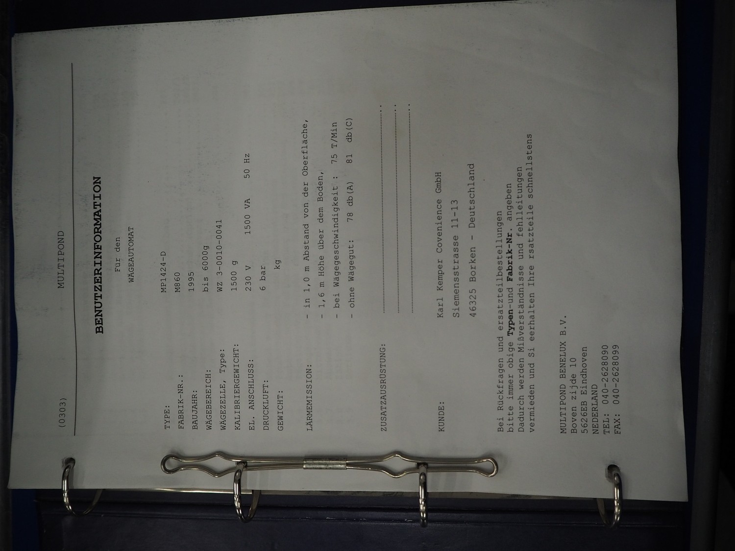 Multipond 14-heads multihead weigher, type: MP 1424-D, serial number: M: 860, year of construction: 1995, 230 V, 50 Hz, basket: 220 mm x 180 mm x 200 mm, maximum weighing capacity total: N x 6000 gram, maximum weighing capacity single: 2500 gram, e-total = 2 gram, total dimensions: 1670 mm x 1450 mm x 1700 mm.