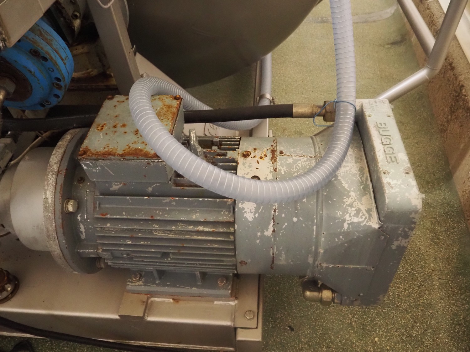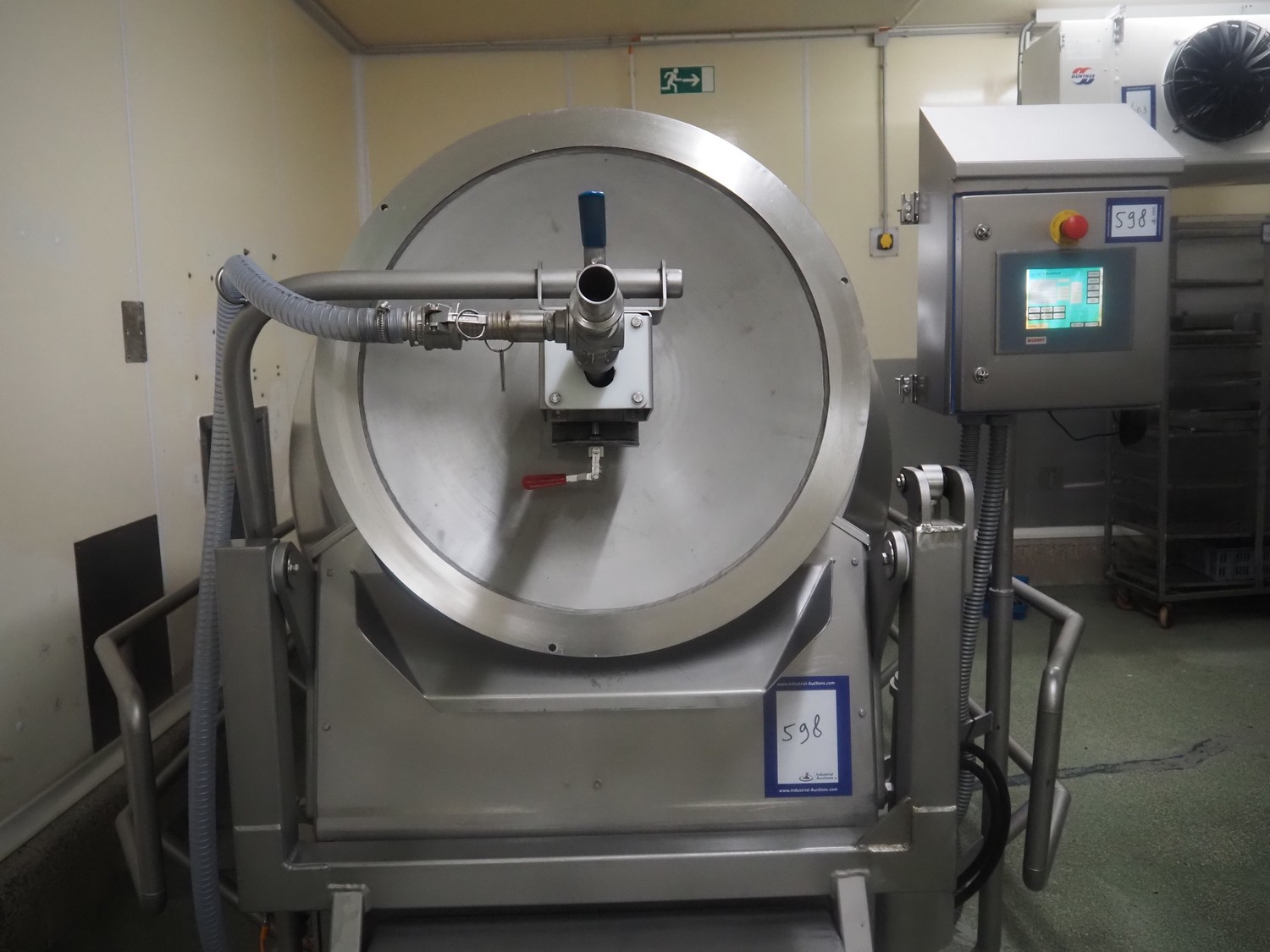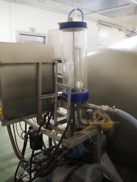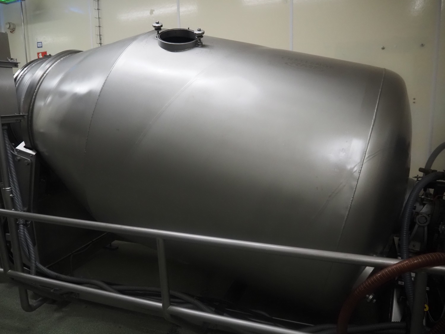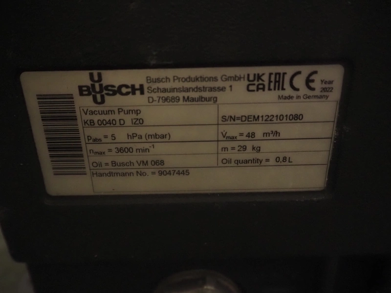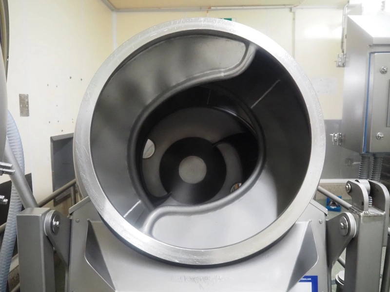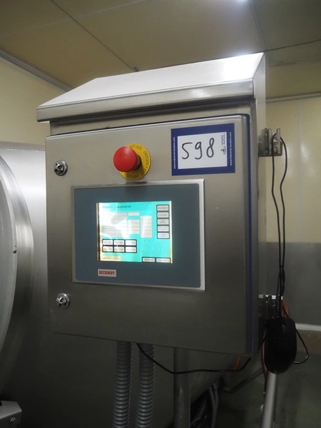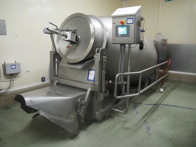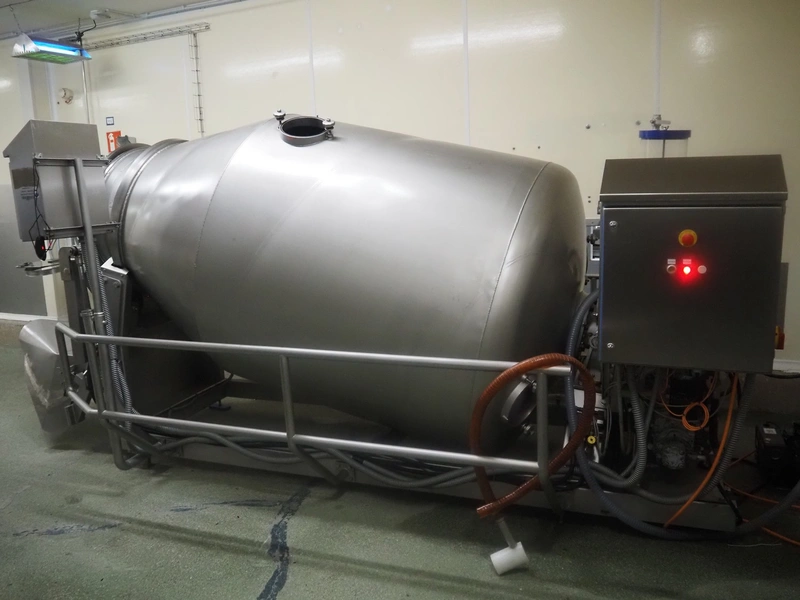 Challenge RMF vacuum tumbler with lifter for 200 liter meat bins, type: MM-2/LD-2, machine number: 5092, year of construction: 1995, dimensions drum: Ø 1300 mm x 2700 mm, Busch vacuum pump, model: KB 0040 D, year of construction: 2022, capacity: 40 m³ per hour, total dimensions: 4000 mm x 2050 mm x 1950 mm.