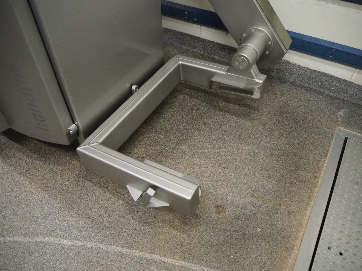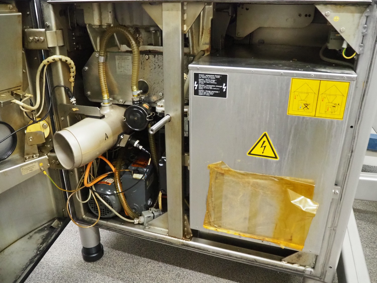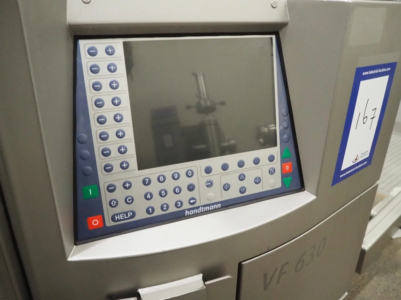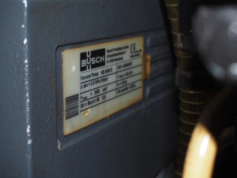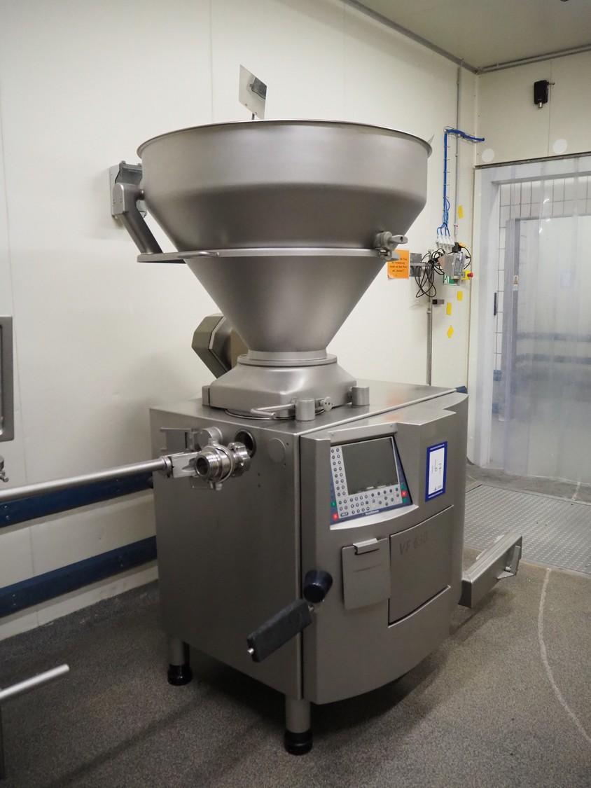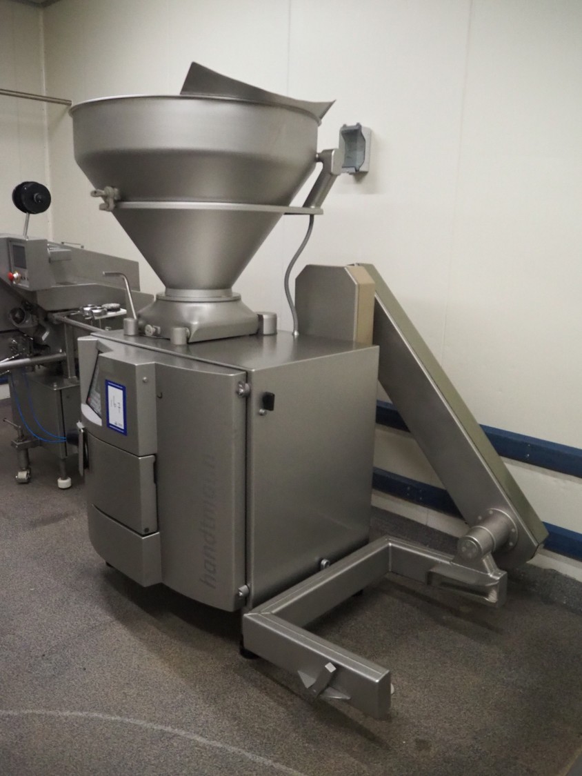Handtmann vacuum filling machine with lifter for 200 liter meat bins, type: VF630, number: 32639, year of construction: 2013, 400 V, 3 Ph, 50 Hz, 18.0 A, 12.5 kW, Busch vacuum pump, type: KB 0040 D, serial number: 03040978, capacity: 48 m³ per hour, dimensions: 2000 mm x 1400 mm x 2200 mm.