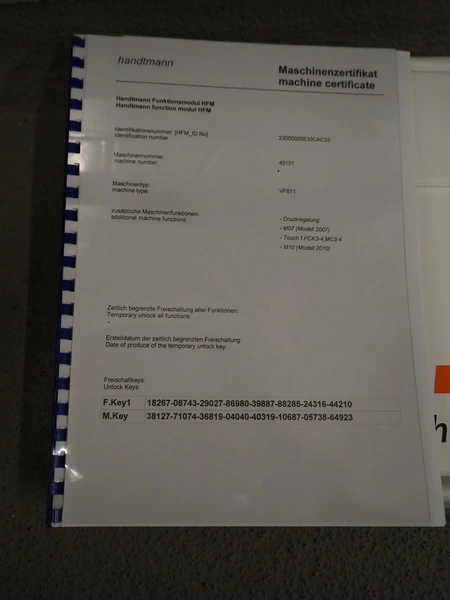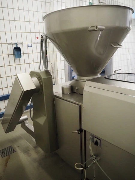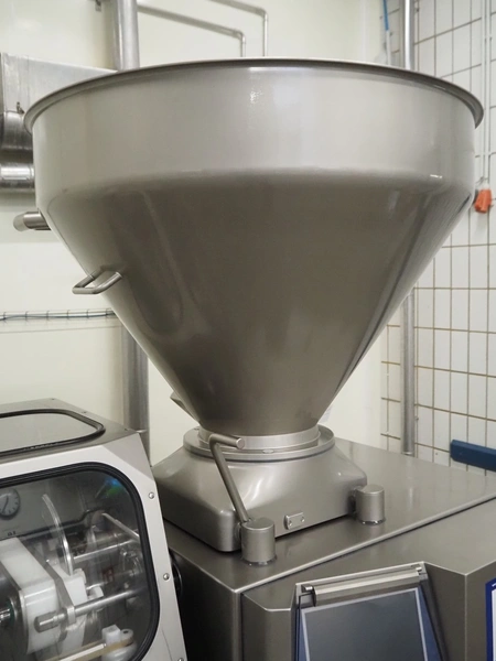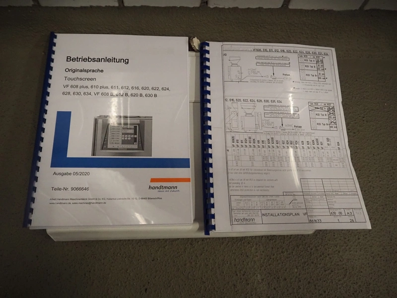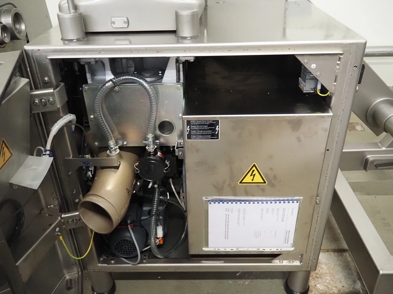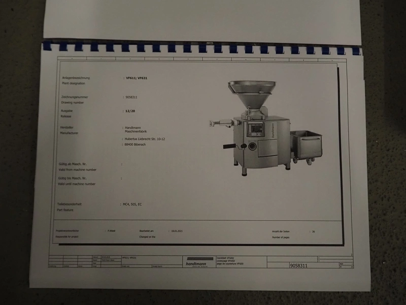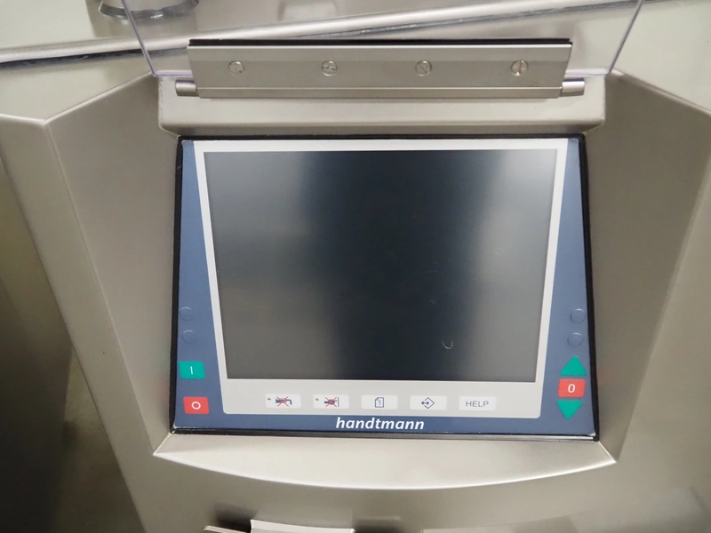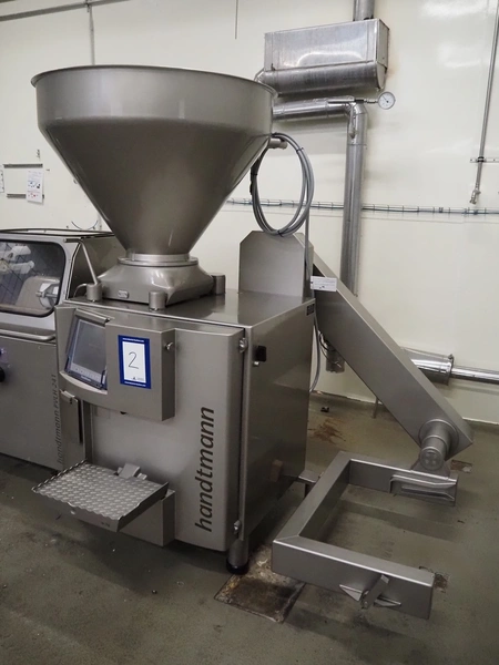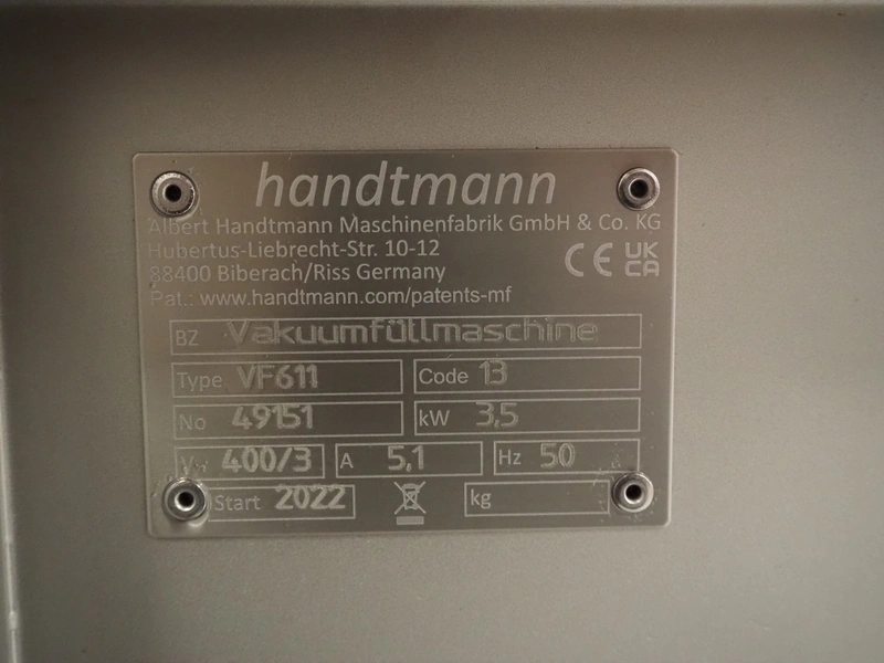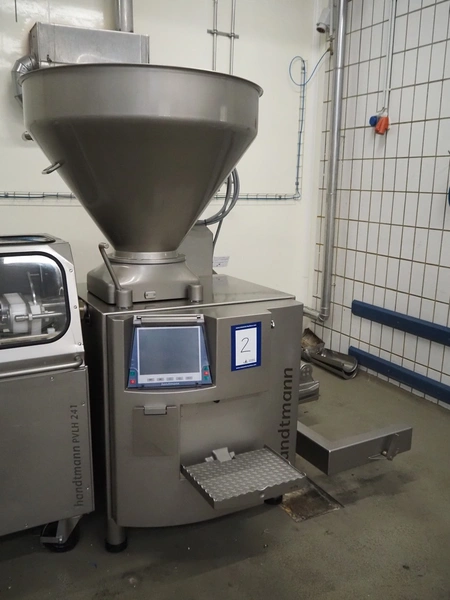 Handtmann vacuum filling machine with lifter for 200 liter meat bins, type: VF611, serial number: 49151, year of construction: 2022, 400 V, 3 Ph, 50 Hz, 5.1 A, 3.5 kW, built-in Busch vacuum pump, dimensions: 1800 mm x 1400 mm x 2000 mm. Including carton box with various parts.