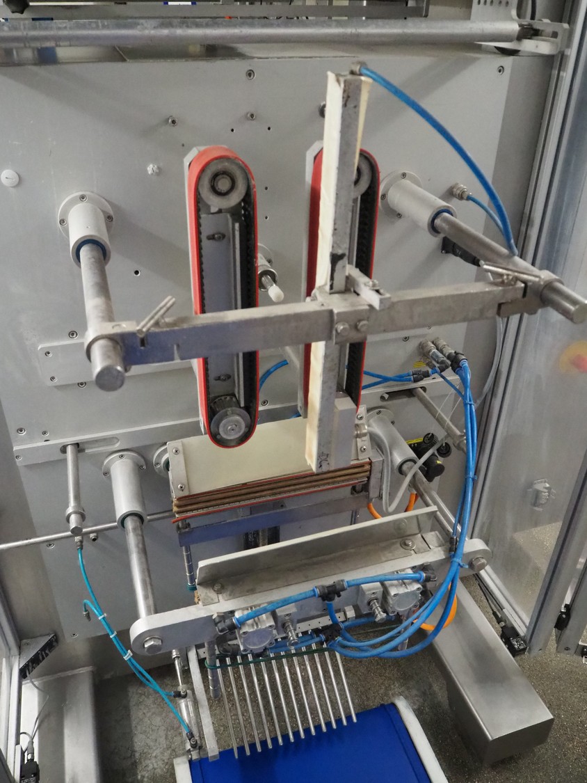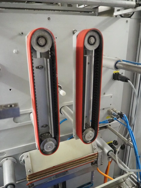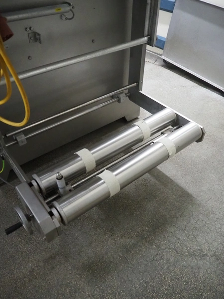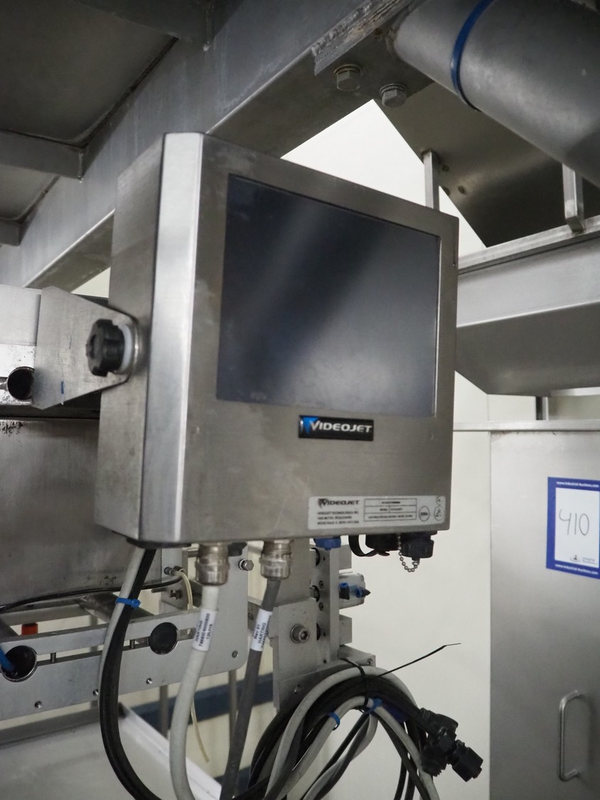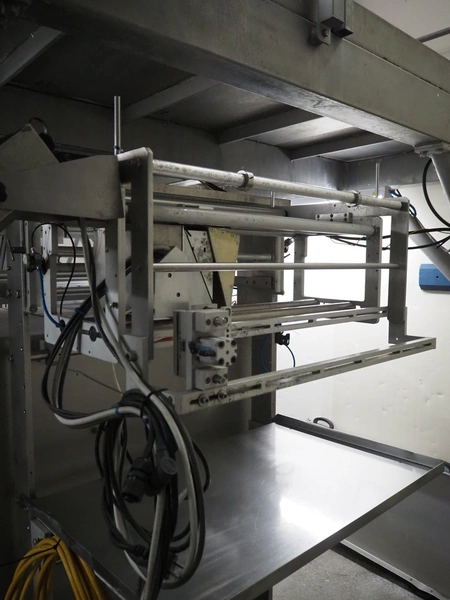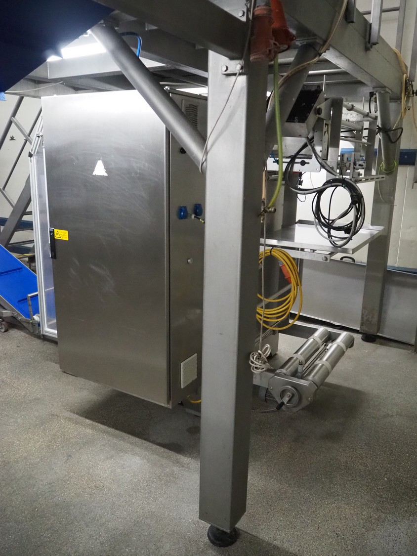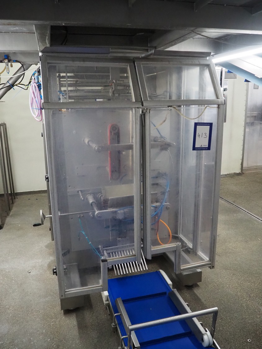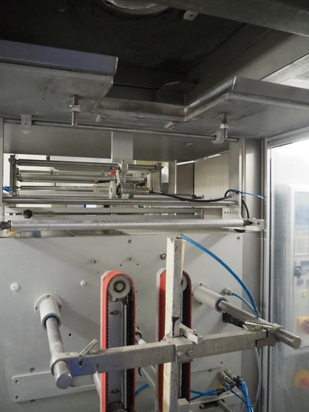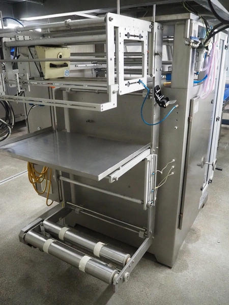 Kopas Verpackungsmaschinen GmbH vertical bag form-, fill-, and seal machine, type: JK 360 FM, machine number: 265, year of construction: 11/2005, 400 V, 3 Ph, 50 Hz, 11.5 kW, vertical seal length: 500 mm, horizontal seal length: 380 mm, film width: 780 mm, VideoJet barcode printer, model: 8.4 CLARITY, total dimensions: 2200 mm x 1700 mm x 1920 mm. Missing filling pipe.