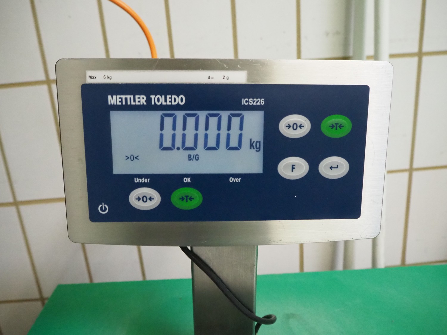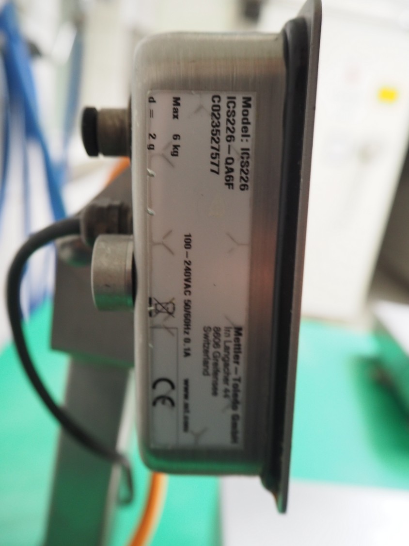 Mettler Toledo GmbH weighing scale, model indicator: ICS226, maximum weight: 6 kg, d= 2 g, 100-240 V, 50-60 Hz, 1.0 A, dimensions: 320 mm x 340 mm x 360 mm.