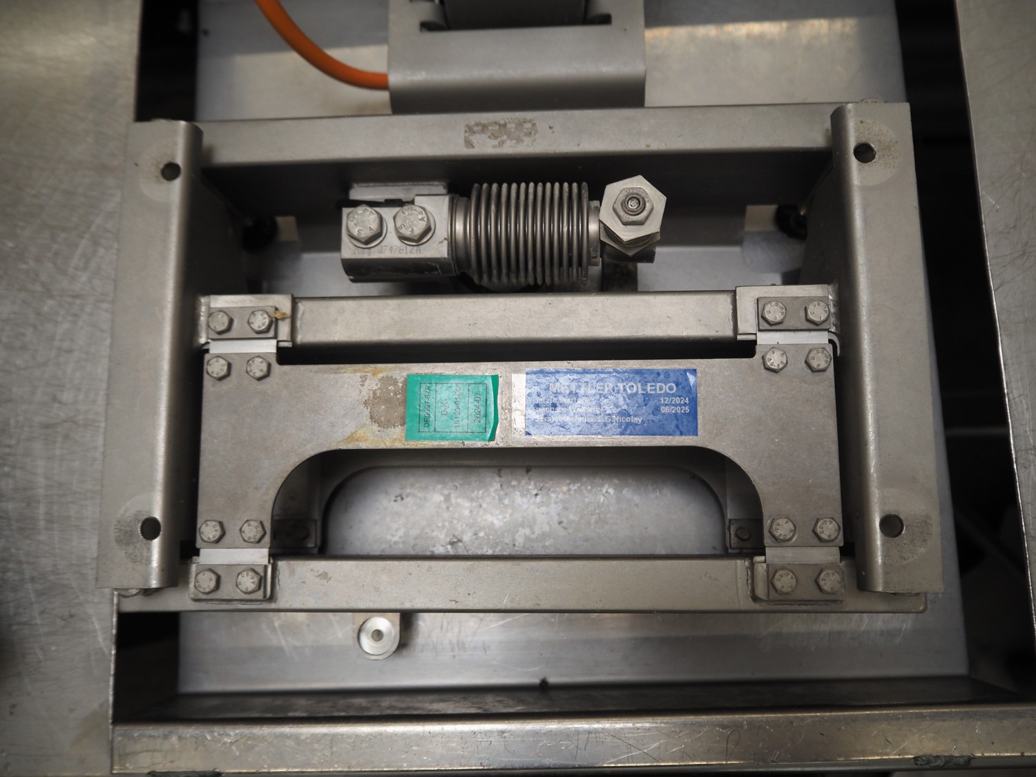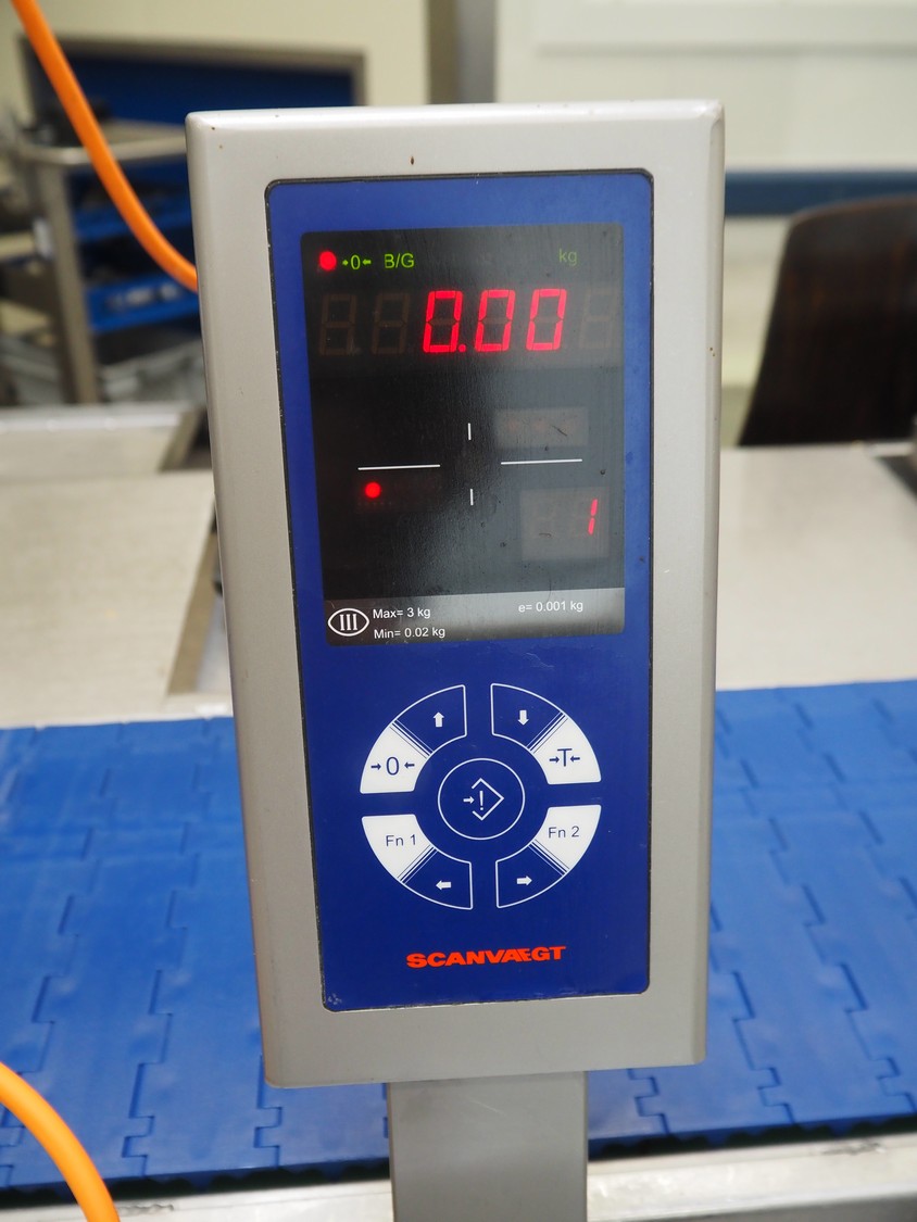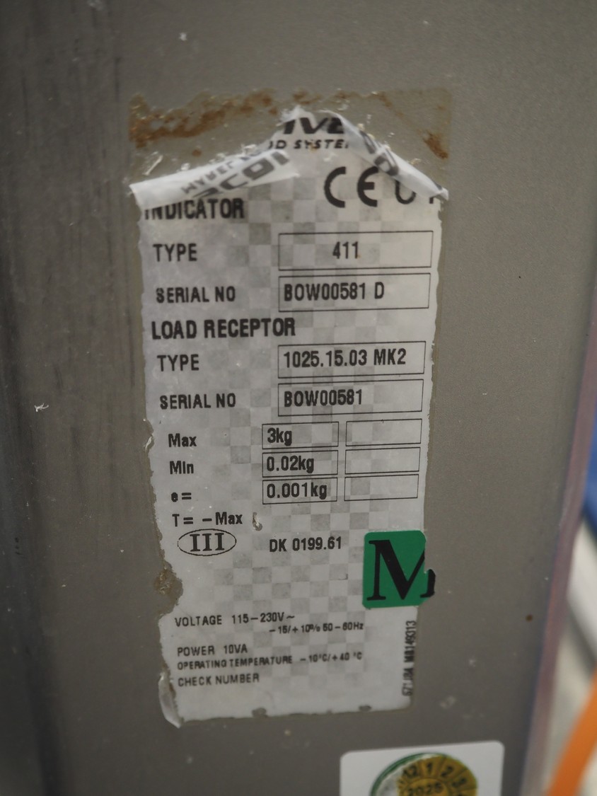 Scanvaegt weighing scale, indicator type: 411, serial number: BOW00581 D, load receptor, type: 1025.15.03.MK2, serial number: BOW00581, maximum weight: 3 kg, minimum weight: 0.02 kg, e= 0.001 kg, dimensions: 300 mm x 300 mm x 450 mm.