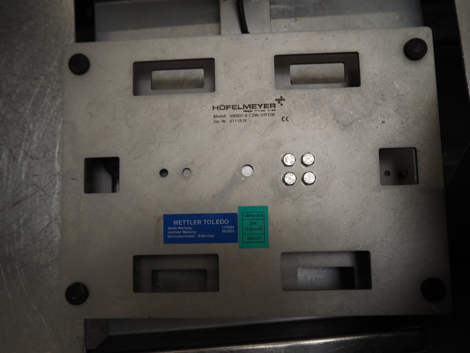 Höfelmeyer weighing scale, model: HIK6DC-E-C39K-HTF200, serial number: 6111839, maximum weight: 3/6 kg, d=0.001/0.002 kg, dimensions: 320 mm x 350 mm x 500 mm.