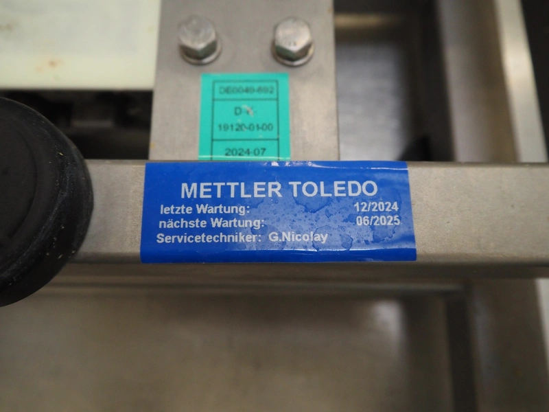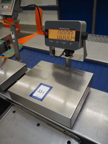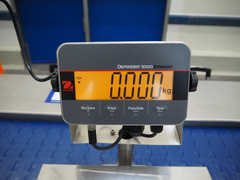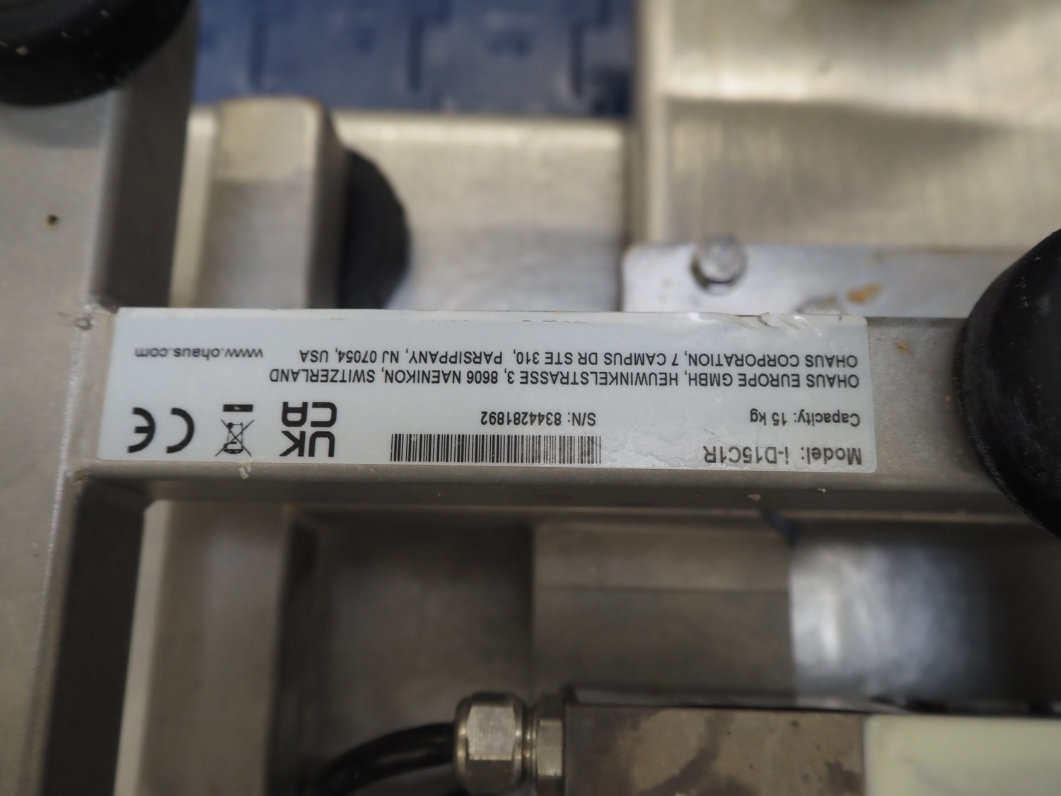 Ohaus Corporation weighing scale, model scale: i-D15C1R, serial number: 8344281892, model indicator: i-DT33XW, 100-240 V, 1 Ph, 50/60 Hz, 0.5 A, maximum: 15 kg, d = 0.002 kg, dimensions scale: 350 mm x 310 mm, total dimensions: 350 mm x 310 mm x 400 mm.