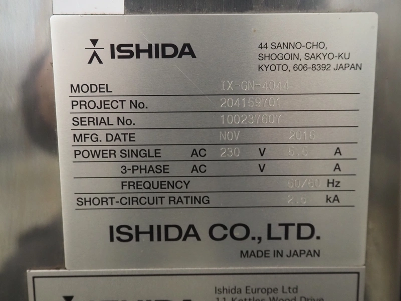 Ishida X-ray machine, model: IX-GN-4044, serial number: 100237607, year of construction: November 2016, 230 V, 1 Ph, 50/60 Hz, 5.5 A, plastic belt, belt width: 430 mm, clearance: 500 mm x 150 mm, total dimensions: 950 mm x 900 mm x 2000 mm.