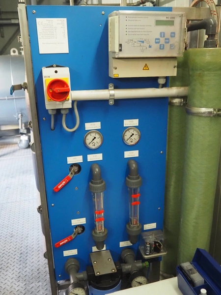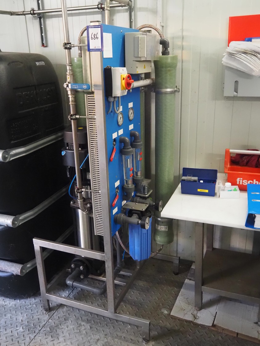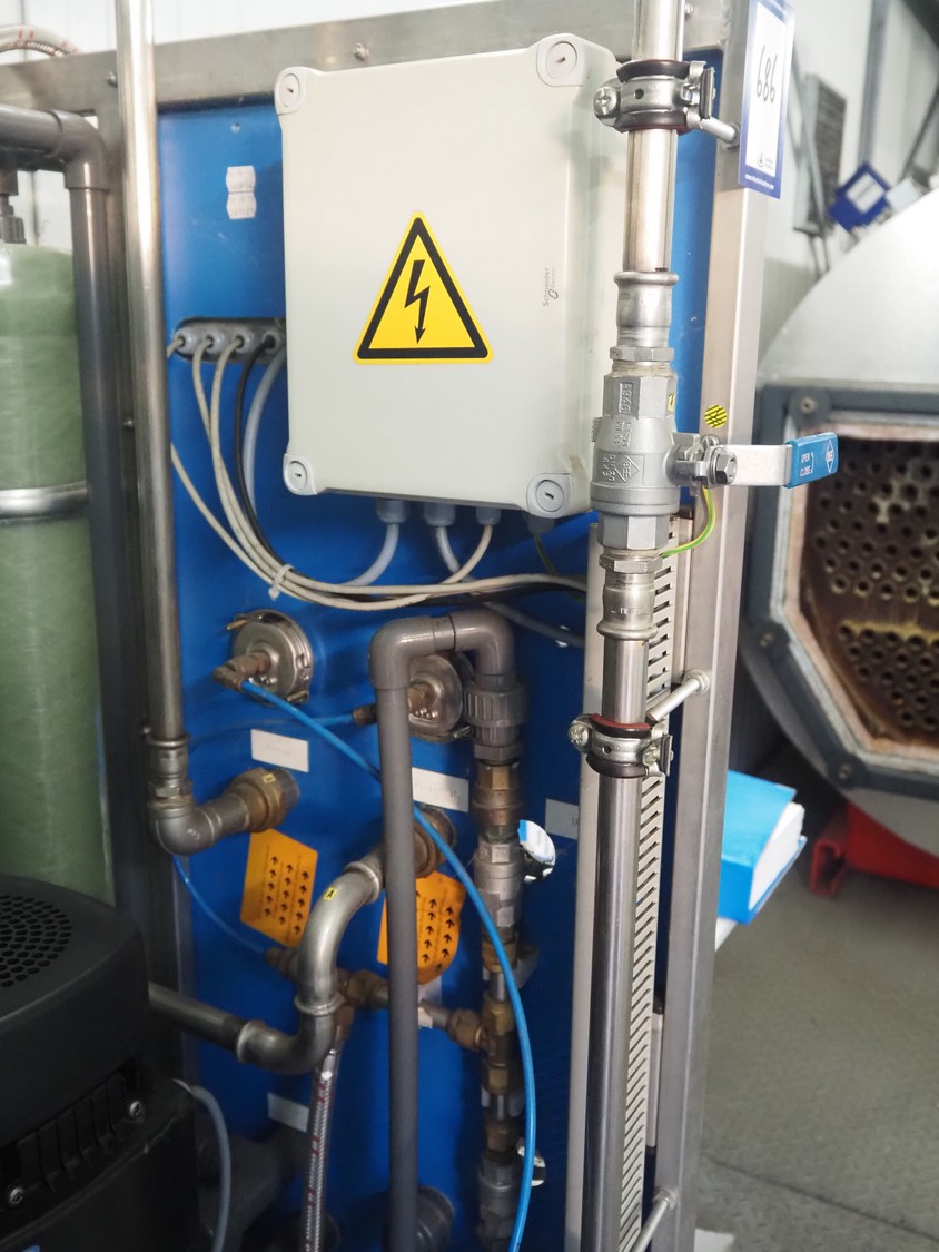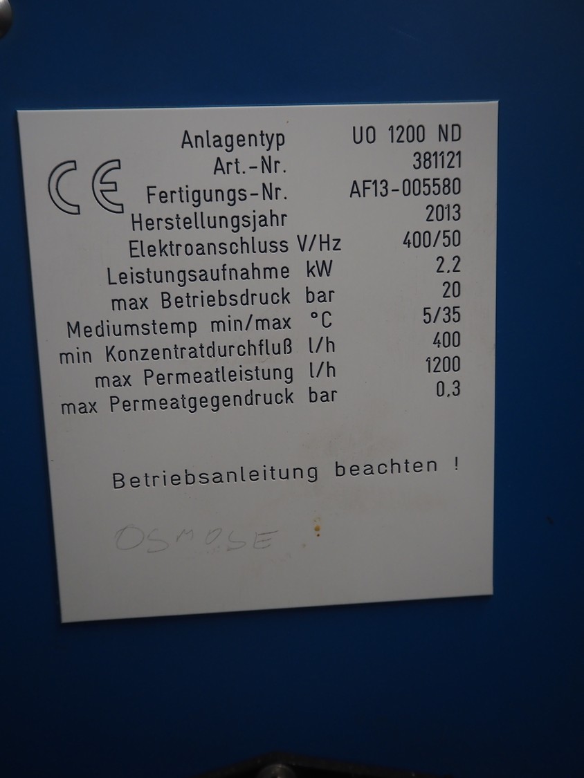 - Reverse osmose unit, type: UO 1200 ND, number: 381121, year of construction: 2013, 400 V, 50 Hz, 2.2 kW, minimum temperature: 5°C, maximum temperature: 35°C, dimensions: 700 mm x 640 mm x 1600 mm.