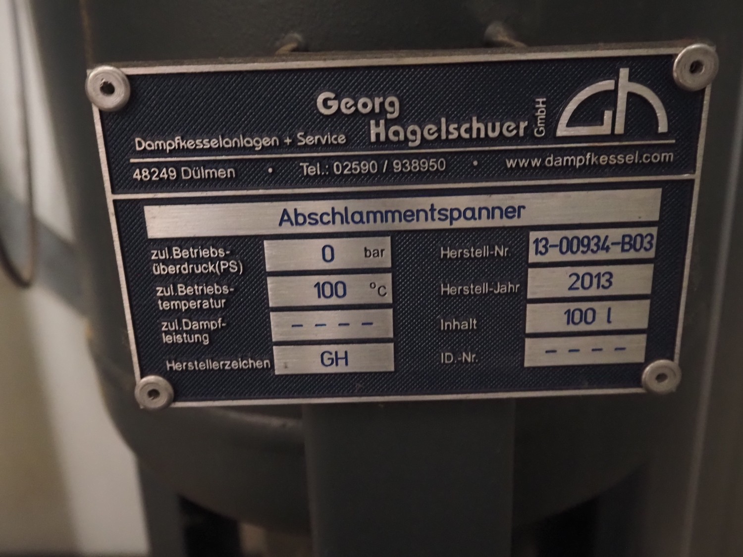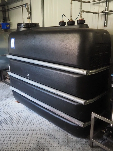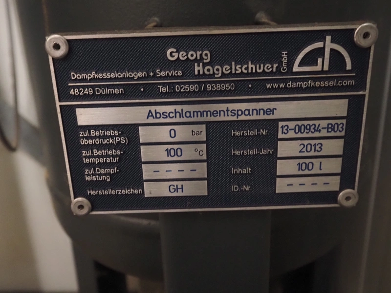 - Georg Hagelschuer insulated tank, name: Speisewasserbehälter, number: 13-00934-B01, year of construction: 2013, volume: 1000 liter, working pressure: 0.5 bar, working temperature: 110°C, dimensions: 1950 mm x 1000 mm x 1050 mm.