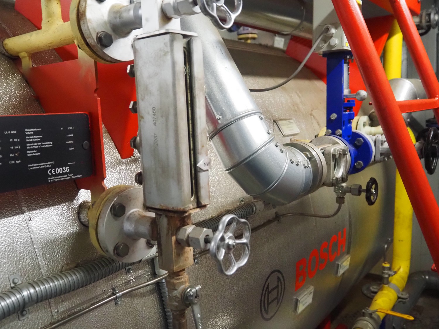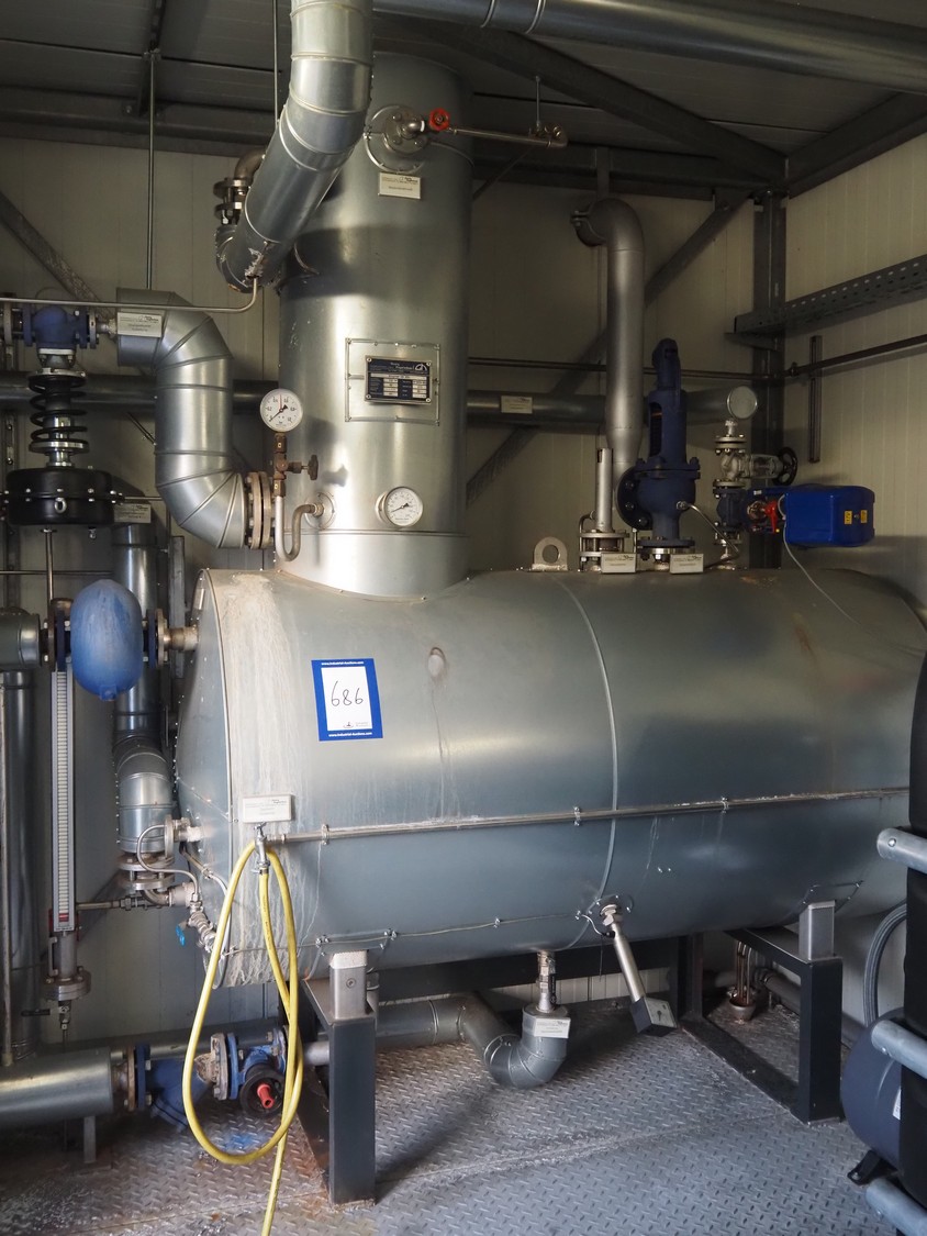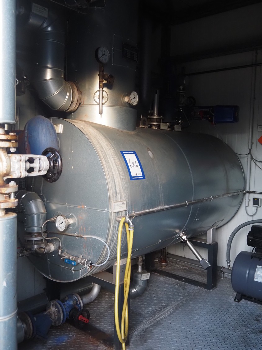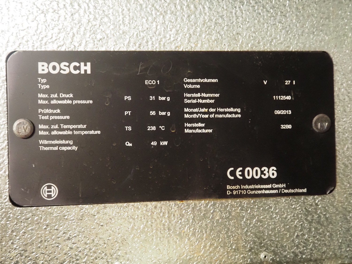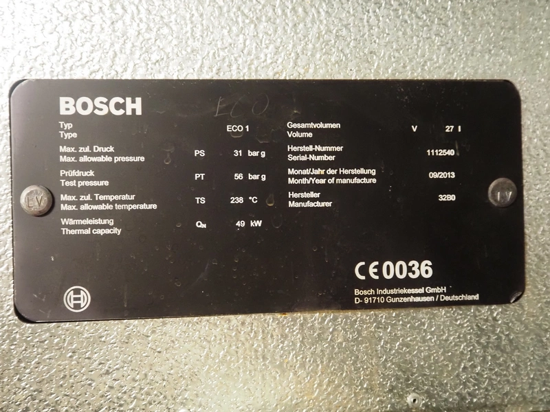 - Bosch steam boiler, type: ECO1, serial number: 1112540, year of construction: 09/2013, maximum pressure: 31 bar, test pressure: 56 bar, maximum temperature: 238°C, volume: 27 liter, Bosch boiler tank, type: UL-S 1250, serial number: 115369, year of construction: 09/2013, maximum pressure: 10 bar, test pressure: 19 bar, maximum temperature: 184°C, steam capacity: 1250 kg per hour, volume: 2320 liter,
