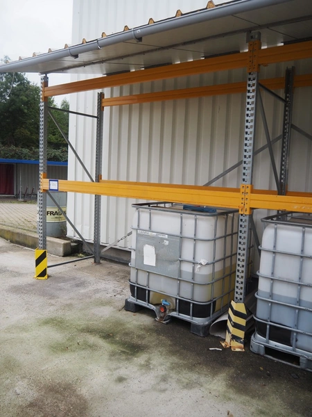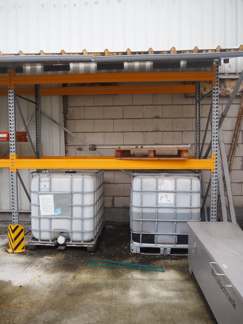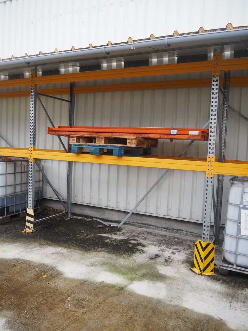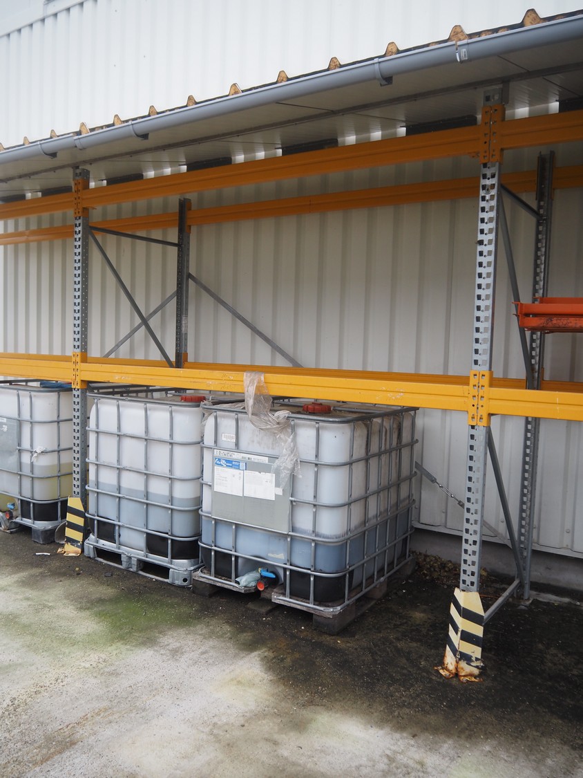 Jungheinrich steel pallet rack, type: S, number: 1112017504, year of construction: 2007, consisting of: 5 uprights, dimensions: (5x) 1100 mm x 90 mm x 2700 mm, 16 beams, beam length: (16x) 2880 mm, total dimensions: 11620 mm x 1100 mm x 2700 mm. IBC tanks not included.
