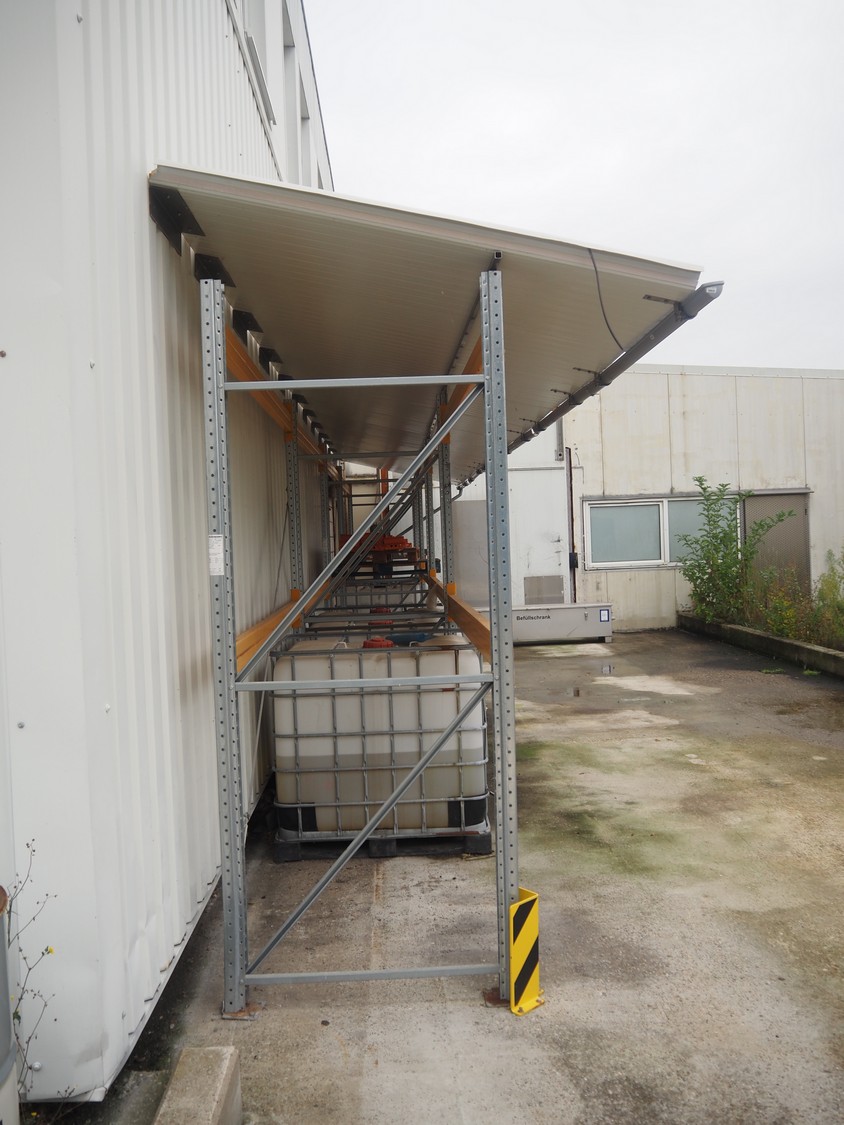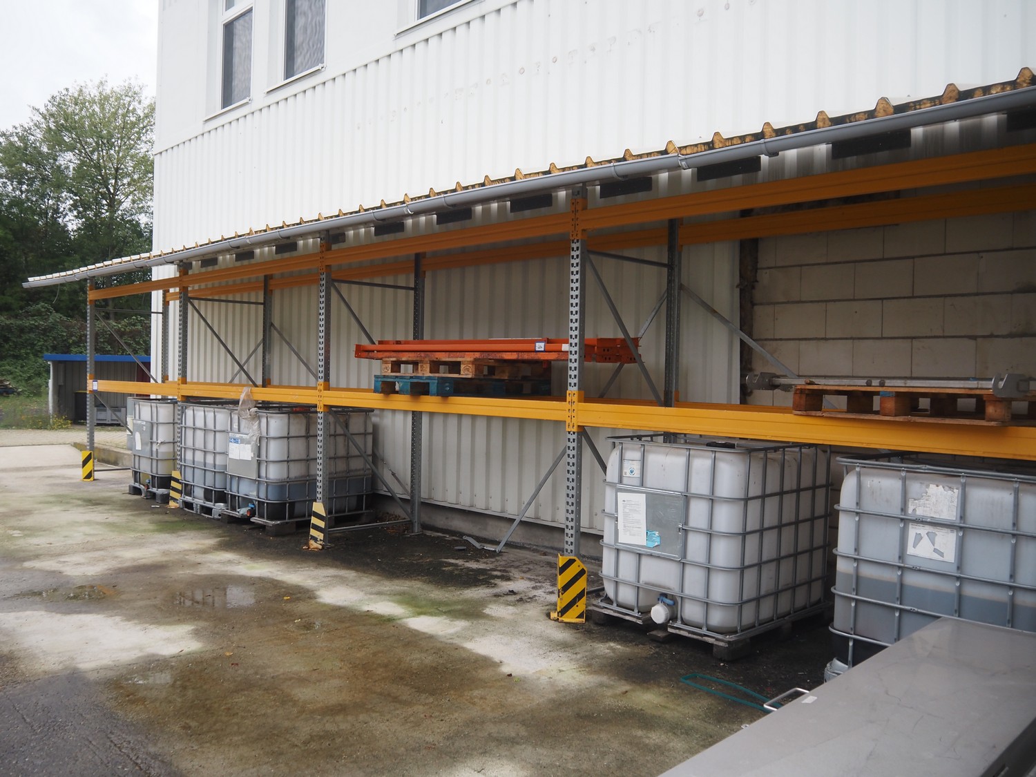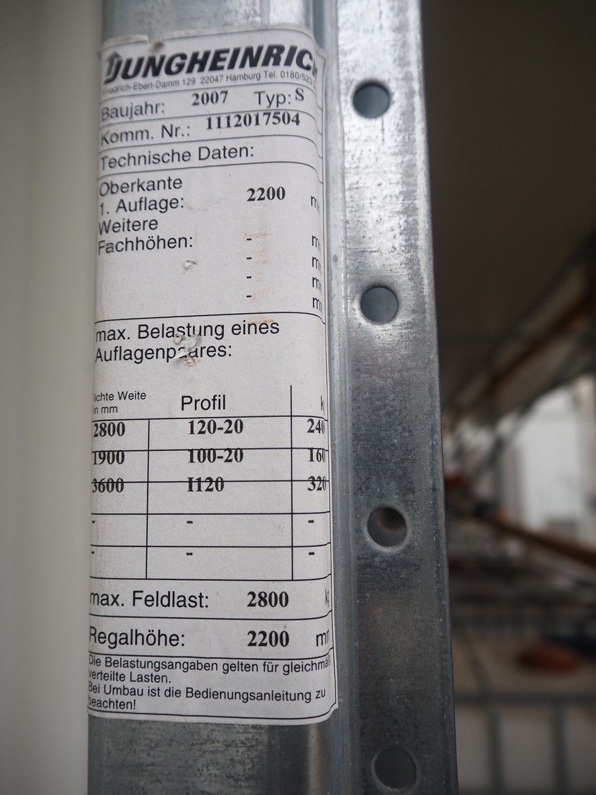 Jungheinrich steel pallet rack, type: S, number: 1112017504, year of construction: 2007, consisting of: 5 uprights, dimensions: (5x) 1100 mm x 90 mm x 2700 mm, 16 beams, beam length: (16x) 2880 mm, total dimensions: 11620 mm x 1100 mm x 2700 mm. IBC tanks not included.