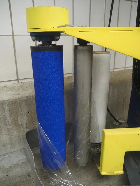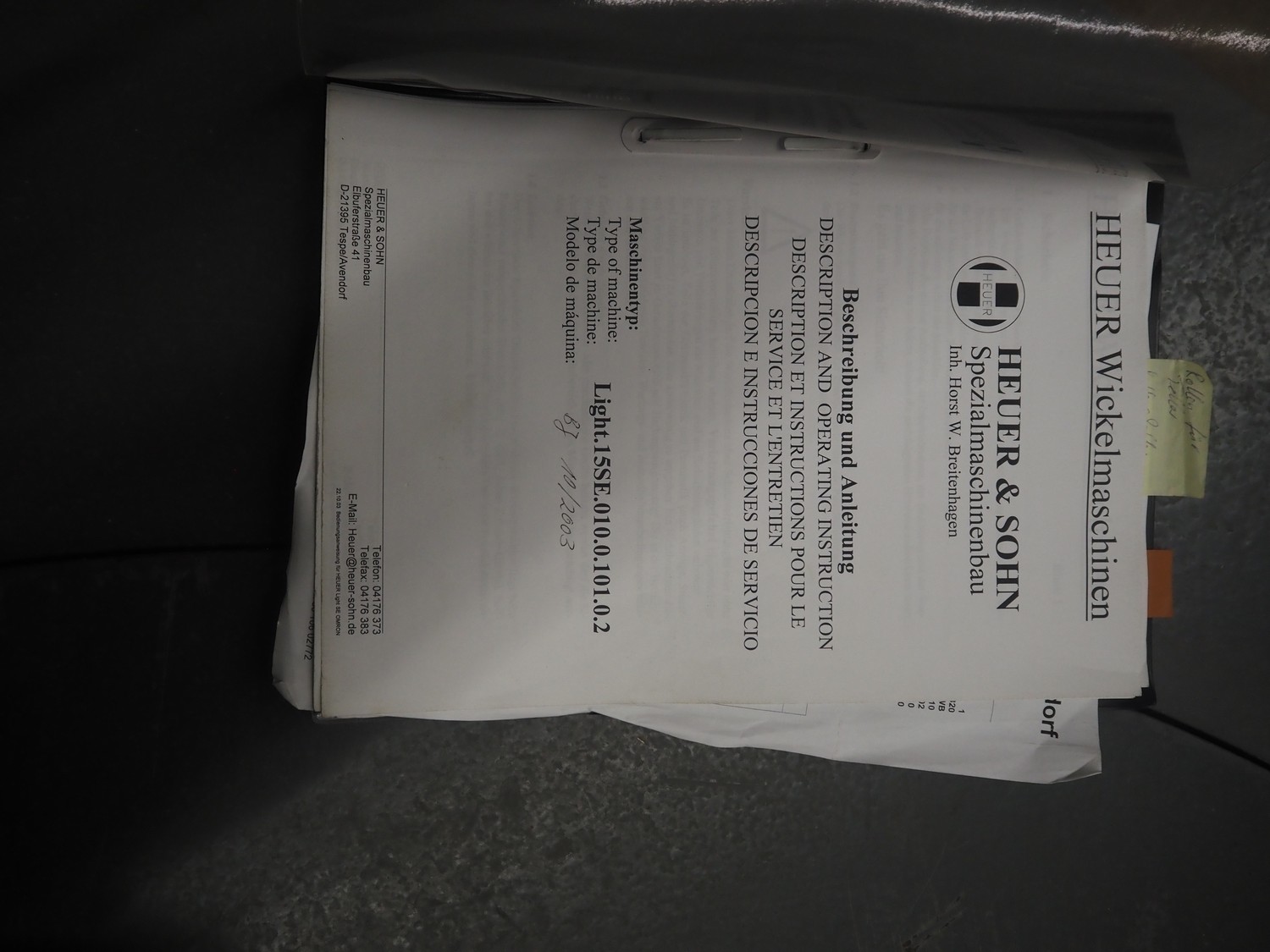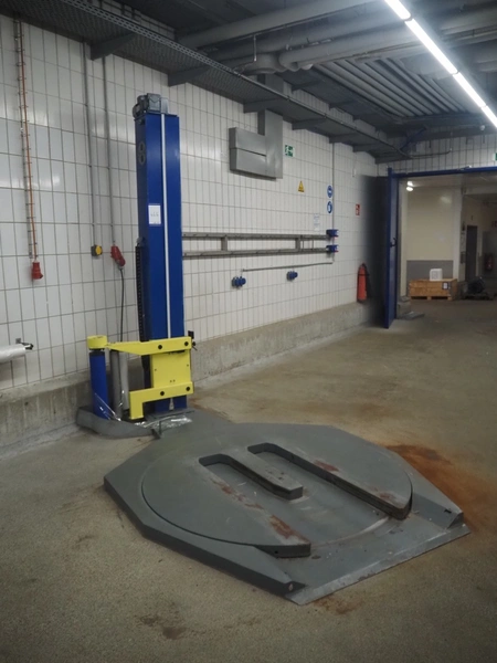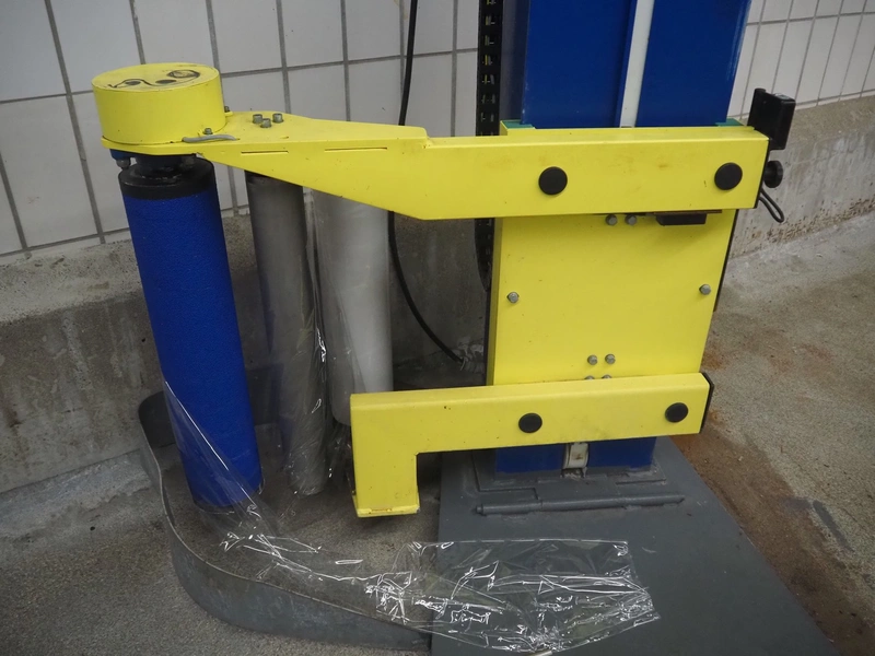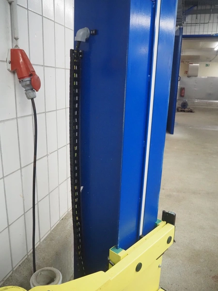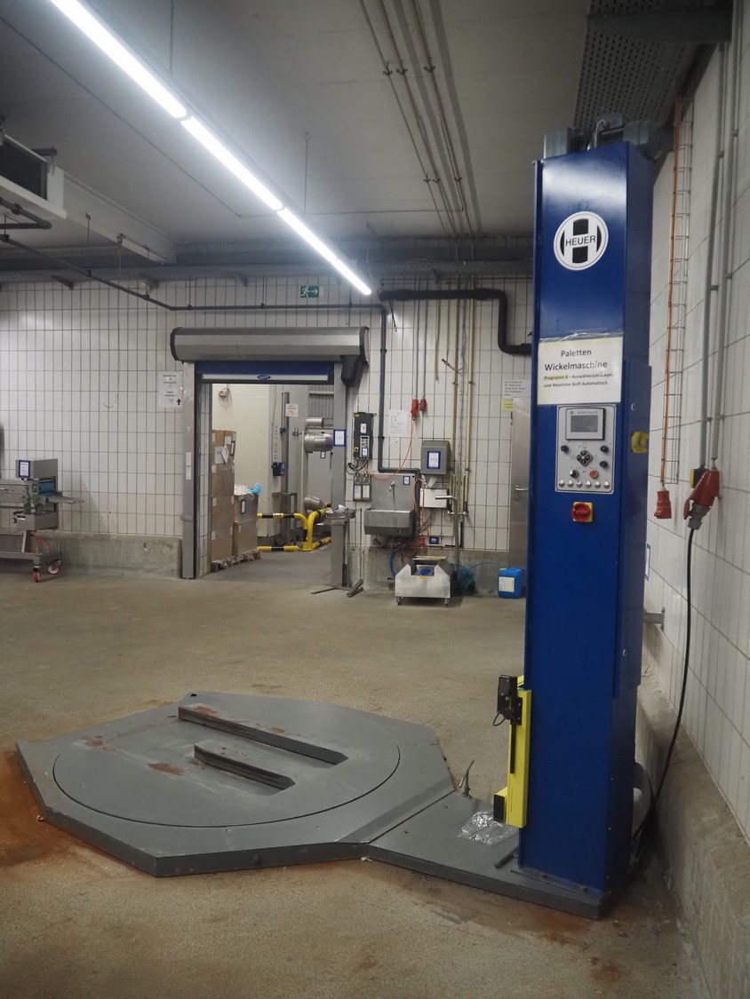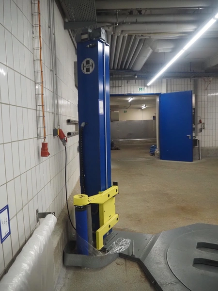 Heuer pallet wrapper, type: Light.15SE.010.0.101.0.2, year of construction: 10/2003, diameter turning device: 1650 mm, film width: 500 mm, total dimensions: 3000 mm x 1850 mm x 2750 mm.