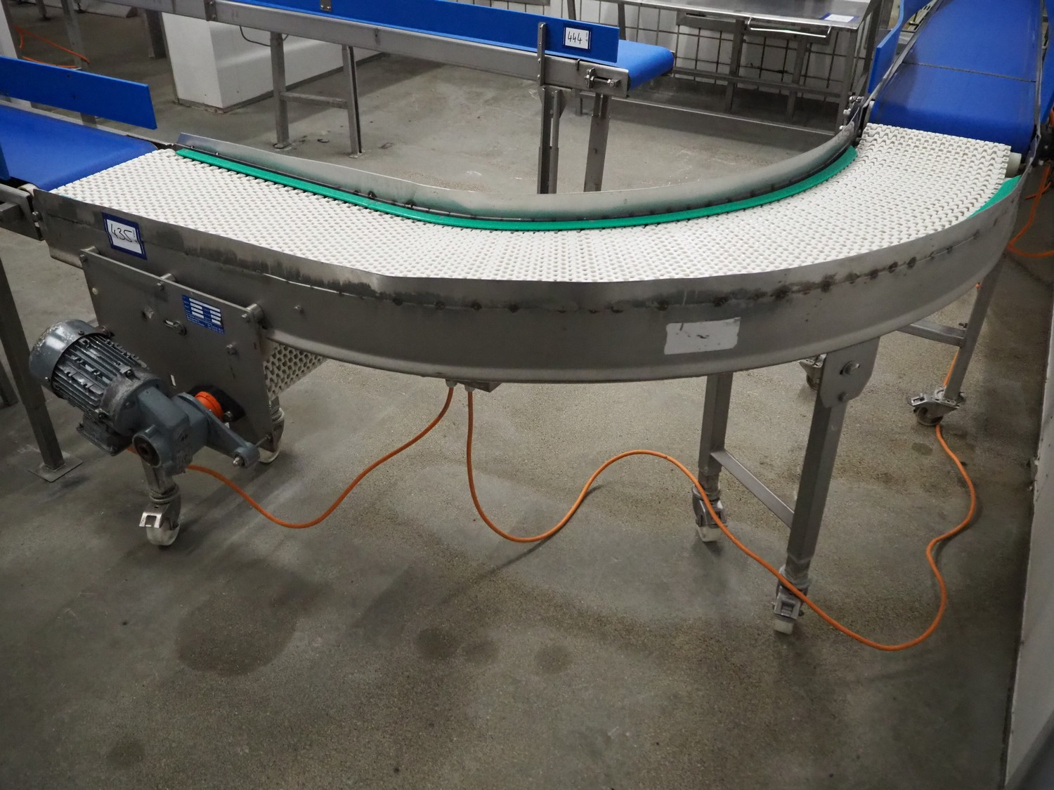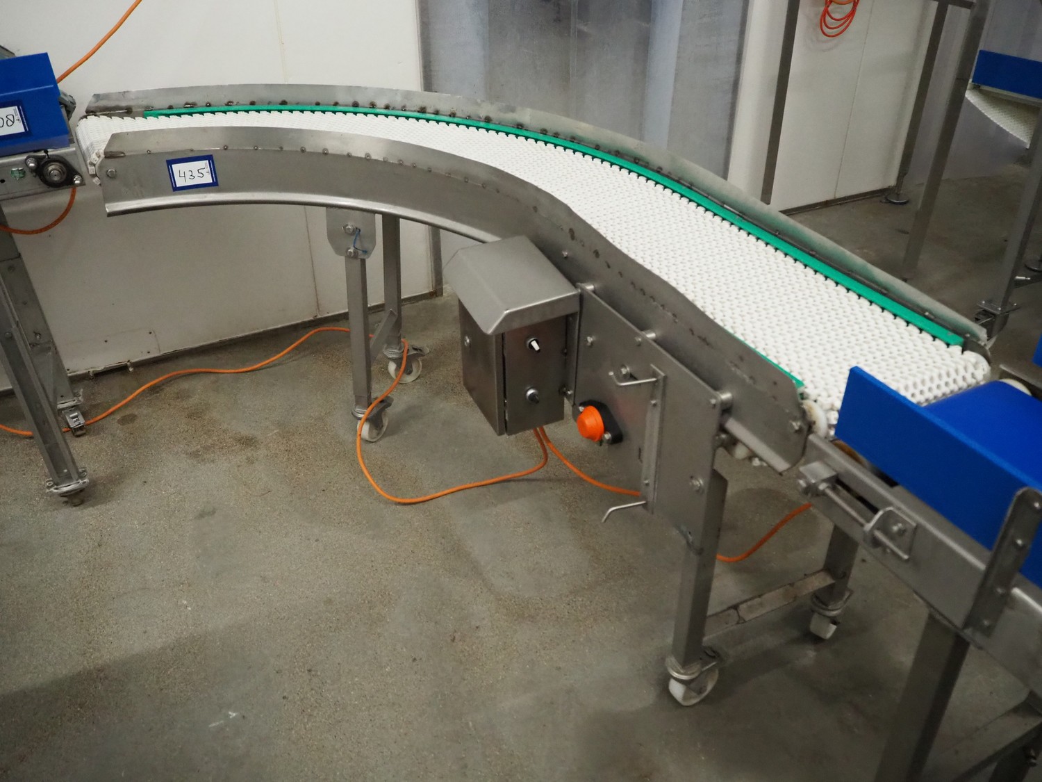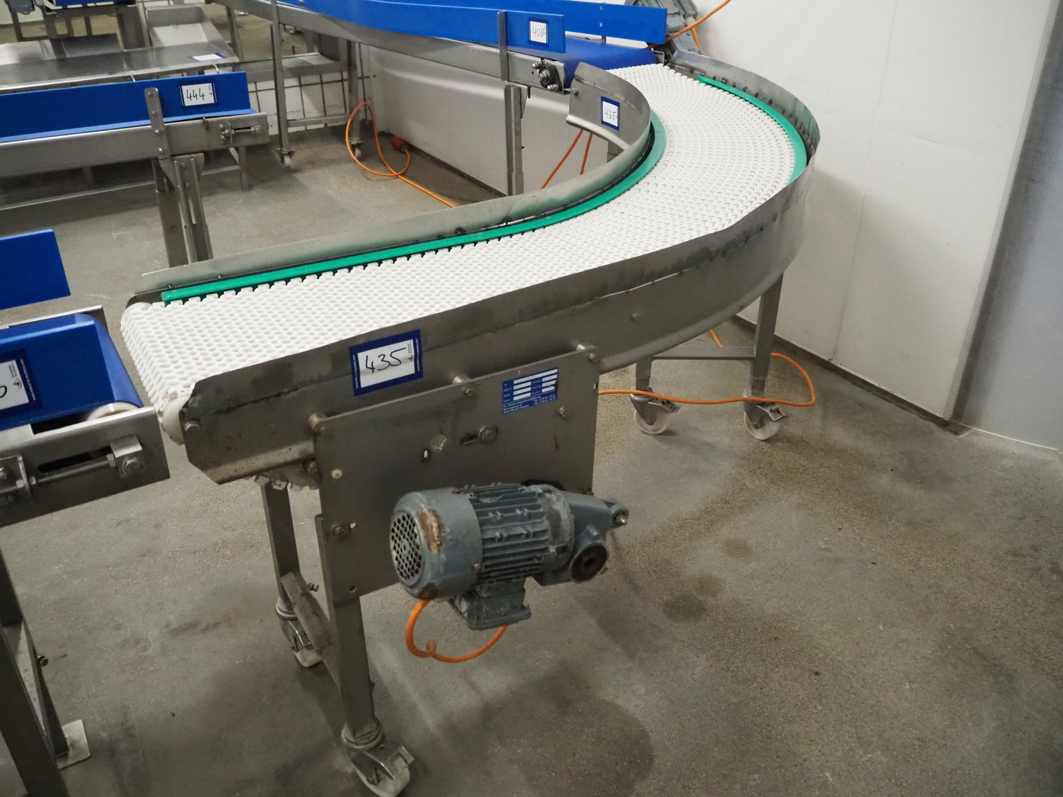 Fa. Terbahl 90° mobile curve conveyor, type: S-Band TR-12-091/J1274, number: 99914/2, year of construction: 2/03, 230/400 V, 0.55 kW, plastic mesh belt, belt width: 280 mm, total dimensions: 1750 mm x 1200 mm x 890 mm.