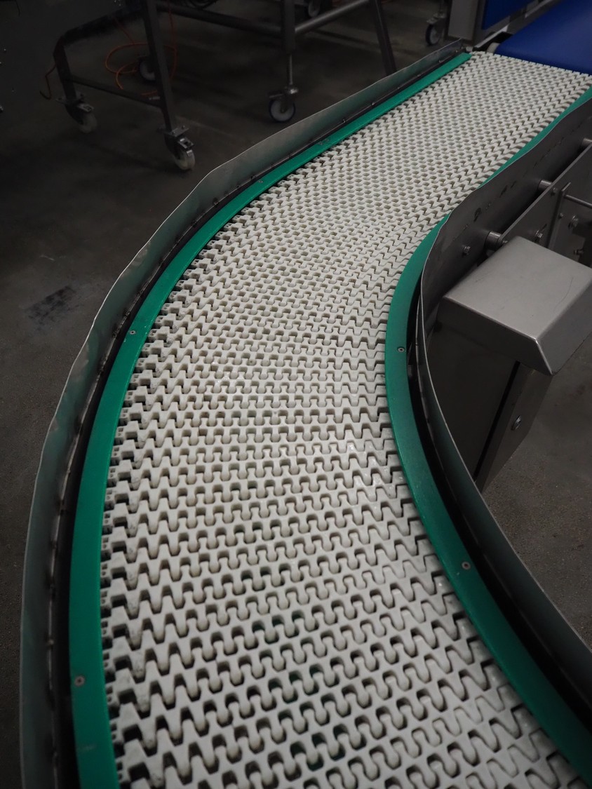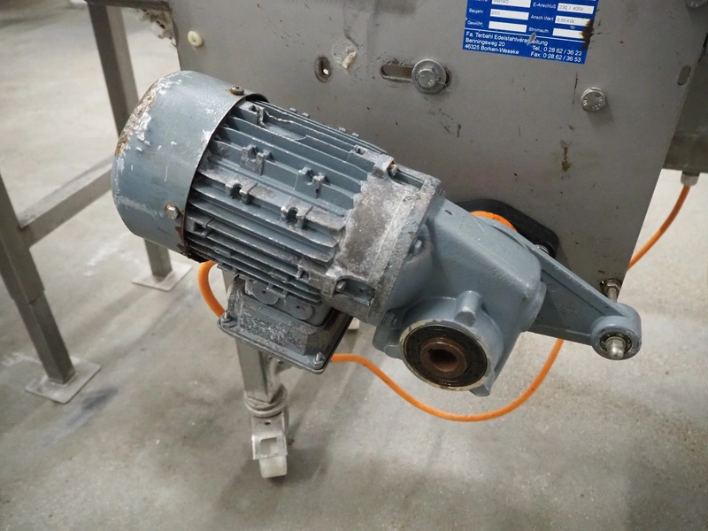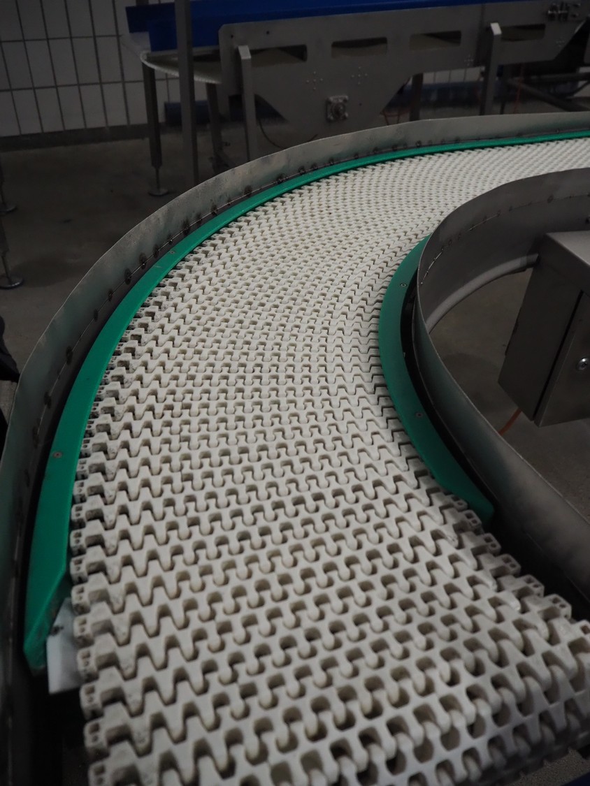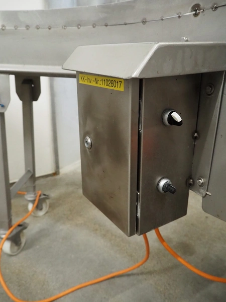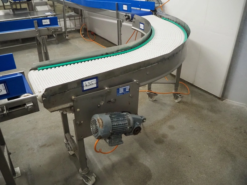 Fa. Terbahl 90° mobile curve conveyor, type: S-Band TR-12-091/J1274, number: 99914/2, year of construction: 2/03, 230/400 V, 0.55 kW, plastic mesh belt, belt width: 280 mm, total dimensions: 1750 mm x 1200 mm x 890 mm.