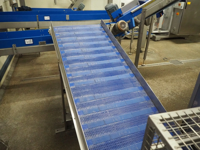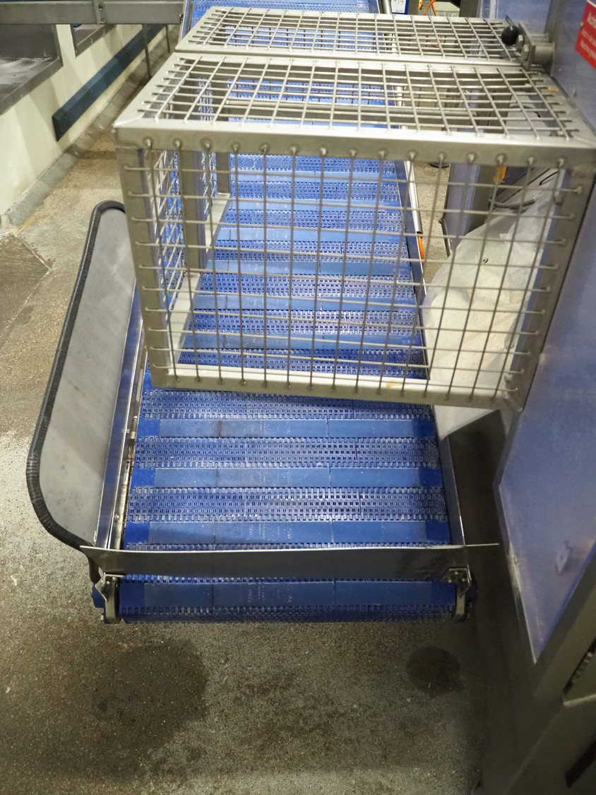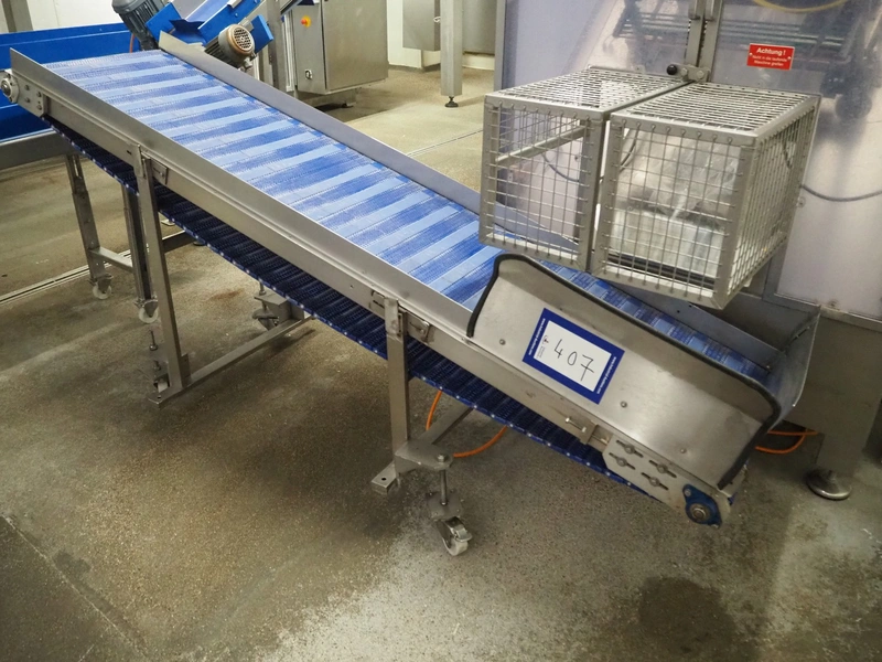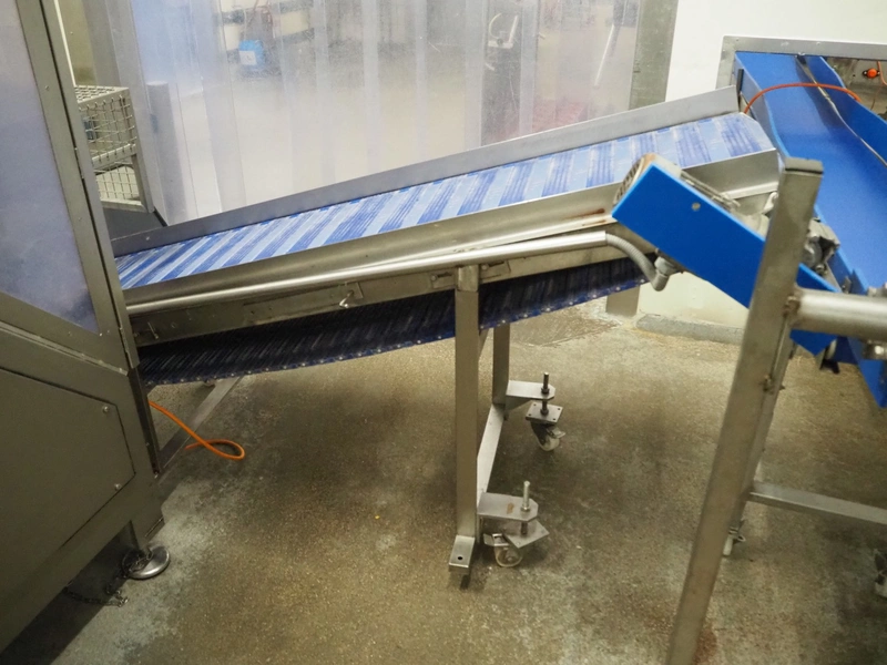Mobile elevating belt, s/s frame, plastic belt, belt width: 550 mm, elevating height: 1100 mm, total dimensions: 2400 mm x 830 mm x 1180 mm.
