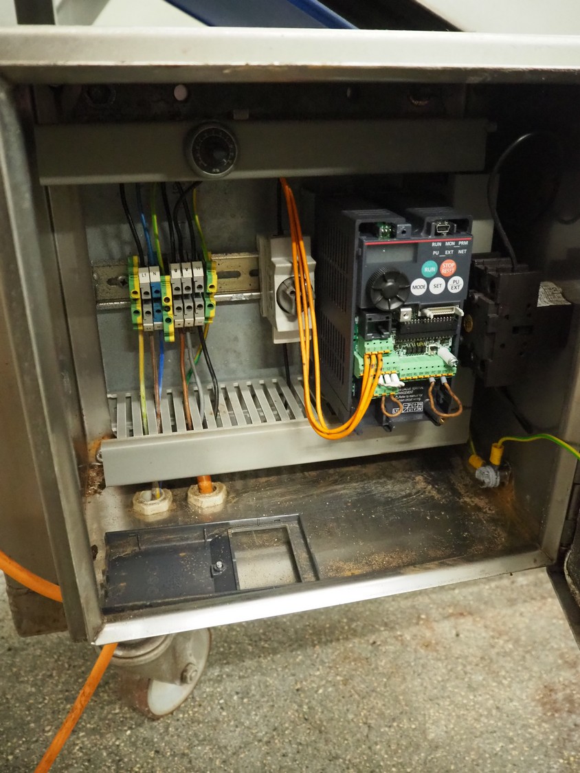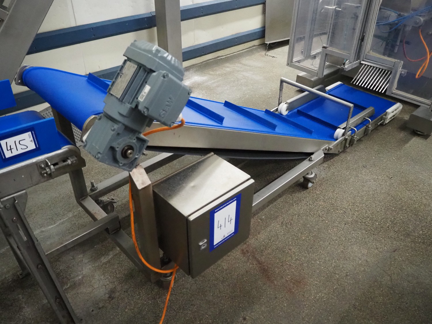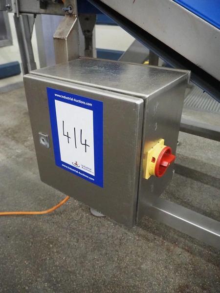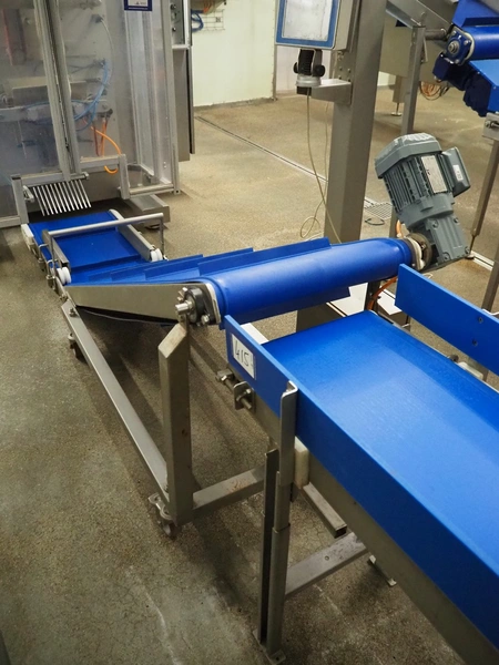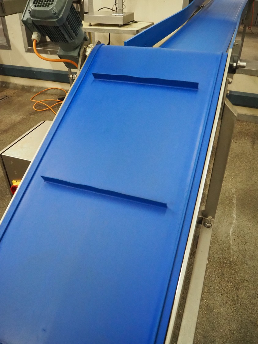 Mobile elevating belt, s/s frame, plastic belt with dividers, belt width: 500 mm, dividers height: 30 mm, distance between dividers: 420 mm, elevating height: 900 mm, total dimensions: 2700 mm x 800 mm x 1100 mm.