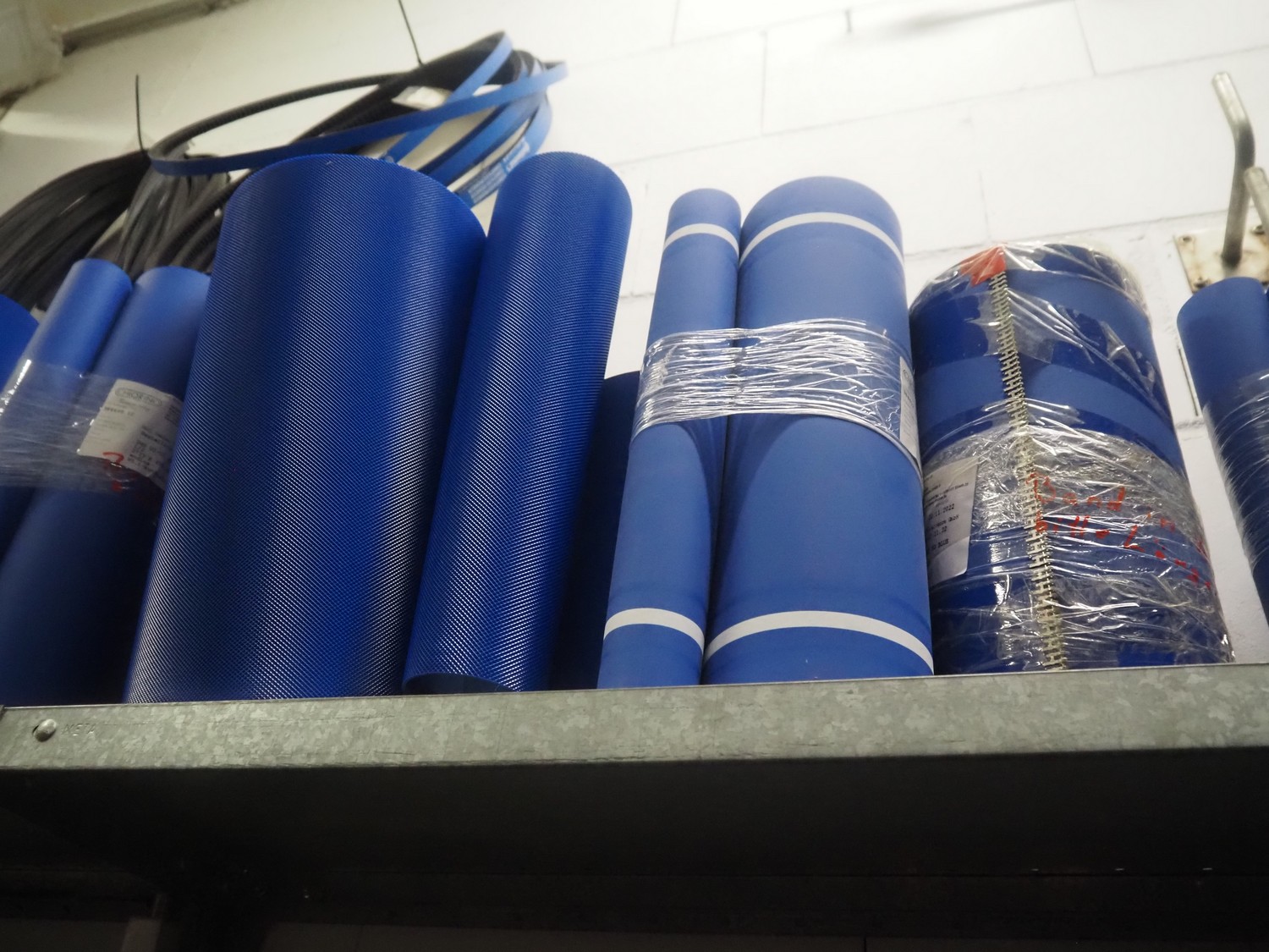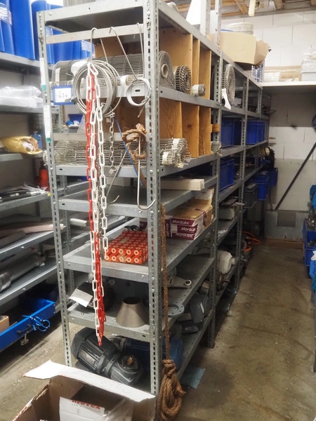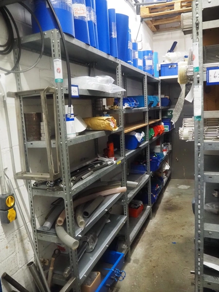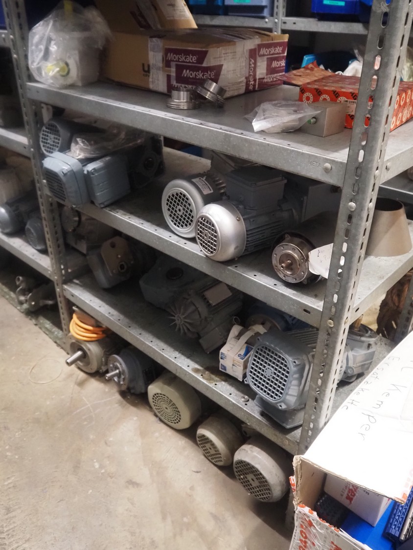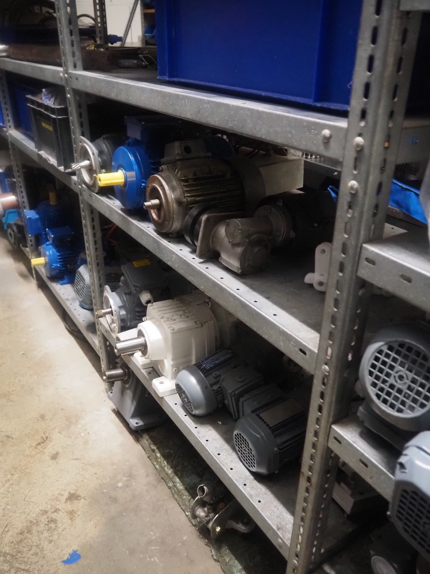3 racks with large amount of parts, among others: s/s mesh belts, belt width: 620 mm / 600 mm / 500 mm / 400 mm / 320 mm, various electro motors, drum motors, plastic belts, belt width: 400 mm, wheels, gearings, dimensions racks: (2x) 4000 mm x 500 mm x 2000 mm and 4000 mm x 300 mm x 2000 mm.