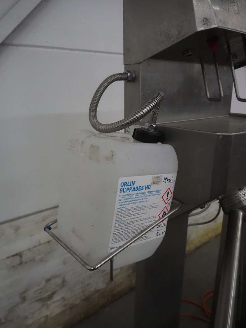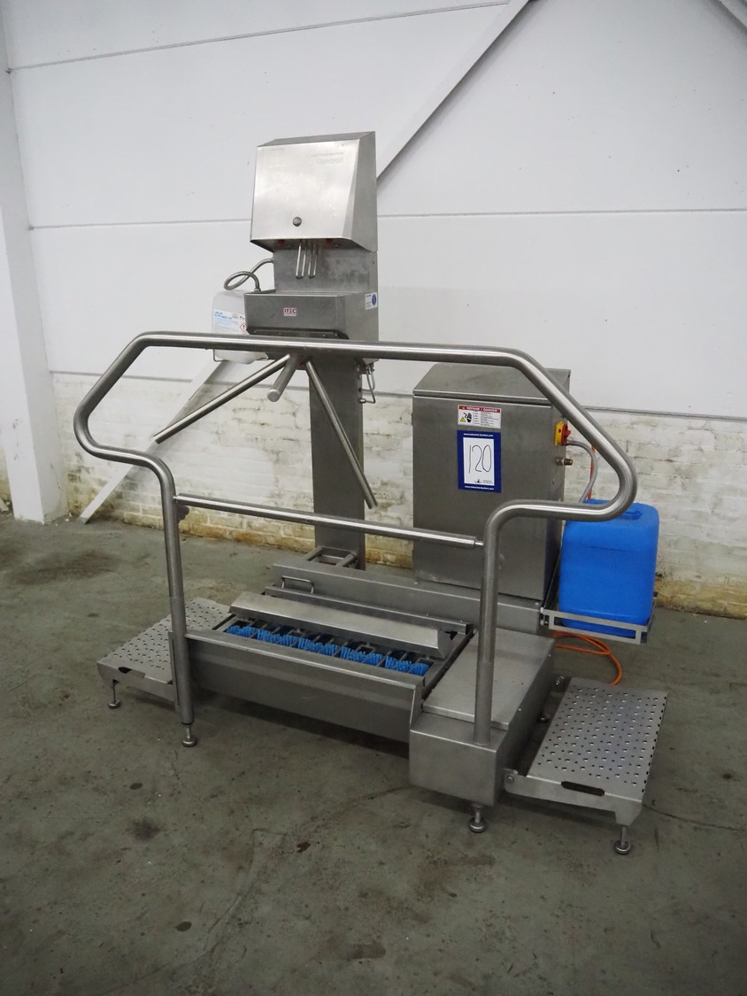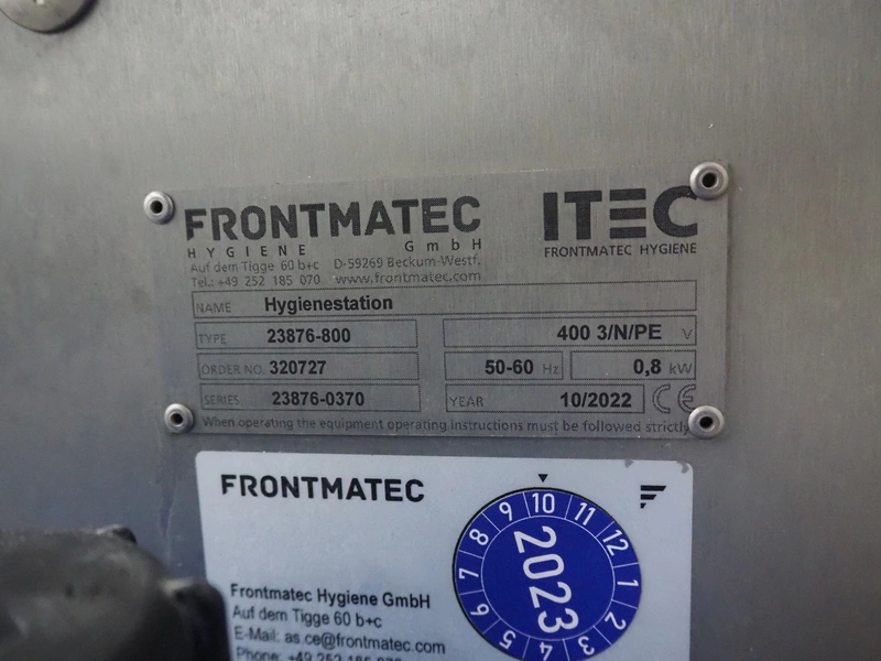 Itec Food Technology hygiene station, type: 23876-800, number: 0370, year of construction: 10/2022, 400 V, 3 Ph, 50/60 Hz, 0.8 kW, brush width: (2x) 100 mm, total dimensions: 1600 mm x 900 mm x 1850 mm.