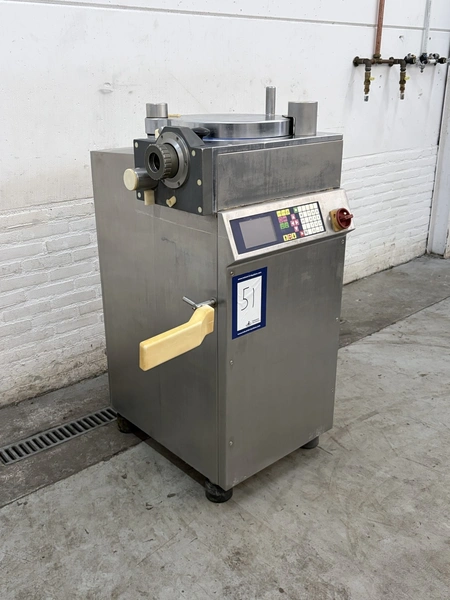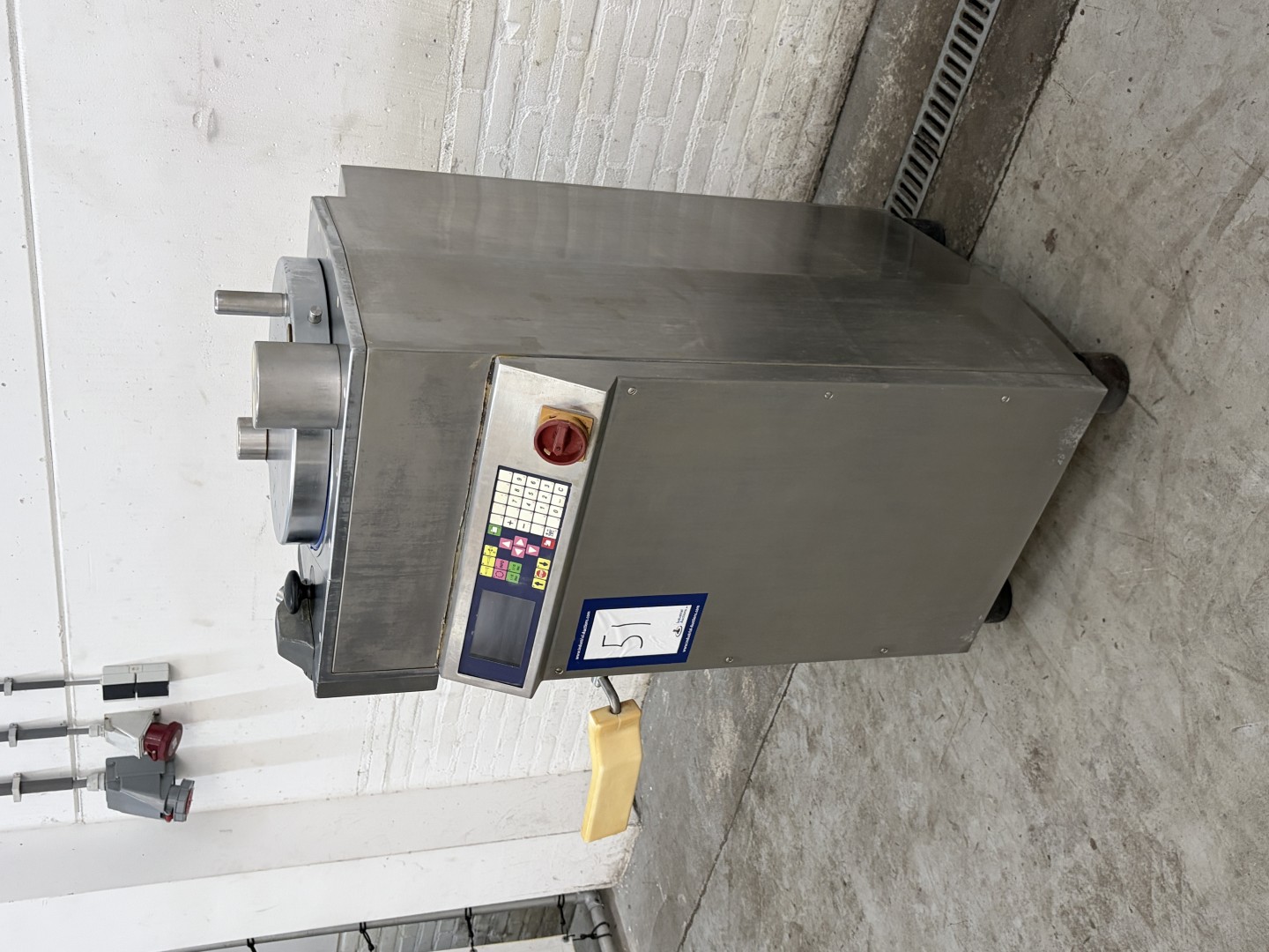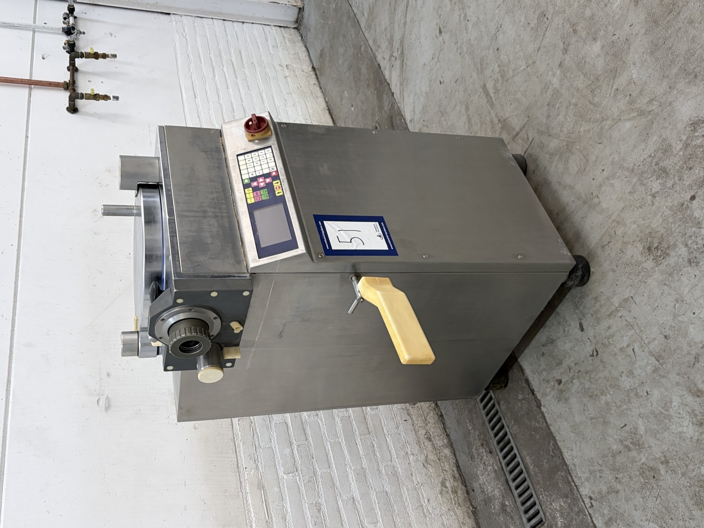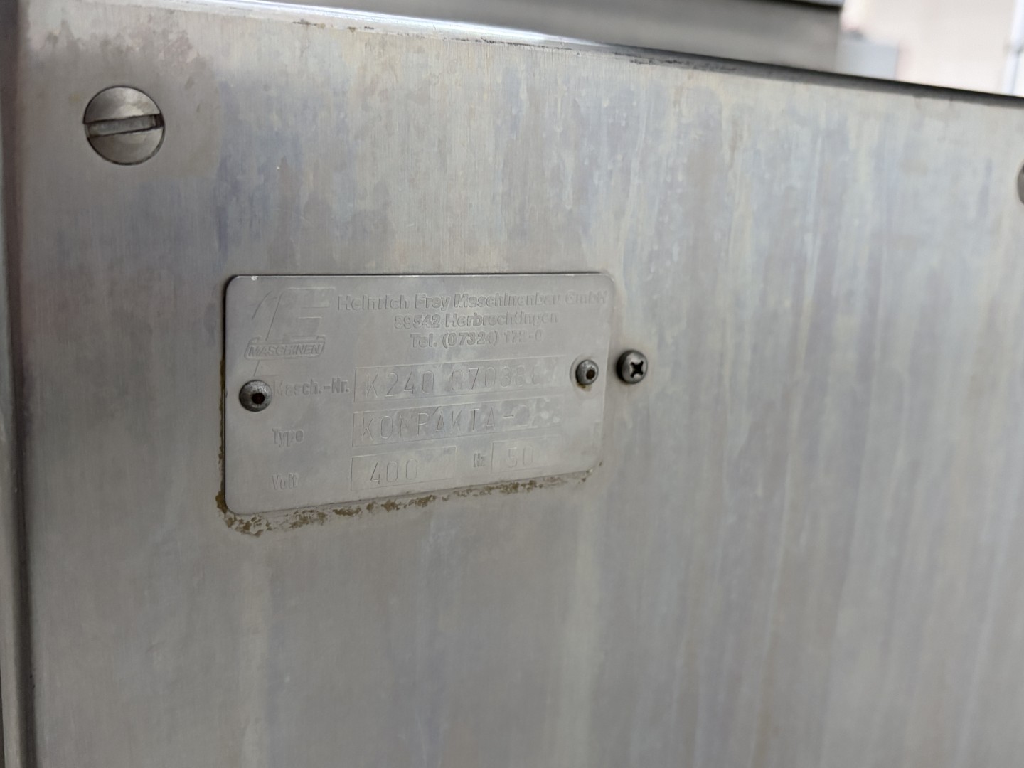 Frey Maschinenbau GmbH piston filler, type: Kompakta-2, serial number: K240 070388, 400 V, 3 Ph, 50 Hz, 3.6 kW, 30 bar, capacity: 40 liter, portioning range: 5-10.000 gram, maximum 250 portions per minute, weight: 448 kg, total dimensions: 880 mm x 780 mm x 1280 mm.