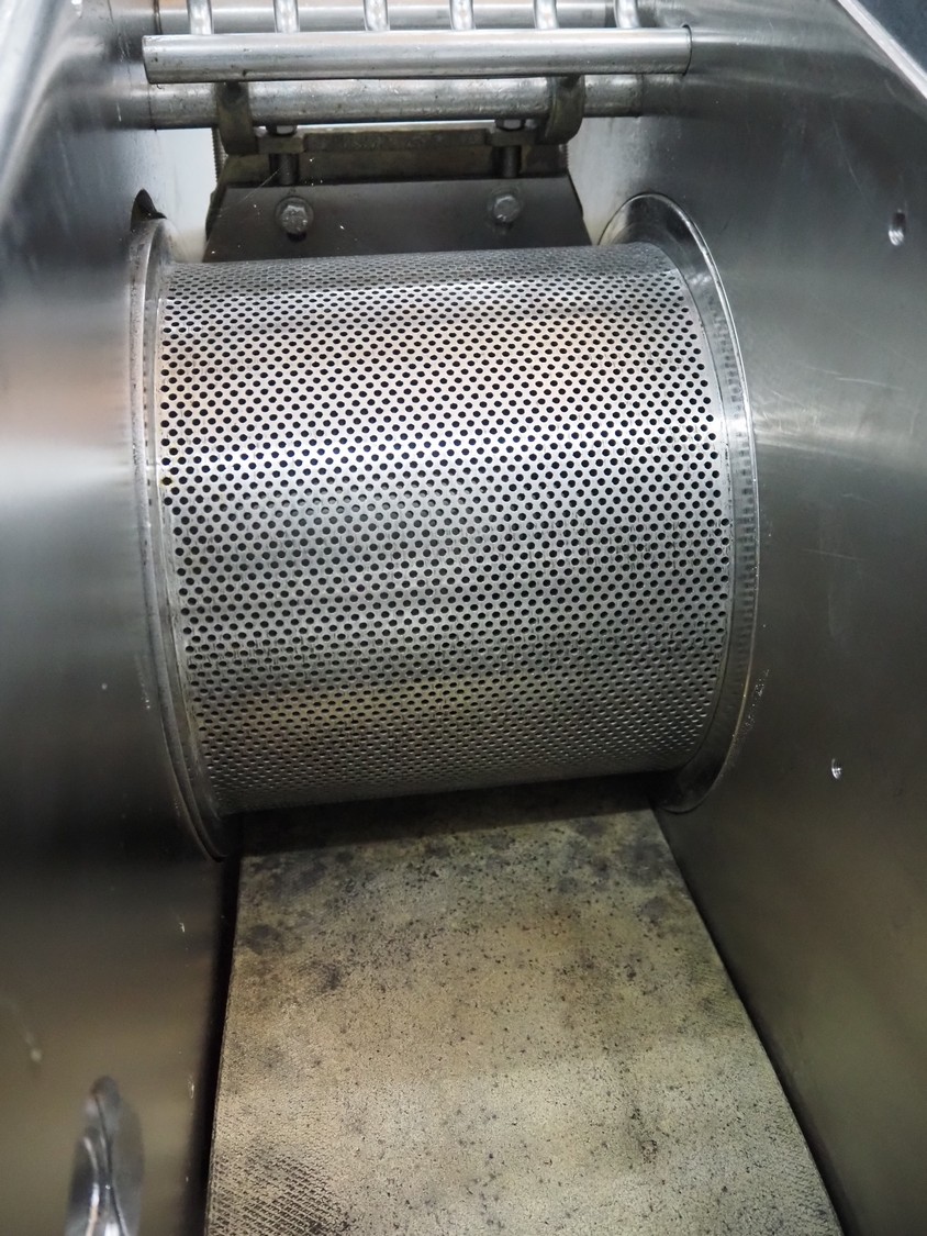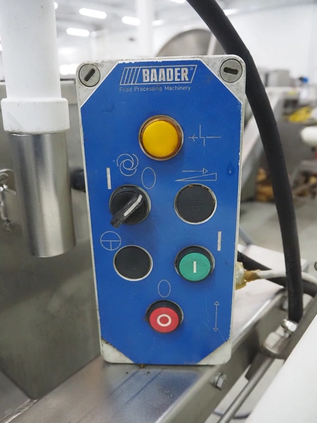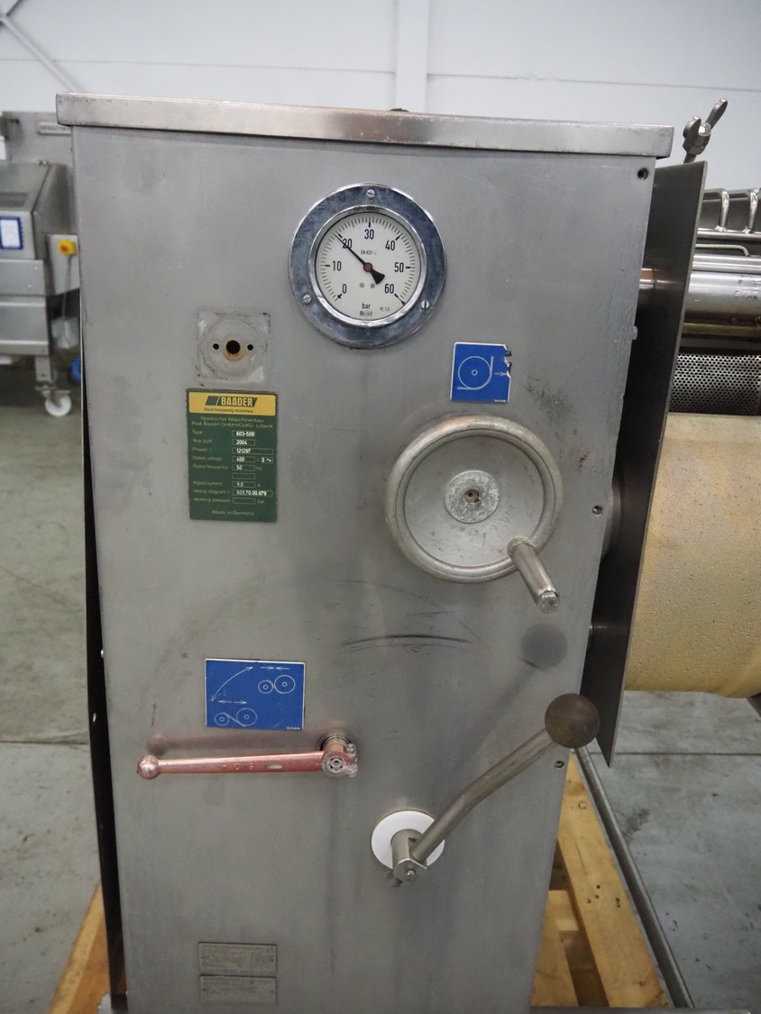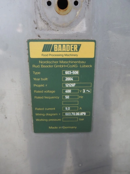 Baader separator, type: 603-508, number: 121297, year of construction: 2004, 400 V, 3 Ph, 50 Hz, perforations: Ø 2 mm, total dimensions: 1100 mm x 1250 mm x 1600 mm.