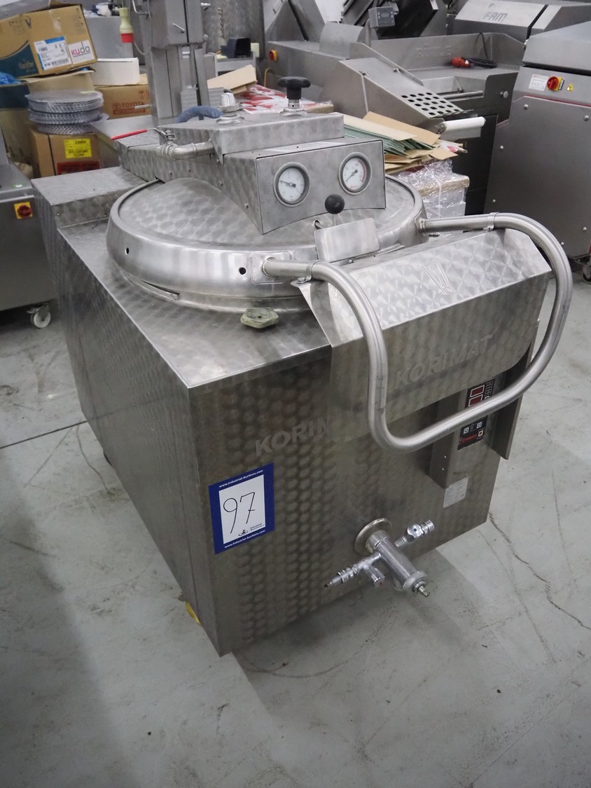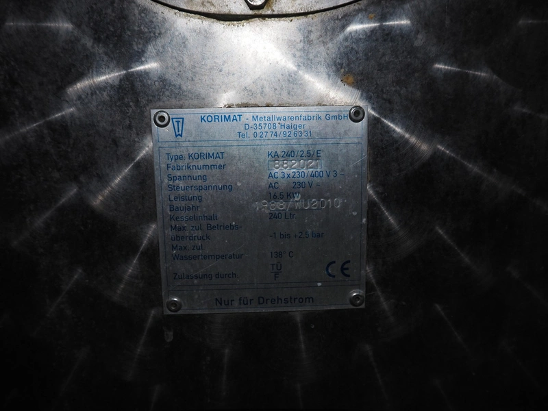 Korimat mobile autoclave, type: KA 240/2.5/E, number: 882021, year of construction: 1988, 230/400 V, 3 Ph, 50 Hz, 16.5 kW, capacity: 240 liter, dimensions: 1500 mm x 900 mm x 1400 mm.