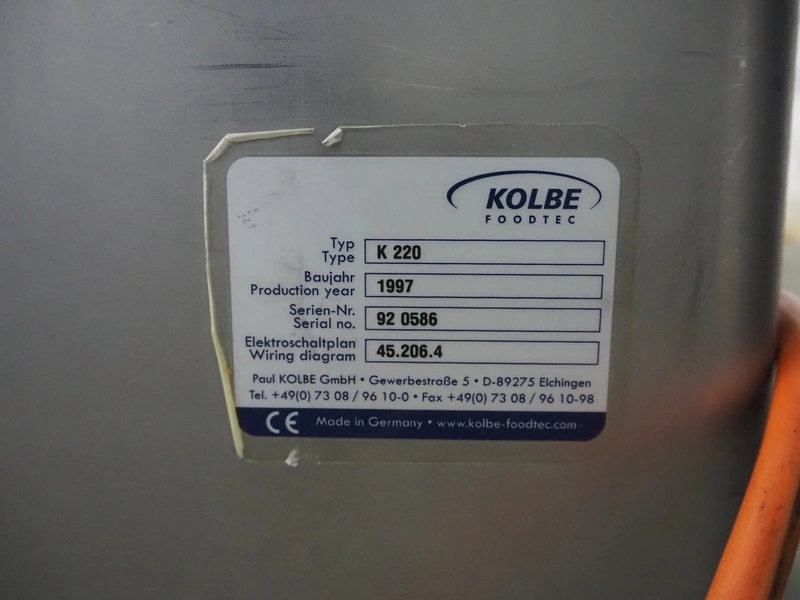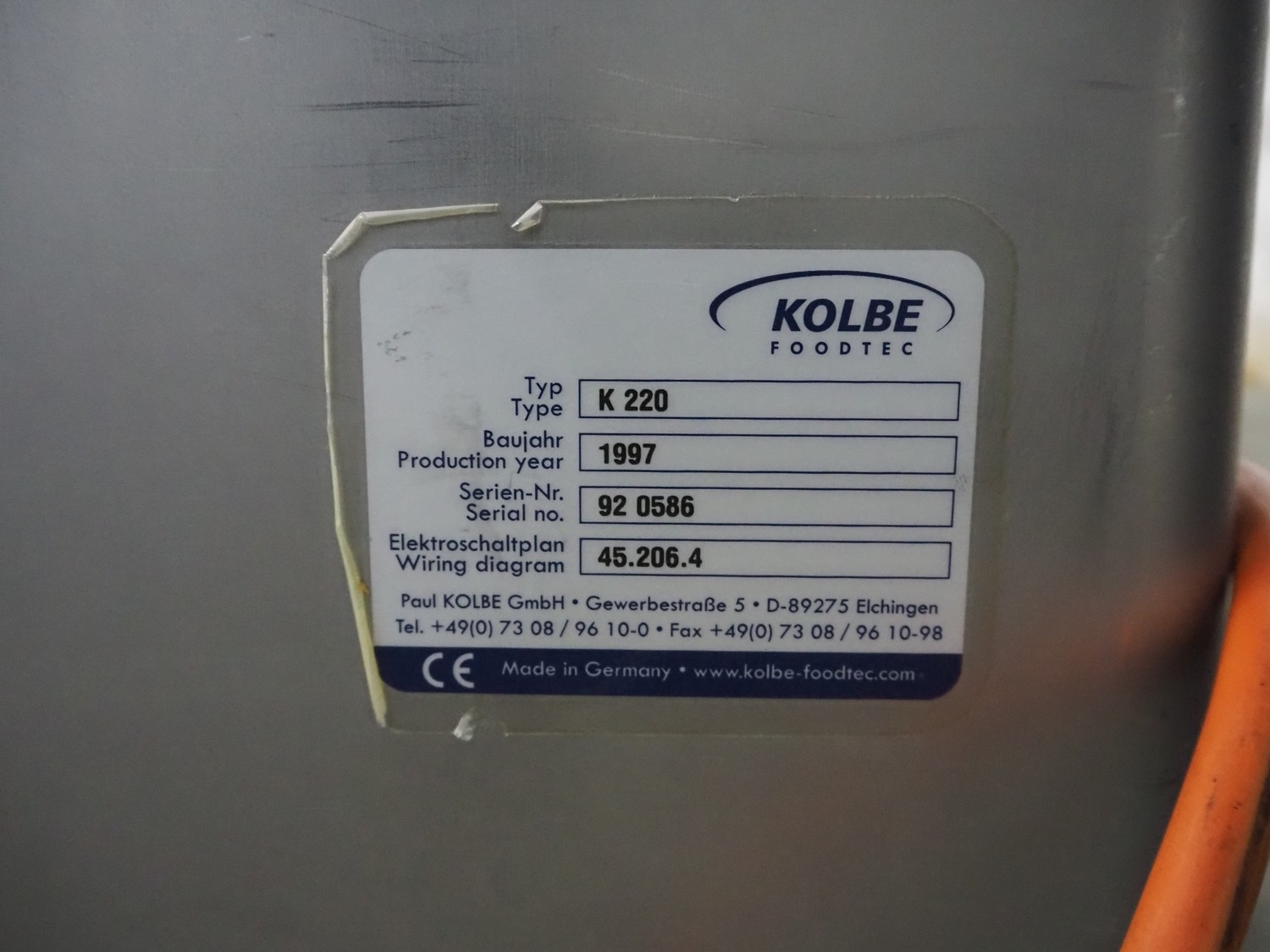 Kolbe s/s bandsaw, type: K 220, serial number: 92 0586, year of construction: 1997, table dimensions: 550 mm x 415 mm, total dimensions: 580 mm x 520 mm x 930 mm.