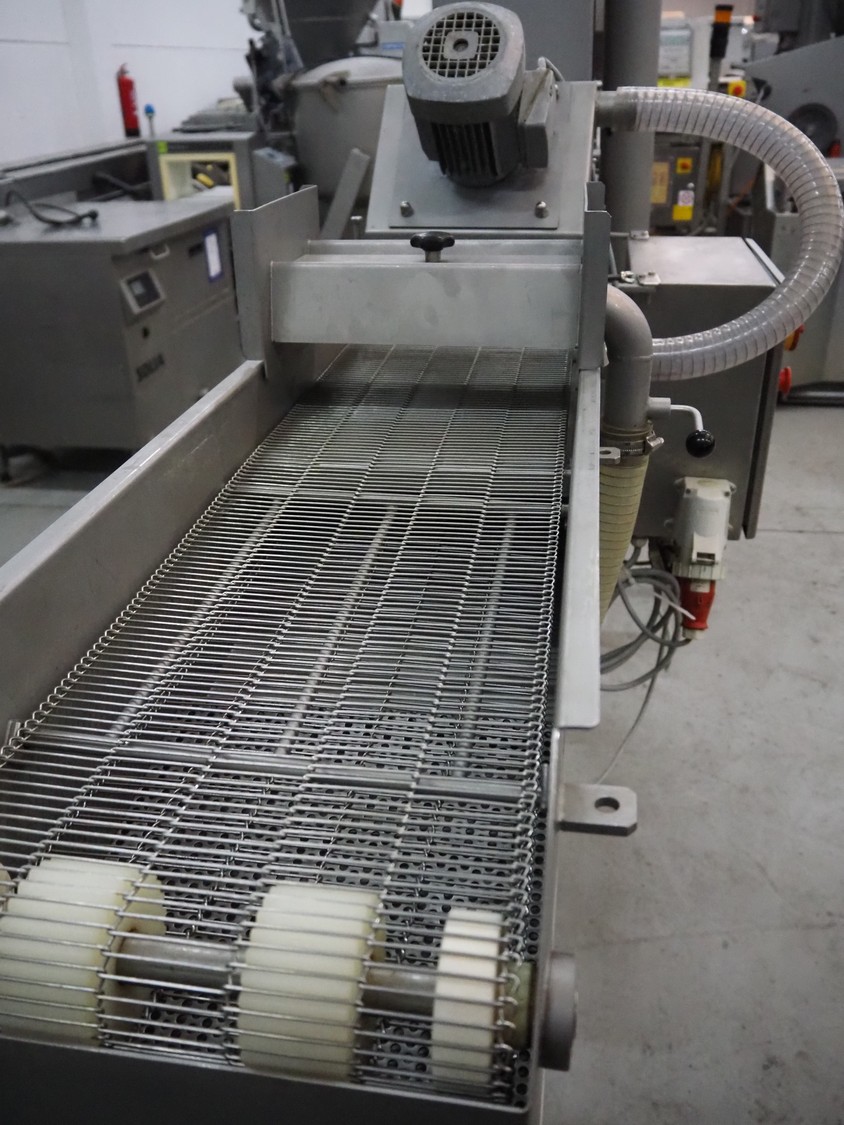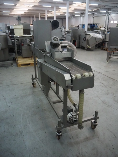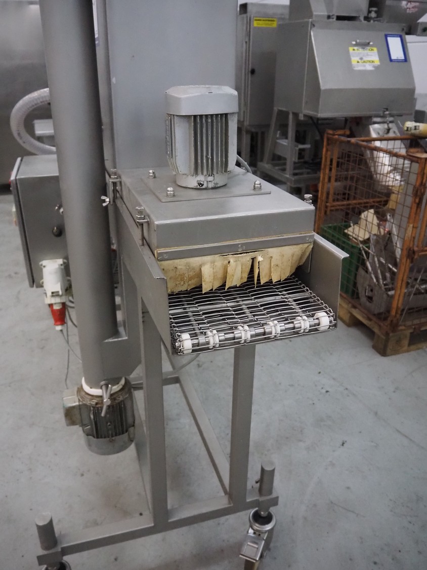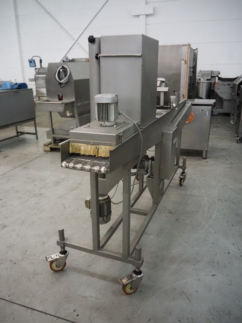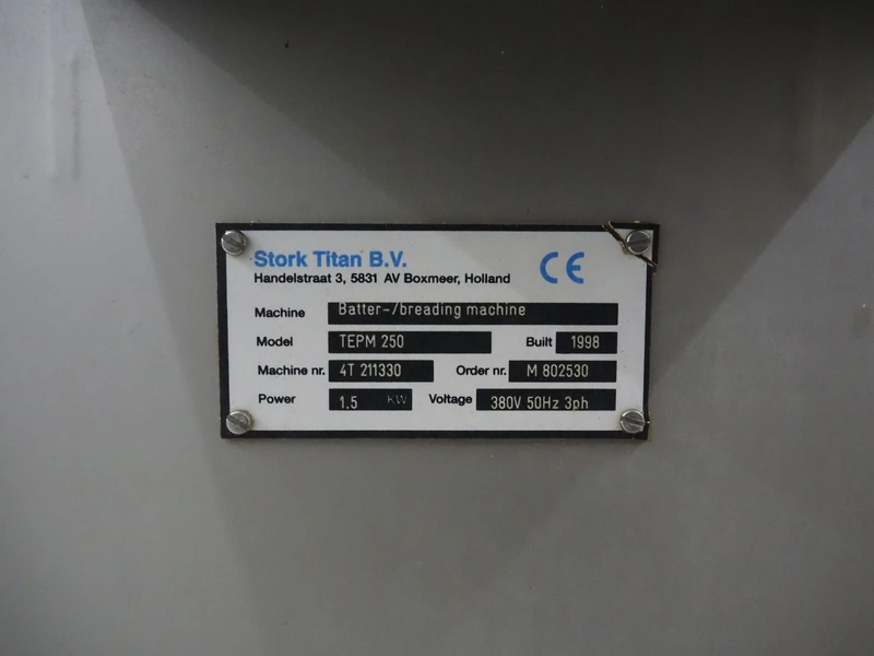 Stork Titan B.V. mobile breading machine, model: TEPM 250, machine number: 4T 211330, year of construction: 1998, 380 V, 3 Ph, 50 Hz, 1.5 kW, s/s mesh belt, belt width: 250 mm, total dimensions: 2500 mm x 700 mm x 1670 mm.
