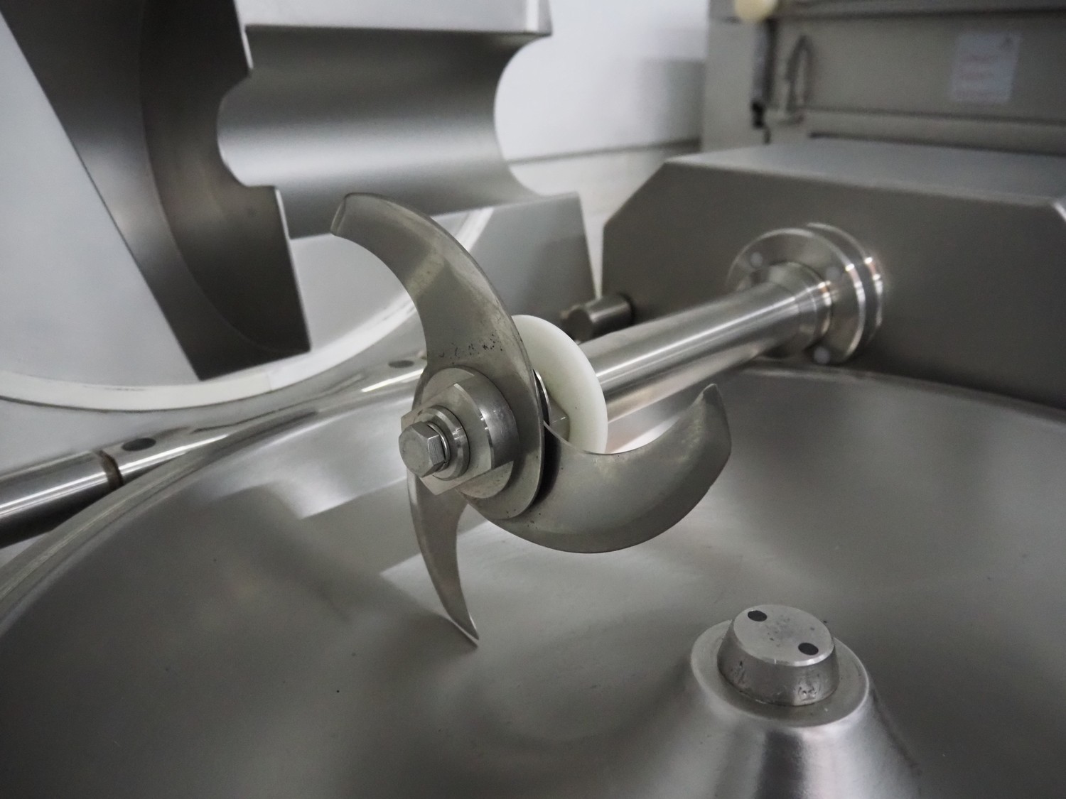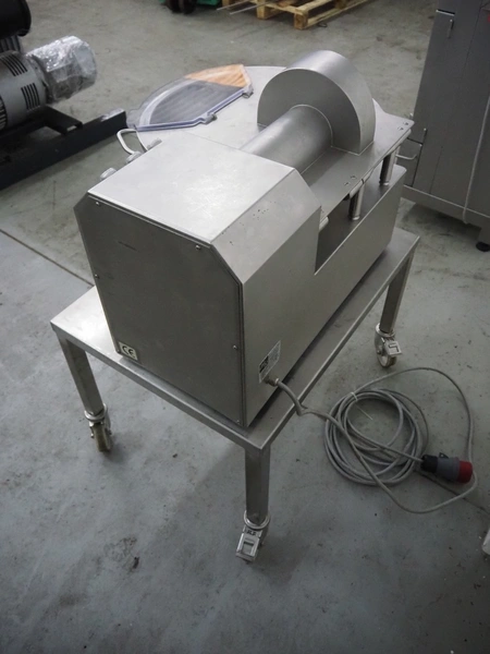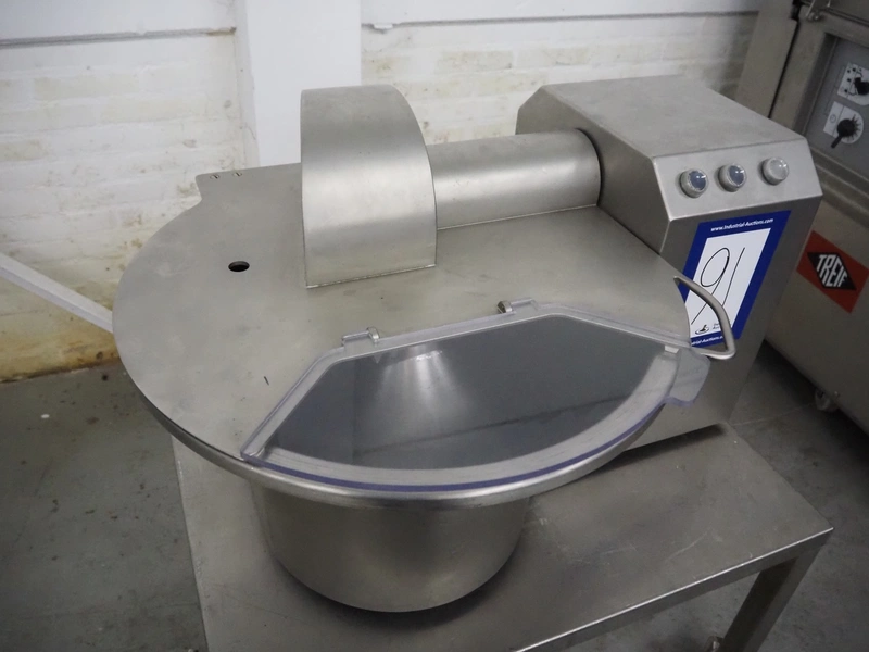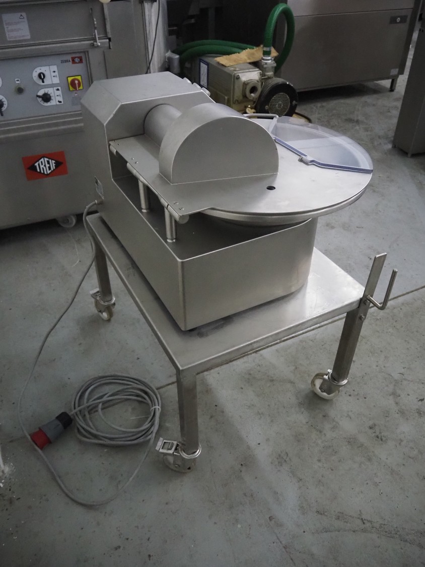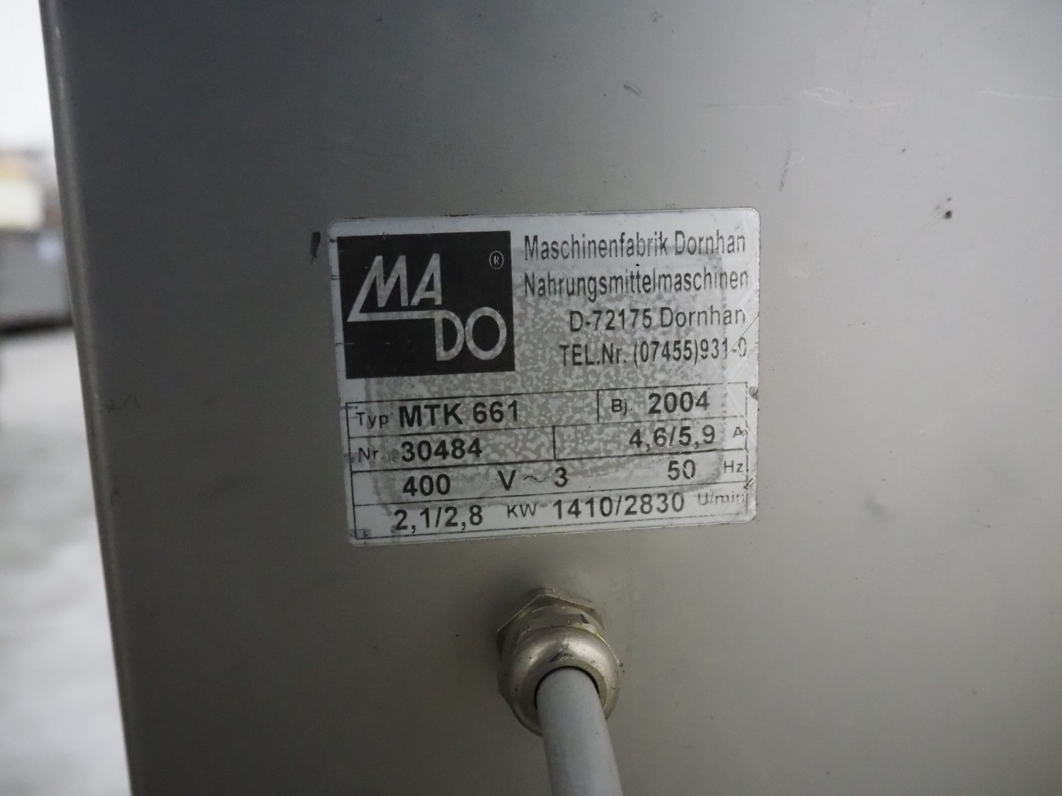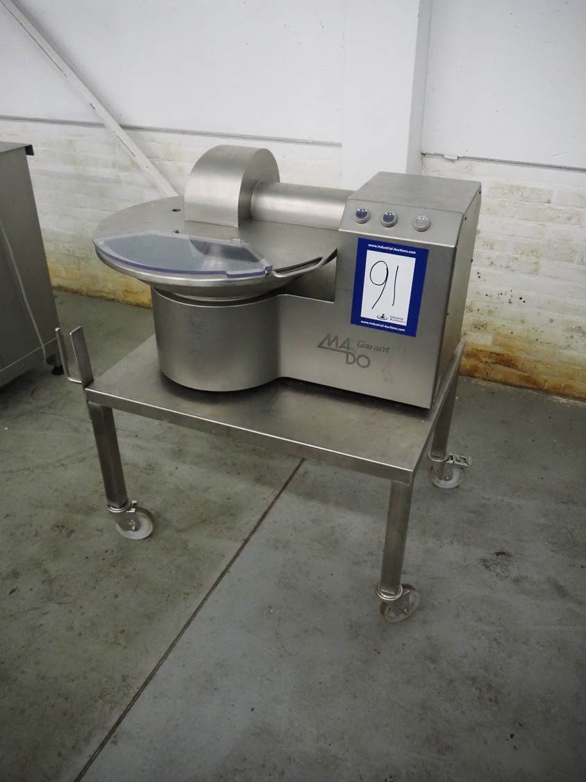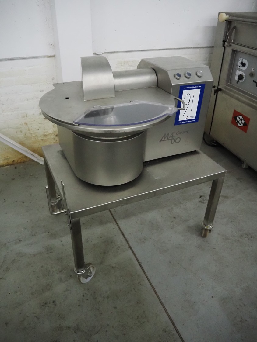 Mado cutter on s/s mobile table, type: MTK 661, number: 30484, year of construction: 2004, 400 V, 3 Ph, 50 Hz, 4.6/5.9 A, 2.1/2.8 kW, s/s bowl, diameter bowl: 500 mm, total dimensions: 900 mm x 600 mm x 1050 mm.