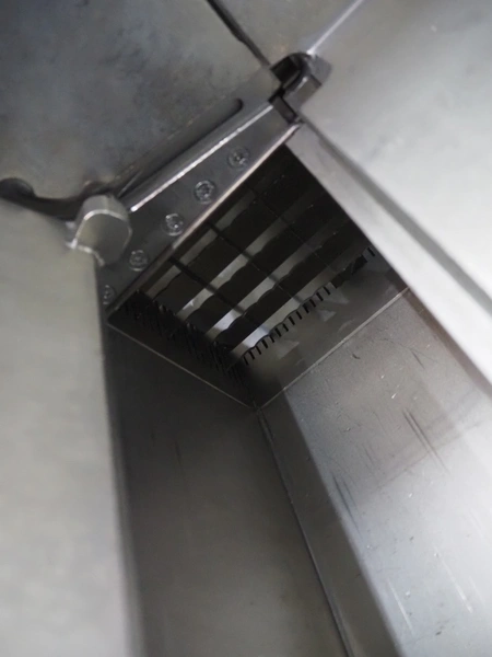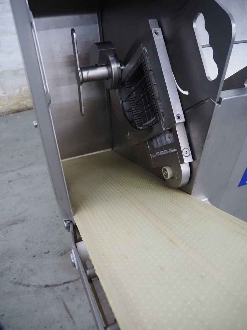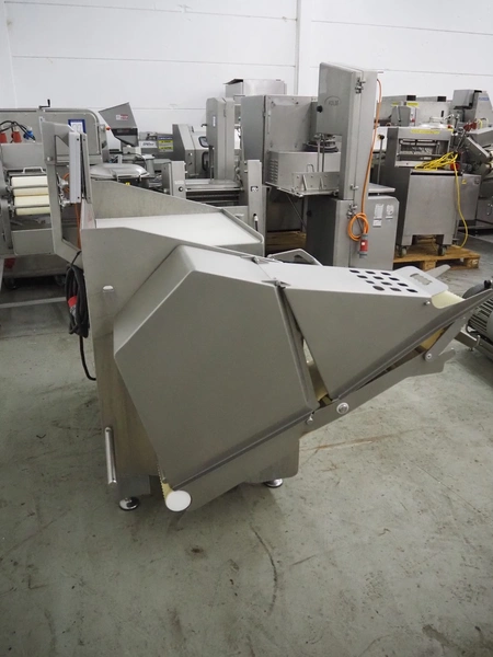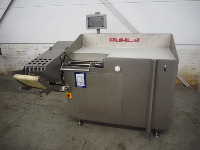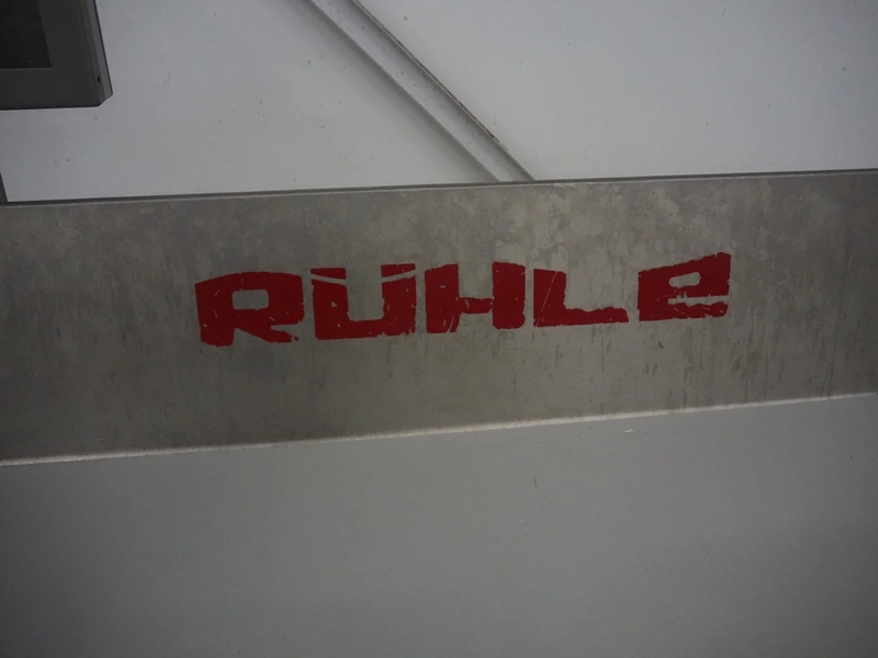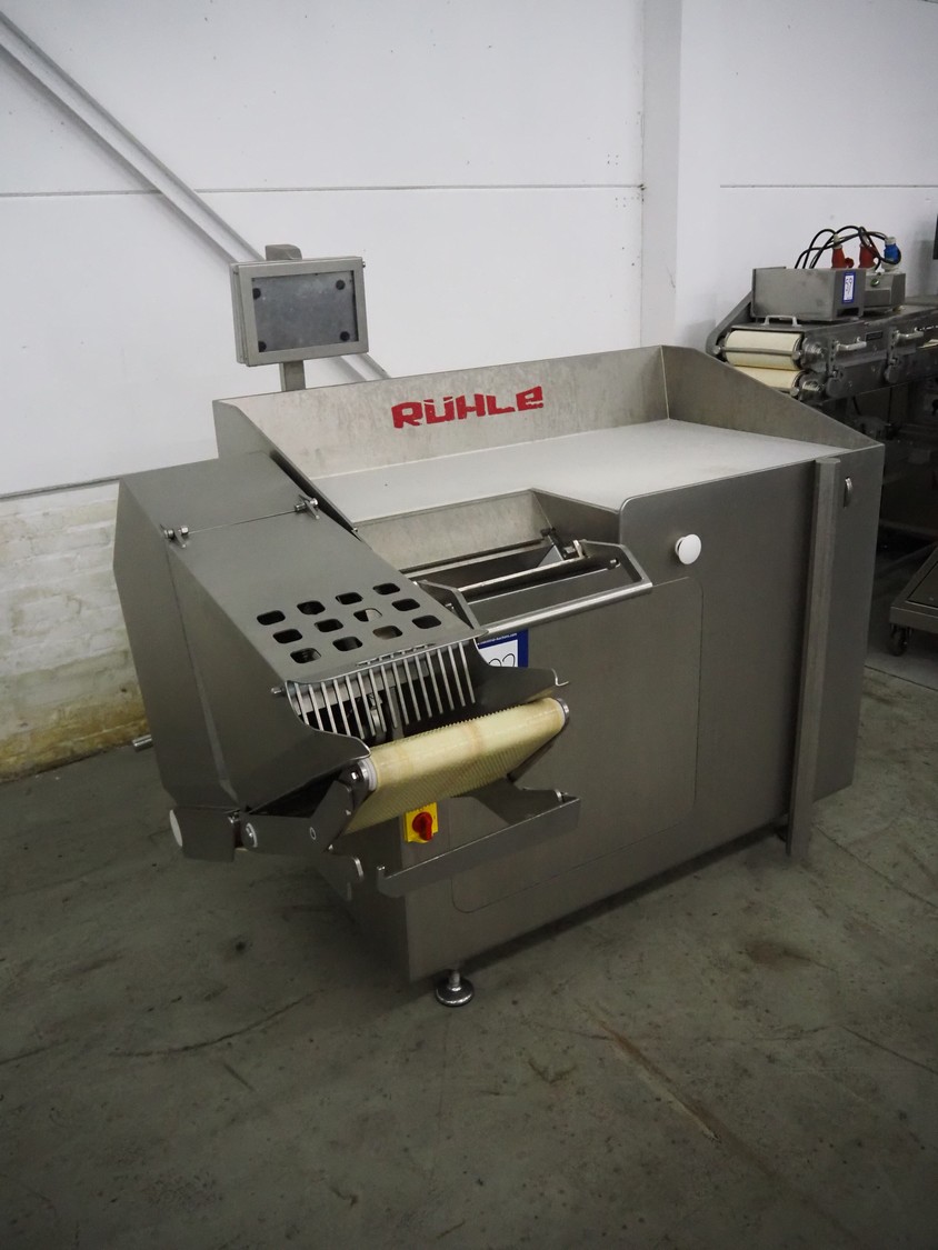 Rühle dicer, model: SR 2 BiTurbo, year of construction: 2018, dimensions chamber: 120 mm x 120 mm x 450 mm, plastic outfeed belt, belt width: 260 mm, total dimensions: 1600 mm x 1400 mm x 1500 mm. Including Doogee tablet.