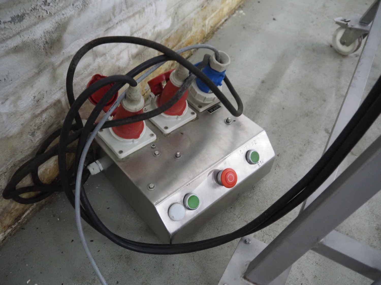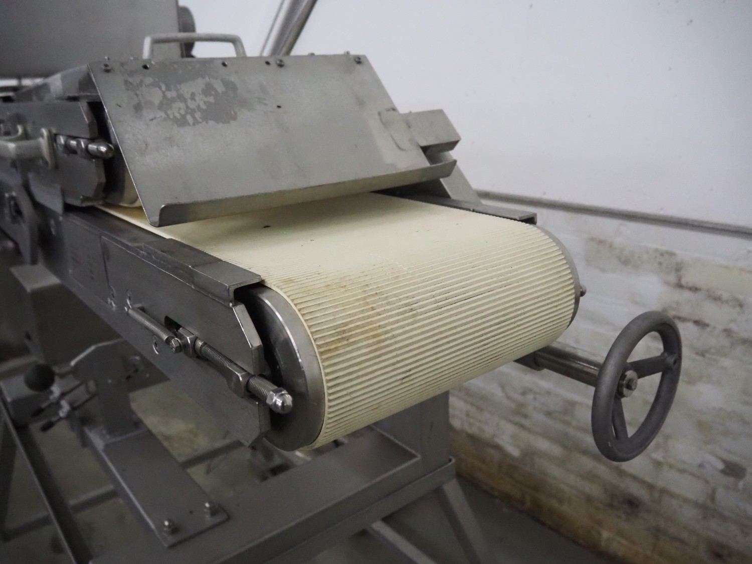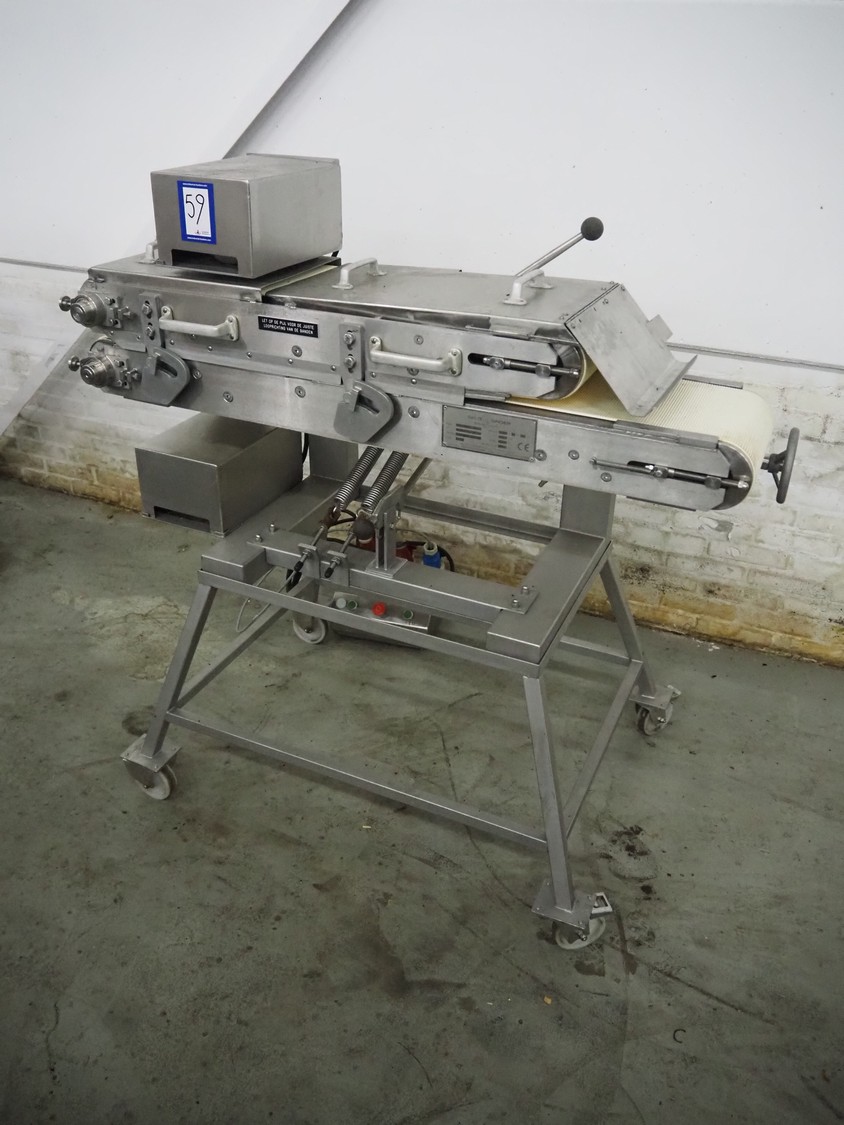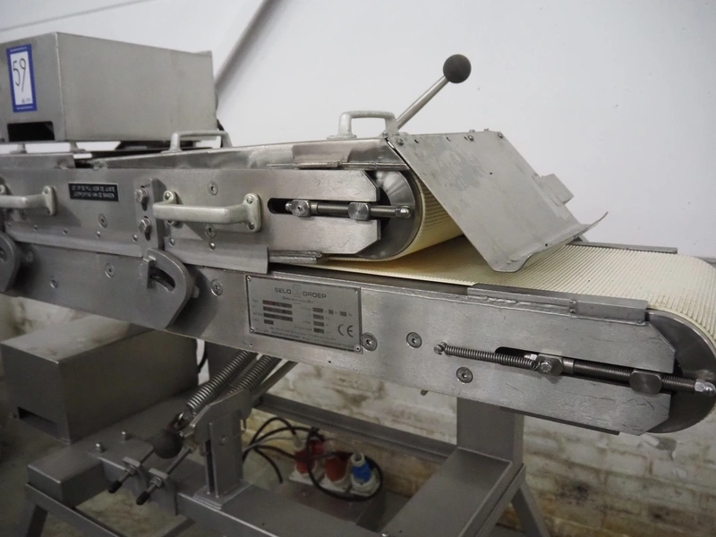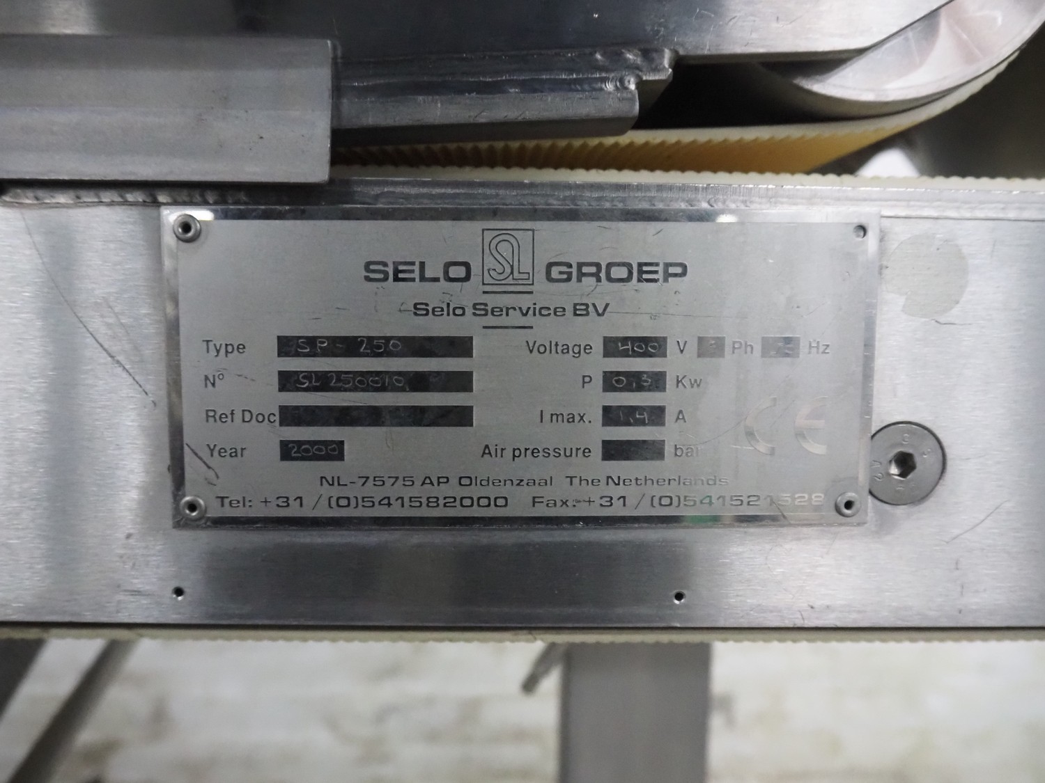 Selo Group mobile flattener, type: SP-250, number: SL250010, year of construction: 2000, 400 V, 3 Ph, 50 Hz, 1.4 A, 0.3 kW, coat belt, belt width: 250 mm, total dimensions: 1400 mm x 800 mm x 1400 mm.