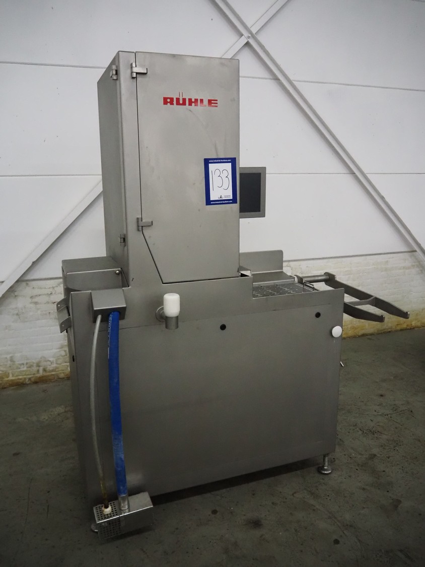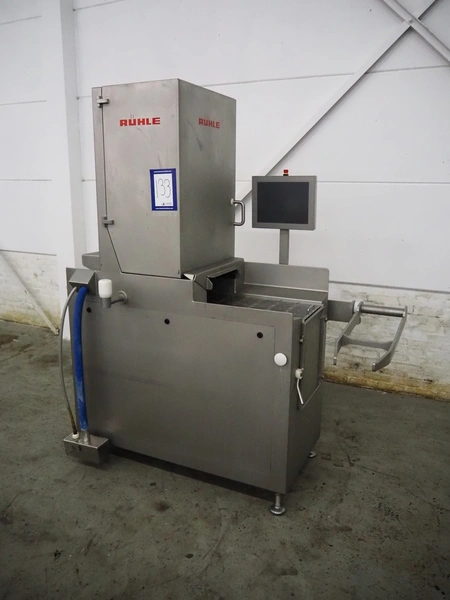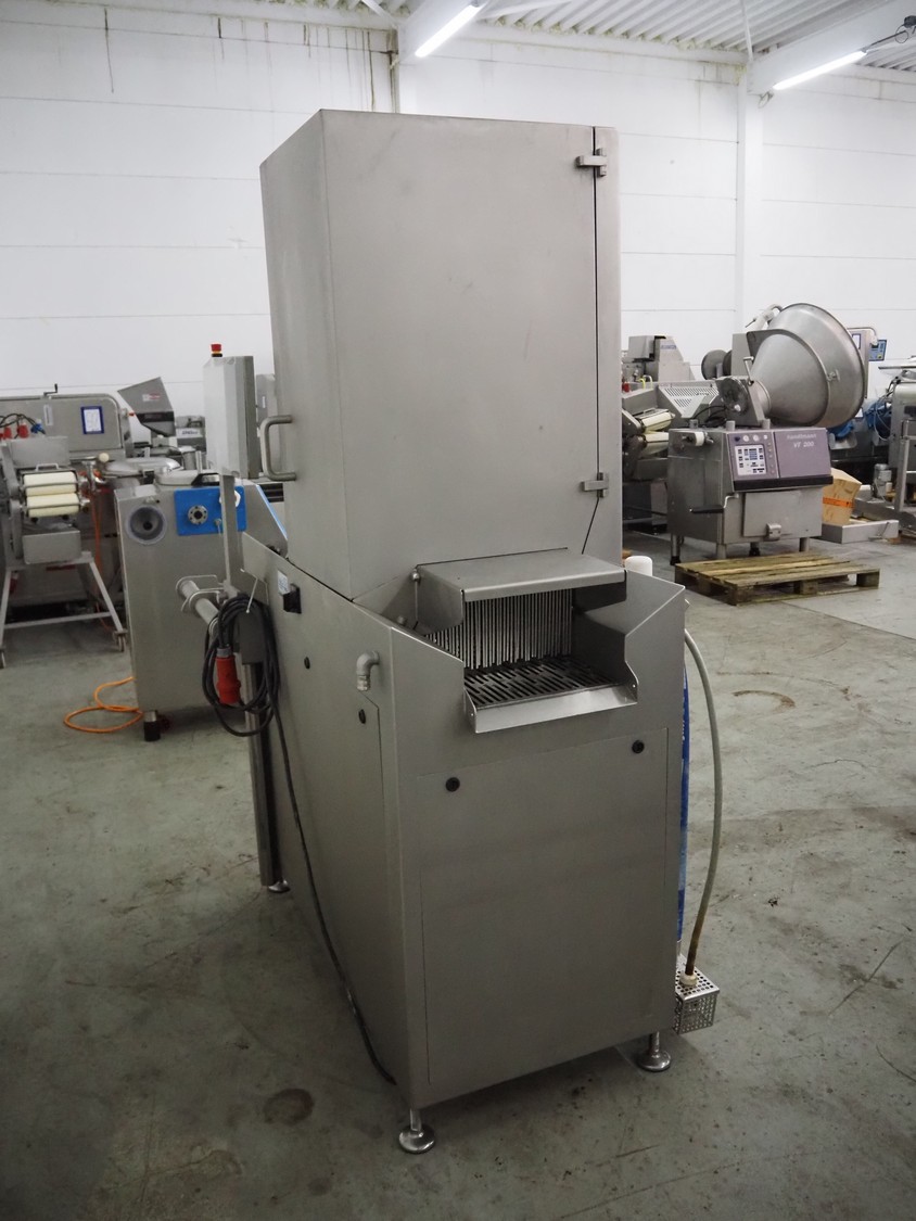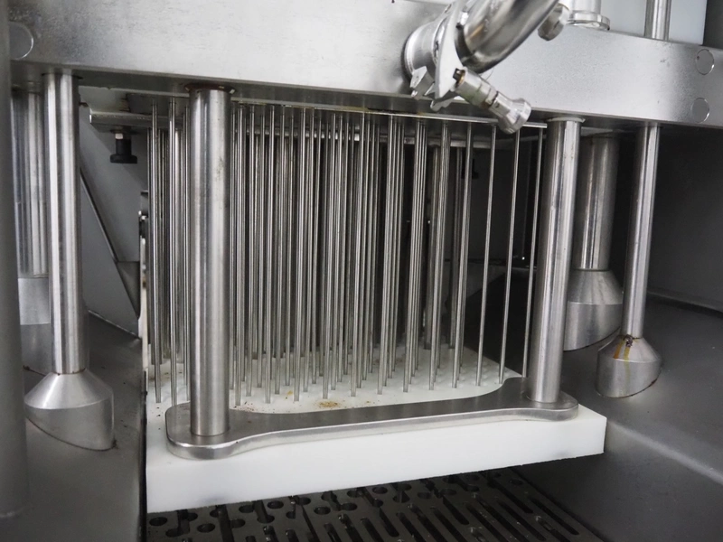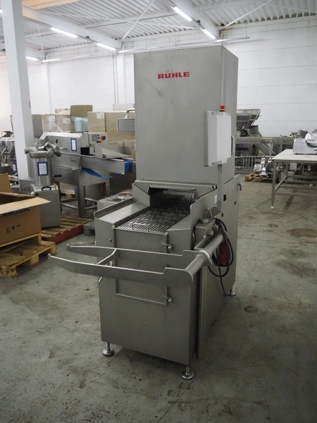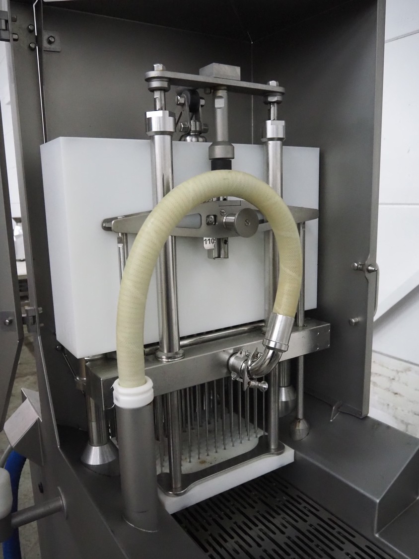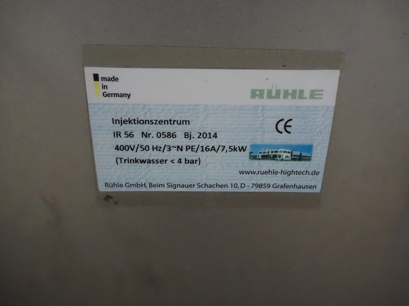 Rühle injector with lifter for E2 crates, type: IR 56, number: 0586, year of construction: 2014, 400 V, 3 Ph, 50 Hz, 7.5 kW, 16 A, 56 needles, s/s walking beam, width: 350 mm, clearance: 350 mm x 170 mm, total dimensions: 1800 mm x 1000 mm x 2050 mm.