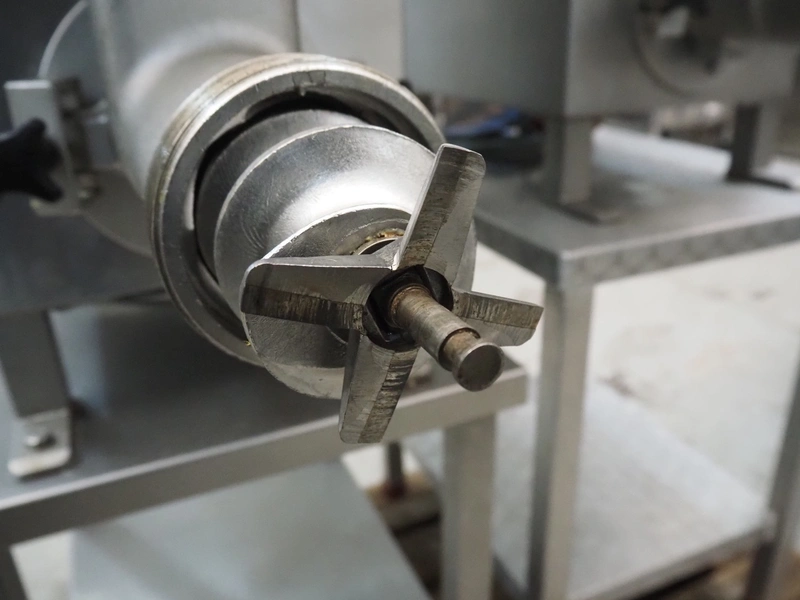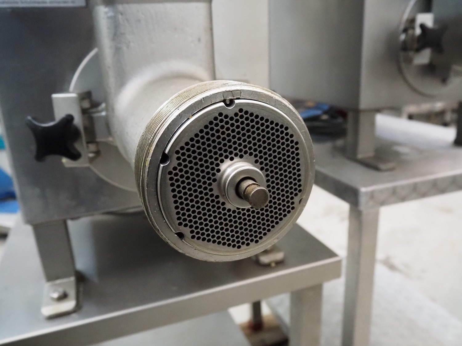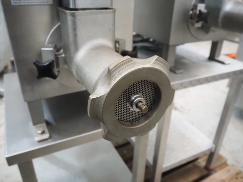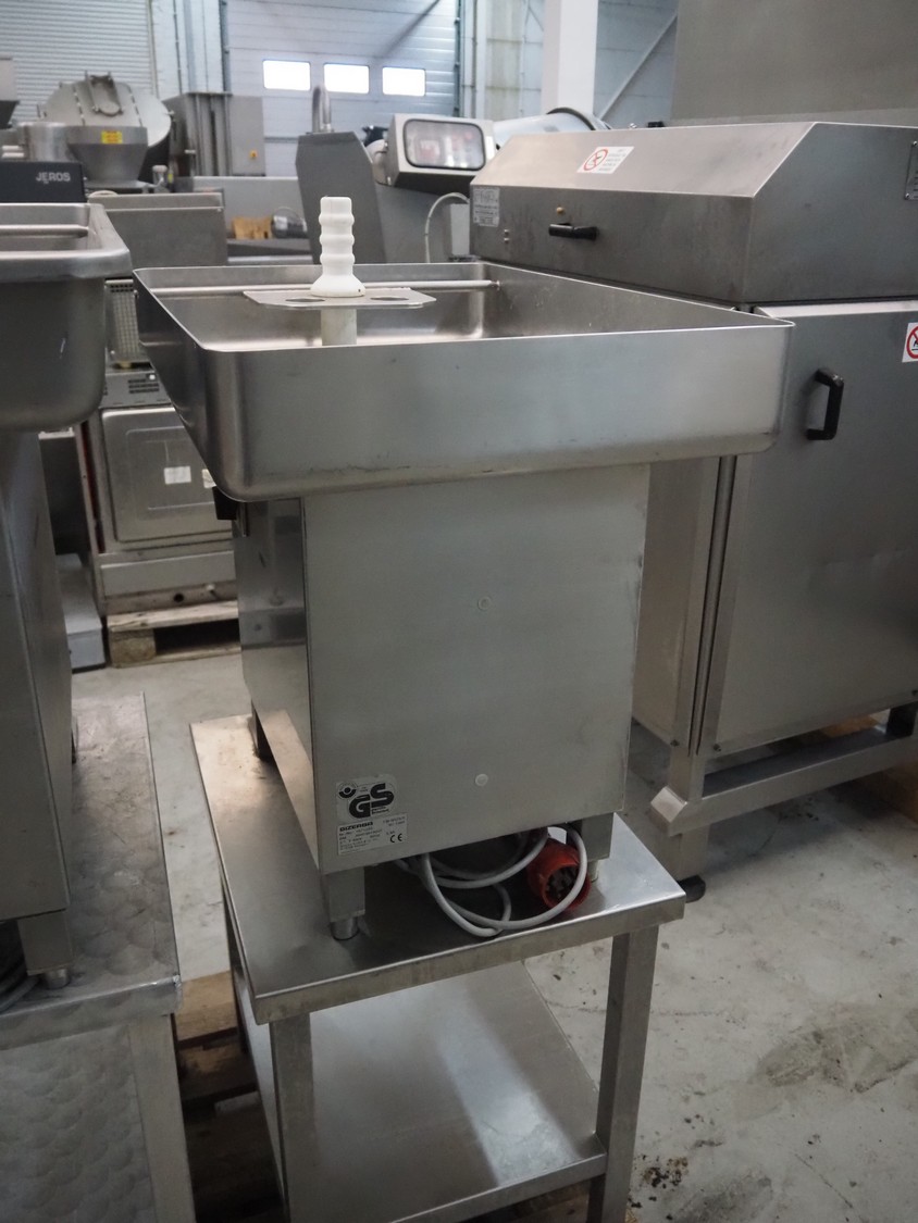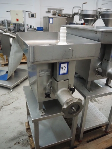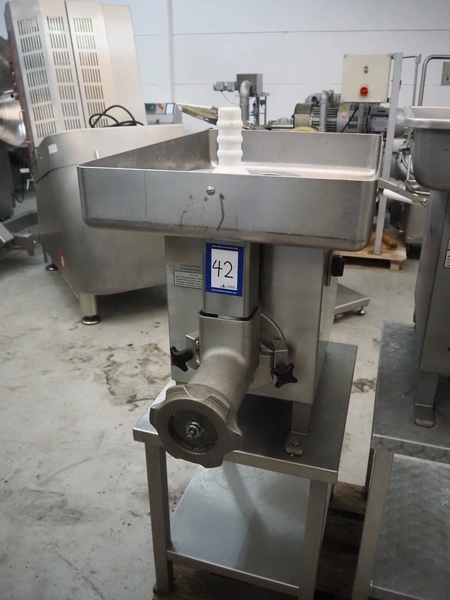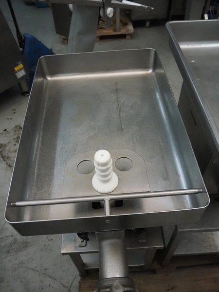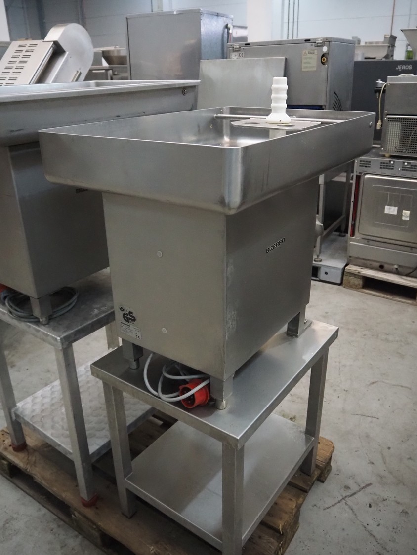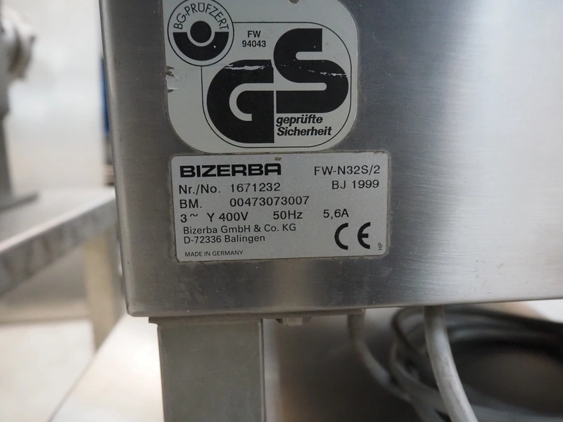 Bizerba grinder on s/s table, model: FW-N32S/2, number: 1671232, year of construction: 1999, 400 V, 3 Ph, 50 Hz, 5.6 A, diameter plate: 98 mm, total dimensions Bizerba: 880 mm x 520 mm x 650 mm, dimensions table: 600 mm x 500 mm x 620 mm.
