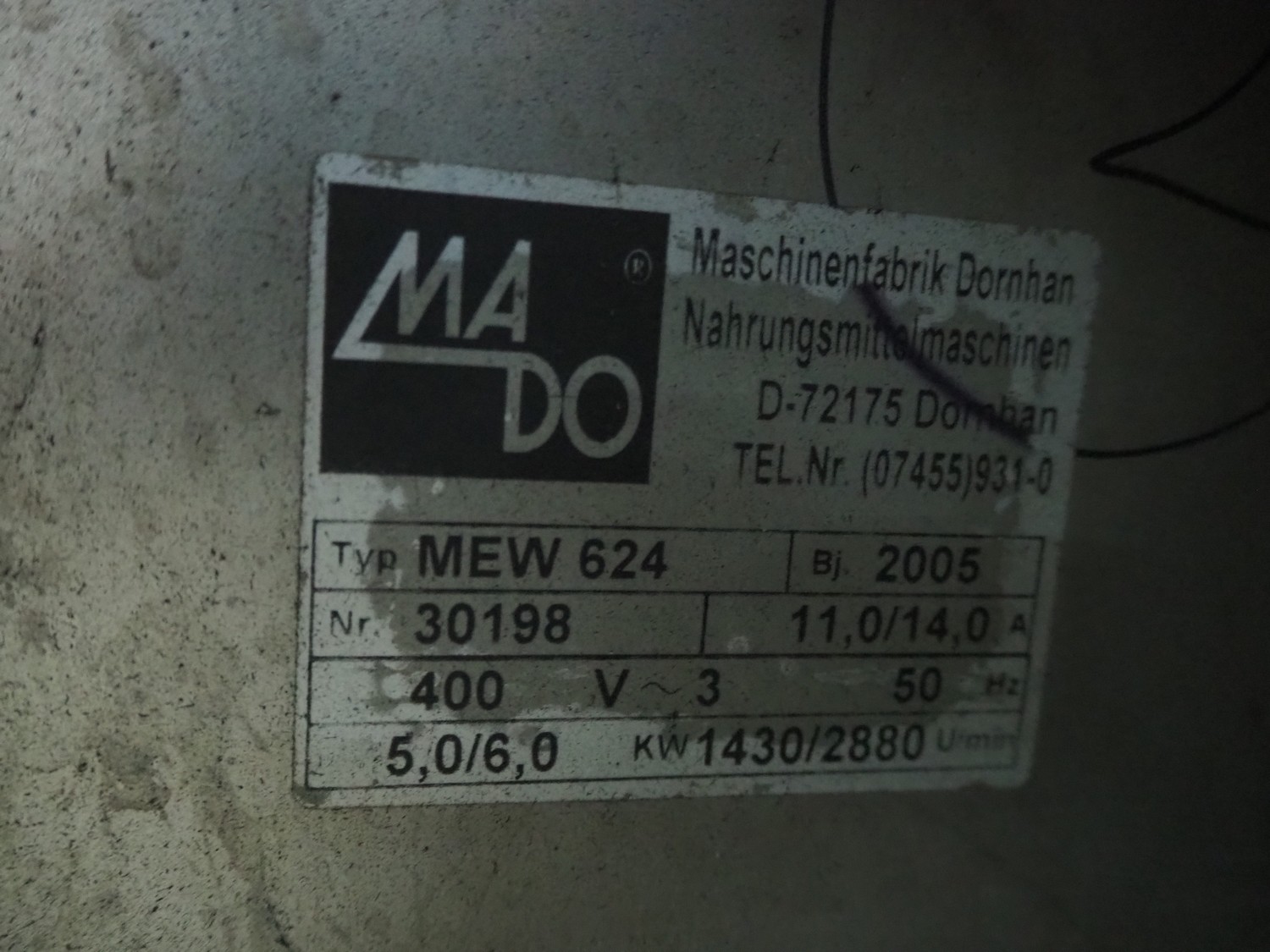 Mado grinder, model: MEW 624 Optimo 2, serial number: 30198, year of construction: 2005, 400 V, 3 Ph, 50 Hz, 11/14 A, 5/6 kW, diameter plate: 114 mm, total dimensions: 1100 mm x 600 mm x 1300 mm.