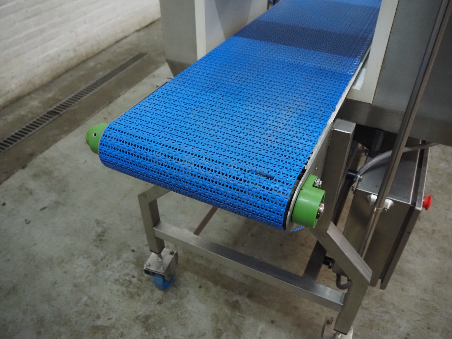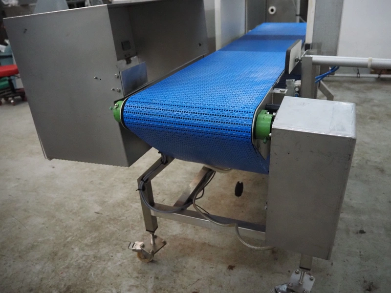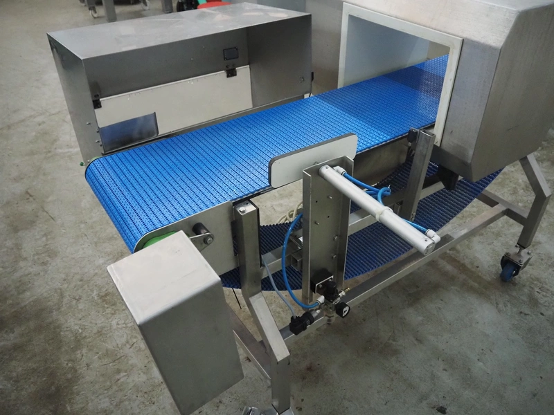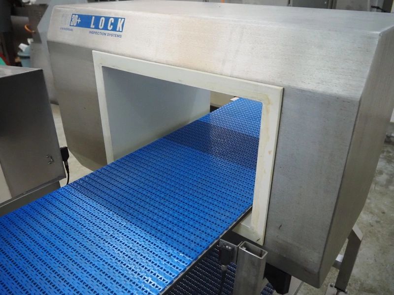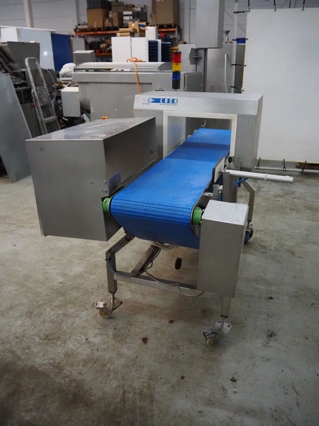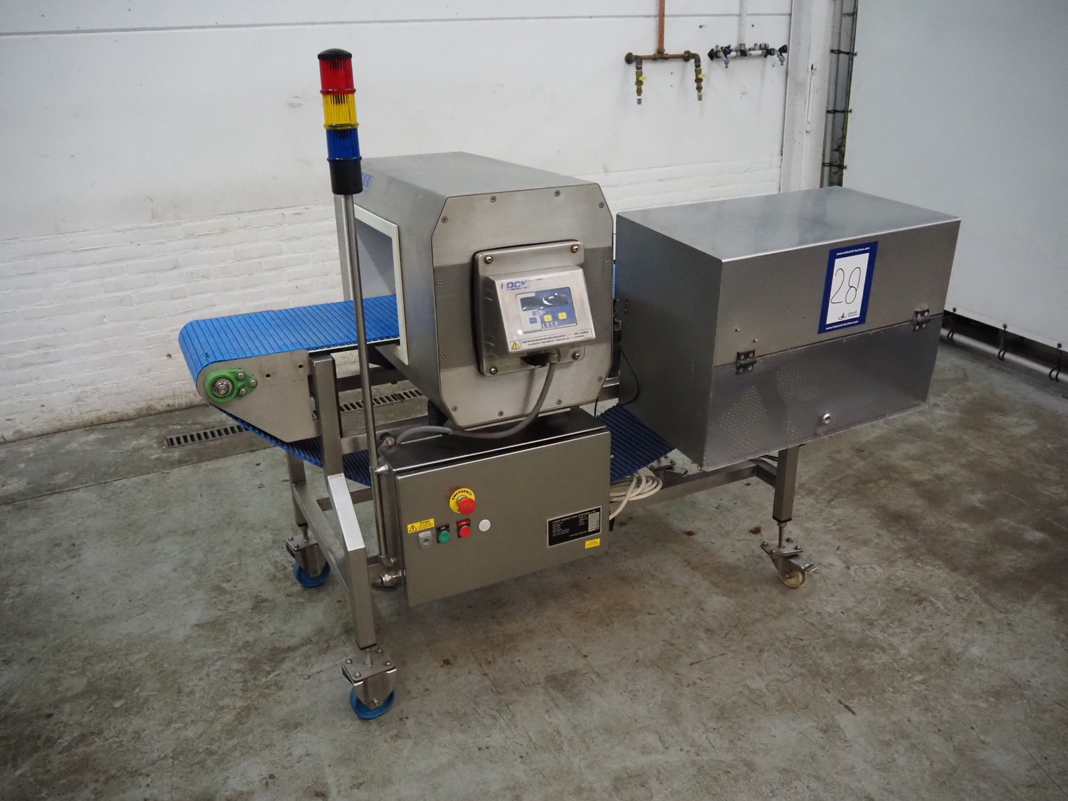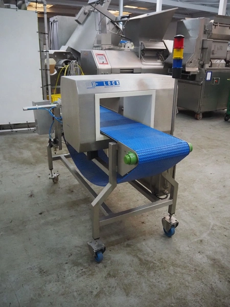Lock Inspection Systems Ltd. mobile metal detector with rejector, model: MET30+, serial number: 5342611, year of construction: 2013, 230 V, 1 Ph, 50 Hz, 0.7 A, 5.5 bar, plastic mesh belt, belt width: 350 mm, clearance: 400 mm x 225 mm, total dimensions: 1850 mm x 1300 mm x 1550 mm.