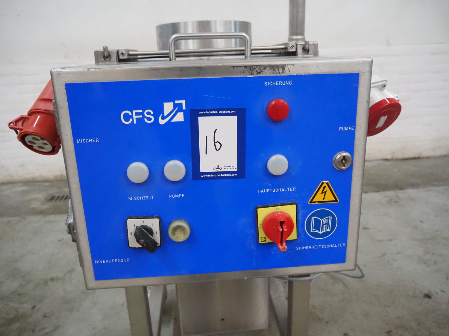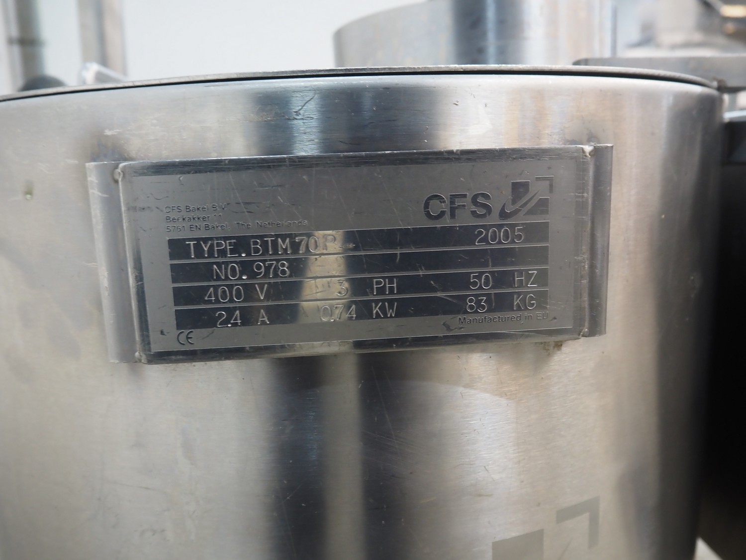 CFS mobile batter mixer, type: BTM70P, serial number: 978, year of construction: 2005, 400 V, 3 Ph, 50 Hz, 2.4 A, 0.74 kW, weight: 83 kg, volume: 70 liter, total dimensions: 840 mm x 750 mm x 1180 mm.
