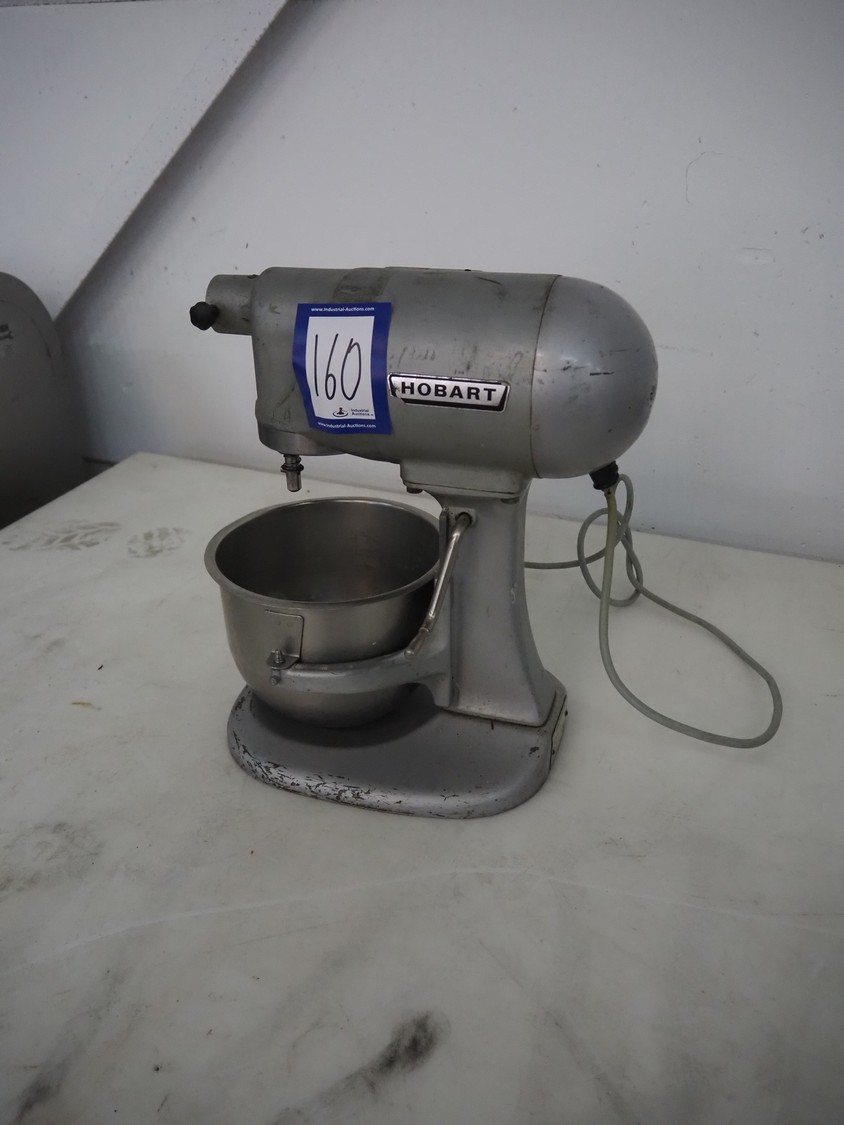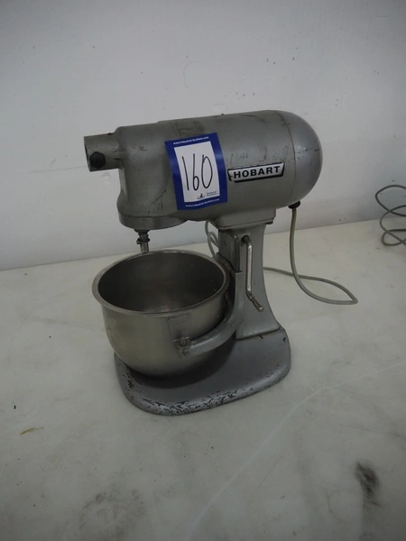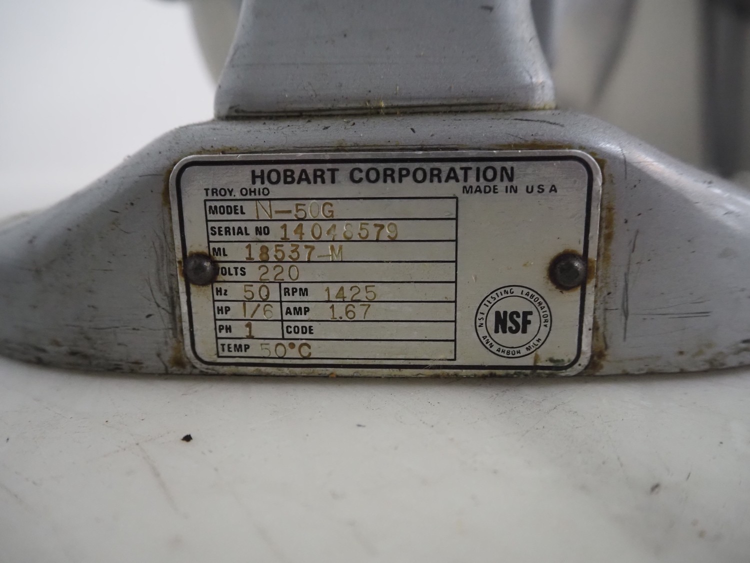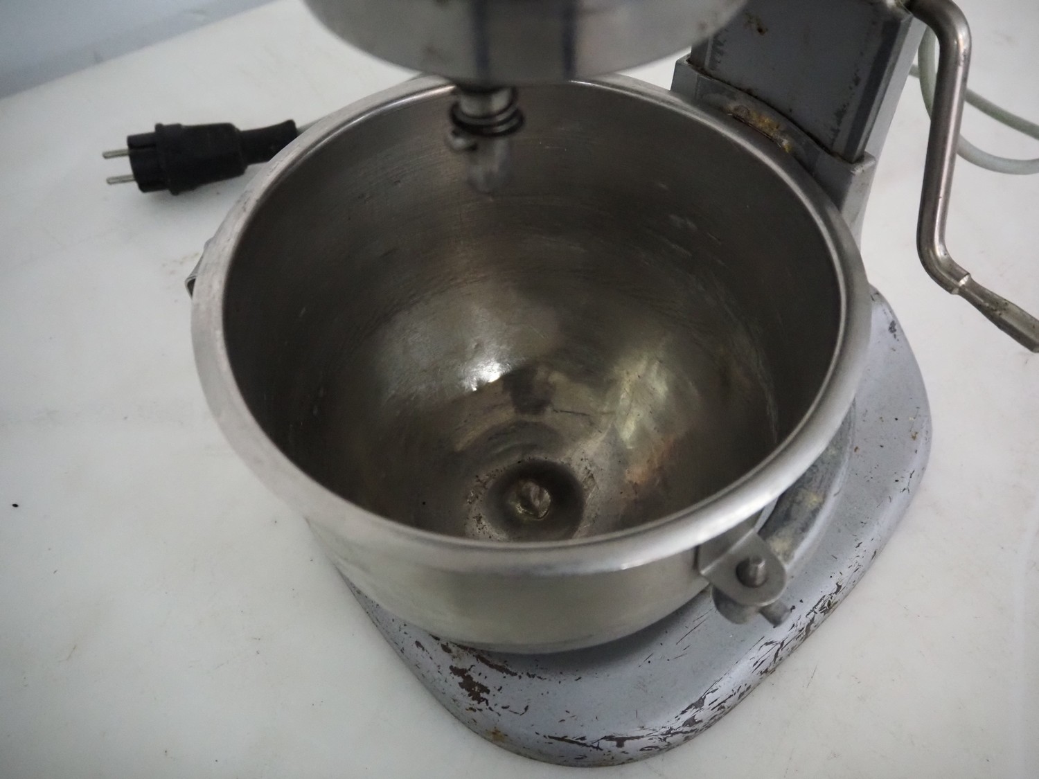 Hobart mixer, model: N-50G, serial number: 14048579, 220 V, 1 Ph, 50 hz, 1.67 A, s/s bowl, dimensions bowl: Ø 200 mm x 170 mm, total dimensions: 350 mm x 250 mm x 430 mm. Including flat beater, hook and whisk.
