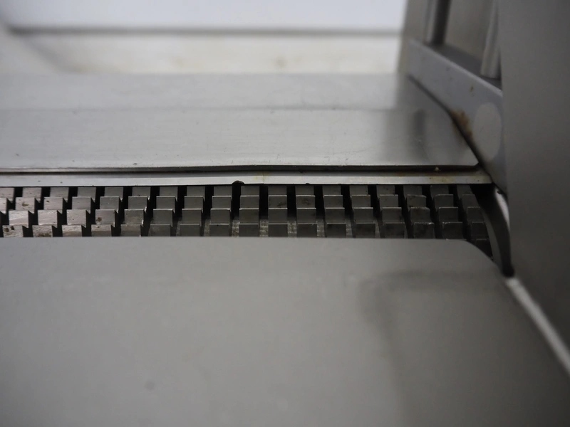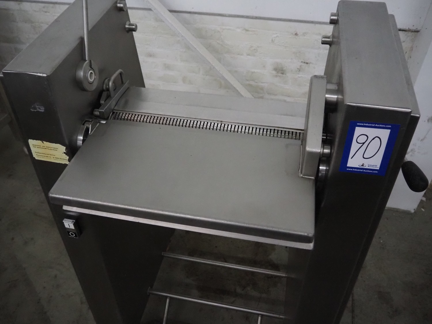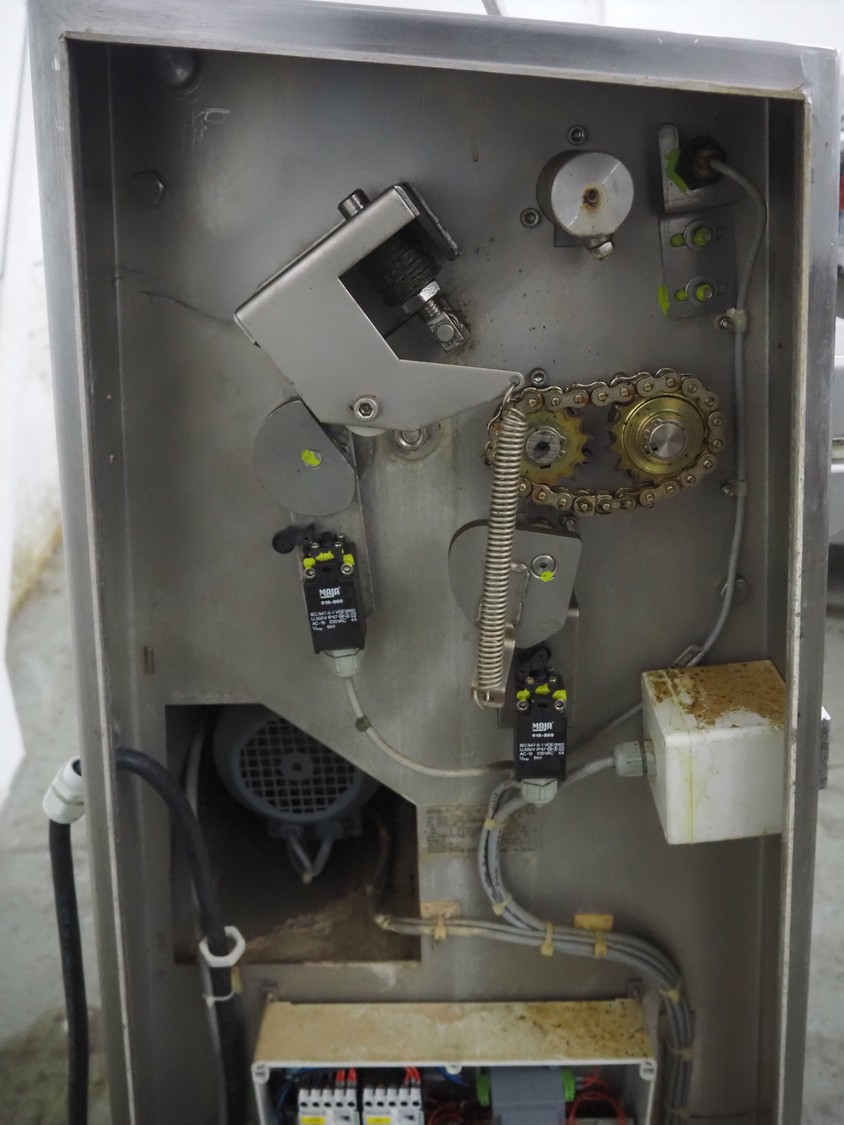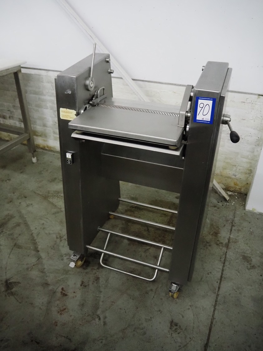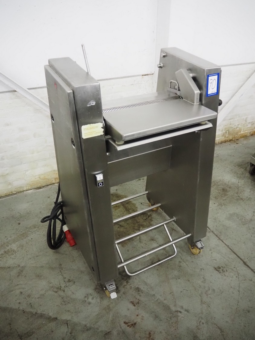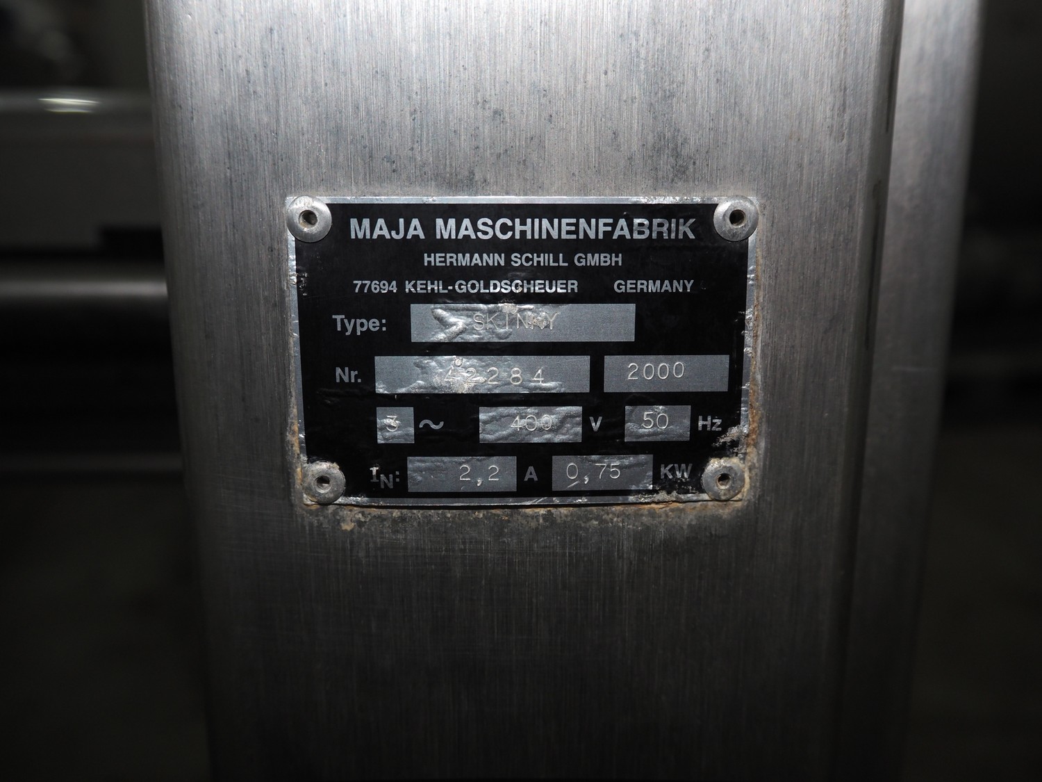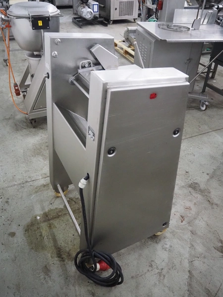 Maja-Maschinenfabrik mobile skinning machine, type: Skinny, serial number: 42284, year of construction: 2000, 400 V, 3 Ph, 50 Hz, 2.2 A, 0.75 kW, working width: 425 mm, total dimensions: 830 mm x 600 mm x 1200 mm.